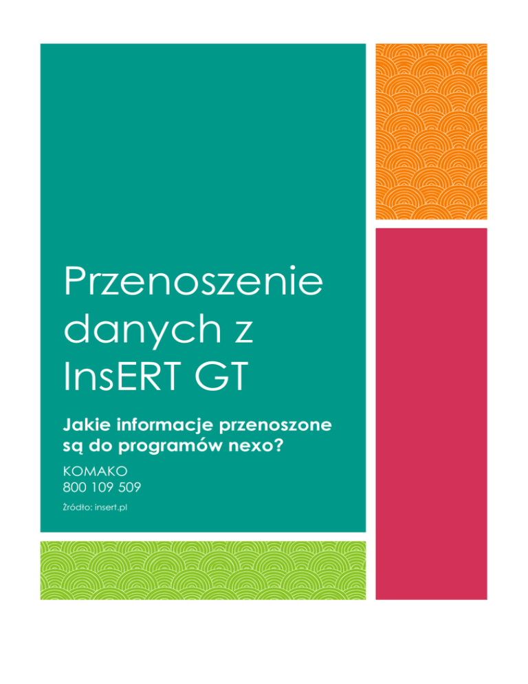 Przenoszenie danych z InsERT GT Jakie informacje przenoszone są do programów nexo? KOMAKO 800 109 509 Żródło: insert.pl Przenoszenie danych z InsERT GT System InsERT nexo przewiduje kontynuowanie pracy rozpoczętej w innym systemie. Zawiera on mechanizm pozwalający na przeniesienie danych z InsERT GT, mikroSubiekta dla Windows lub wskazanego katalogu z odpowiednio skonstruowanymi plikami XML, zawierającymi informacje do przeniesienia. Przeniesienie danych to jeden z etapów tworzenia nowego podmiotu, dostępne z poziomu Kreatora wdrożeniowego dowolnego z produktów linii InsERT nexo. Dane mogą być przeniesione jedną operacją z systemu z linii InsERT GT na dowolny produkt z linii InsERT nexo. Przeniesienie może być również dokonane oddzielnie z poszczególnych programów, np. w sytuacji, gdy dane firmy przechowywane są w oddzielnych podmiotach np. przez Subiekta GT i Rachmistrza GT. Przy przenoszeniu danych istotne jest działanie obu systemów: dotychczasowego (GT) i nowego (nexo). W InsERT nexo dane są zapamiętywane i przetwarzane w inny sposób, niż było to w systemach starszych. W szczególności dotyczy to zapisu i przeliczania dokumentów handlowych i magazynowych oraz liczenia kosztów w Subiekcie nexo. Z tego względu nie ma możliwości przeniesienia dokumentów. Na życzenie użytkownika InsERT nexo tworzy jedynie bilans otwarcia w postaci inwentaryzacji, do której trafiają dane zgodne z zestawieniem Remanent na dzień bieżący. Podobnie jest z innymi danymi typu ewidencjonowane dokumenty, także z programów księgowych. Tego typu dane przenoszone są bilansowo. Wyjątkiem są rozrachunki, które są przenoszone w zakresie, w jakim pozostały nierozliczone. Autoryzowany Partner InsERT Informacje przenoszone do Subiekta nexo: kartoteka towarów, usług, kompletów i opakowań zwrotnych; kartoteka kontrahentów; słowniki (grupy i cechy kontrahentów i towarów, kasy, magazyny, państwa, użytkownicy, rabaty, stawki VAT, formy płatności, waluty, województwa, rachunki bankowe); dane podmiotu; parametry kontrahentów, towarów; parametry numerowania dokumentów kasowych, handlowych i magazynowych oraz raportów kasowych; parametry dotyczące pracy z dokumentami finansowymi; nierozliczone rozrachunki; salda początkowe kas gotówkowych i rachunków bankowych; cenniki i ceny; inwentaryzacja. Autoryzowany Partner InsERT Informacje przenoszone do Rachmistrza nexo: okresy obrachunkowe (definicje okresów zawierające się we wskazanym roku kalendarzowym); kartoteka kontrahentów; kartoteka wspólników (tylko wspólnicy o niezerowym udziale); kartoteka instytucji; kartoteka pojazdów; kartoteka środków trwałych (tylko te środki, które na początku przenoszonego okresu są użytkowane); kartoteka WNiP; remanenty (jako sumaryczne wartości); parametry pracy (parametry księgi przychodów i rozchodów, parametry ewidencji VAT, okresy obrachunkowe, parametry ewidencji przychodów, parametry kontrahentów); parametry dotyczące pracy z dokumentami finansowymi; parametry numerowania dokumentów kasowych oraz raportów kasowych; nierozliczone rozrachunki; salda początkowe kas gotówkowych i rachunków bankowych; słowniki (miejsca użytkowania, kasy, grupy towarów, grupy kontrahentów, państwa, województwa, użytkownicy, waluty, rachunki bankowe); kartoteka pracowników; umowy o pracę; dane wdrożeniowe wyliczone indywidualnie dla każdego pracownika; OT dla środków trwałych; Autoryzowany Partner InsERT Informacje przenoszone do Rewizora nexo: okres obrachunkowy (wskazany); kartoteka kontrahentów; kartoteka wspólników (tylko wspólnicy o niezerowym udziale); kartoteka instytucji; kartoteka pojazdów; kartoteka środków trwałych (tylko te środki, które na początku przenoszonego okresu są użytkowane); kartoteka WNiP; remanenty (jako sumaryczne wartości); parametry pracy (parametry księgi przychodów i rozchodów, parametry ewidencji VAT, okresy obrachunkowe, parametry ewidencji przychodów, parametry kontrahentów); parametry dotyczące pracy z dokumentami finansowymi; parametry numerowania dokumentów kasowych oraz raportów kasowych; nierozliczone rozrachunki; salda początkowe kas gotówkowych i rachunków bankowych; słowniki (miejsca użytkowania, kasy, grupy towarów, grupy kontrahentów, państwa, województwa, użytkownicy, waluty, rachunki bankowe); kartoteka pracowników; umowy o pracę; dane wdrożeniowe wyliczone indywidualnie dla każdego pracownika; OT dla środków trwałych; plan kont; kartoteki księgowe (dostawcy, odbiorcy, pracownicy, wspólnicy, urzędy skarbowe, oddziały ZUS, środki trwałe, wartości niematerialne i prawne, inne instytucje, fundusze promocji, rachunki bankowe, kasy, magazyny, miejsca powstawania kosztów, grupy towarowe, kartoteki filtrowane). Autoryzowany Partner InsERT Informacje przenoszone do Gratyfikanta nexo: Uwaga! Należy pamiętać, że z mikroGratyfikanta GT dane kadrowe przenoszone są do Rachmistrza GT lub Rewizora GT, a z Gratyfikanta GT tylko do Gratyfikanta nexo. dane firmy; dane pracowników; umowy o pracę; umowy cywilnoprawne; parametry; słowniki; wynagrodzenia - przenoszone do danych wdrożeniowych poszczególnych pracowników; pełne dane pracowników wraz z danymi o członkach rodziny, poprzednim zatrudnieniu, badaniach, kursach BHP, uprawnieniach itp., dane o dochodach z innych źródeł czy o kosztach autorskich uwzględnionych przez innych płatników; pełne dane umów o pracę; pełne dane umów cywilnoprawnych; system wynagrodzeń – składniki płacowe oraz definicje list płac (należy pamiętać, że w Gratyfikancie GT i Gratyfikancie nexo struktury danych nie są takie same, co może spowodować, że system wynagrodzeń w Gratyfikancie nexo nie będzie merytorycznie odpowiadał temu, co zdefiniowano w Gratyfikancie GT); wszystkie słowniki, które są wykorzystywane w ewidencji osobowej i w umowach; wynagrodzenia – wypłaty i rachunki do umów cywilnoprawnych są przeno