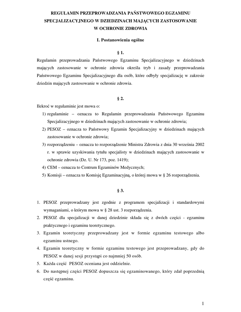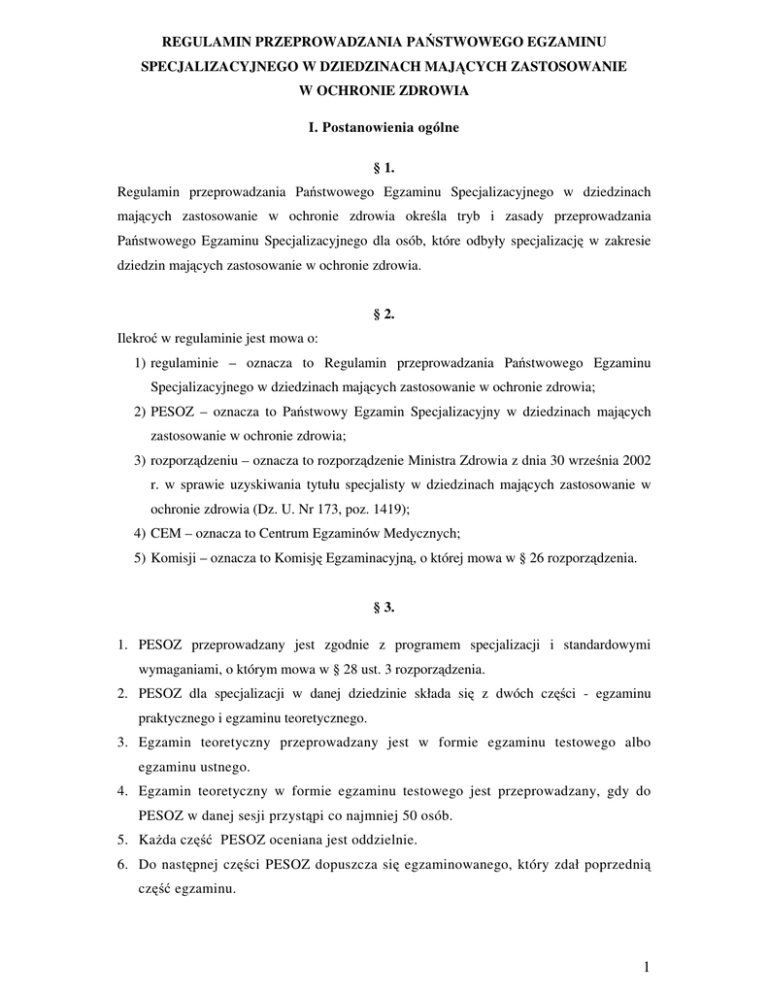 REGULAMIN PRZEPROWADZANIA PAŃSTWOWEGO EGZAMINU SPECJALIZACYJNEGO W DZIEDZINACH MAJĄCYCH ZASTOSOWANIE W OCHRONIE ZDROWIA I. Postanowienia ogólne § 1. Regulamin przeprowadzania Państwowego Egzaminu Specjalizacyjnego w dziedzinach mających zastosowanie w ochronie zdrowia określa tryb i zasady przeprowadzania Państwowego Egzaminu Specjalizacyjnego dla osób, które odbyły specjalizację w zakresie dziedzin mających zastosowanie w ochronie zdrowia. § 2. Ilekroć w regulaminie jest mowa o: 1) regulaminie – oznacza to Regulamin przeprowadzania Państwowego Egzaminu Specjalizacyjnego w dziedzinach mających zastosowanie w ochronie zdrowia; 2) PESOZ – oznacza to Państwowy Egzamin Specjalizacyjny w dziedzinach mających zastosowanie w ochronie zdrowia; 3) rozporządzeniu – oznacza to rozporządzenie Ministra Zdrowia z dnia 30 września 2002 r. w sprawie uzyskiwania tytułu specjalisty w dziedzinach mających zastosowanie w ochronie zdrowia (Dz. U. Nr 173, poz. 1419); 4) CEM – oznacza to Centrum Egzaminów Medycznych; 5) Komisji – oznacza to Komisję Egzaminacyjną, o której mowa w § 26 rozporządzenia. § 3. 1. PESOZ przeprowadzany jest zgodnie z programem specjalizacji i standardowymi wymaganiami, o którym mowa w § 28 ust. 3 rozporządzenia. 2. PESOZ dla specjalizacji w danej dziedzinie składa się z dwóch części - egzaminu praktycznego i egzaminu teoretycznego. 3. Egzamin teoretyczny przeprowadzany jest w formie egzaminu testowego albo egzaminu ustnego. 4. Egzamin teoretyczny w formie egzaminu testowego jest przeprowadzany, gdy do PESOZ w danej sesji przystąpi co najmniej 50 osób. 5. Każda część PESOZ oceniana jest oddzielnie. 6. Do następnej części PESOZ dopuszcza się egzaminowanego, który zdał poprzednią część egzaminu. 1 § 4. 1. PESOZ dla każdej specjalności organizuje CEM. 2. PESOZ przeprowadza Komisja, której przewodniczy Przewodniczący. 3. W przypadkach uzasadnionych dużą liczbą osób przystępujących do egzaminu, z Komisji mogą być wyłonione Zespoły, z zachowaniem zasad określonych w § 26 ust. 4 i 5 rozporządzenia. Pracom Zespołu przewodniczy Przewodniczący Zespołu. 4. Przewodniczącego Komisji oraz jej członków powołuje i odwołuje Minister właściwy do spraw zdrowia na wniosek Dyrektora CEM i po zaopiniowaniu przez właściwe dla danej specjalizacji towarzystwa naukowe i stowarzyszenia zawodowe. 5. W przypadku, o którym mowa w ust. 3, Przewodniczących Zespołów oraz członków poszczególnych Zespołów, każdorazowo powołuje i odwołuje Dyrektor CEM. § 5. Osoby przystępujące do PESOZ obowiązane są podporządkować się poleceniom członków Komisji albo Zespołu. § 6. Nadzór nad prawidłowym przebiegiem PESOZ sprawuje Komisja albo Zespół. II. Egzamin praktyczny § 7. 1. Miejsca i terminy egzaminu praktycznego ustala Komisja w porozumieniu z Dyrektorem CEM. 2. Egzamin praktyczny przeprowadza się w zakresie i w sposób uwzględniający specyfikę danej specjalizacji. § 8. 1. Zadanie egzaminacyjne oceniane jest odrębnie przez każdego członka Komisji albo Zespołu, posługującego się następującą skalą ocen: 5 (bardzo dobry), 4,5 (dobry plus), 4 (dobry), 3,5 (dostateczny plus), 3 (dostateczny), 2 (niedostateczny). 2. Ocena niedostateczna zostaje postawiona, gdy za taką opowie się, co najmniej połowa składu Komisji albo Zespołu. 3. Oceną końcową egzaminu praktycznego jest ocena wynikająca ze średniej arytmetycznej ocen cząstkowych, uzyskanych od poszczególnych członków Komisji albo Zespołu, zaokrąglona do oceny, o której mowa w ust. 1 według zasad określonych w załączniku nr 1 do regulaminu. 2 III. Egzamin testowy § 9. 1. Egzamin testowy jest sprawdzianem wiadomości teoretycznych z zakresu objętego programem danej specjalizacji. 2. Egzamin testowy składa się z zestawu 50 zadań, opracowanego w formie książeczki testowej. 3. Egzamin testowy dla danej specjalności jest przeprowadzany dla wszystkich egzaminowanych w skali kraju jednocześnie, w terminie i miejscu ustalonym przez Komisję w porozumieniu z Dyrektorem CEM. § 10. 1. W dniu egzaminu testowego CEM dostarcza na miejsce egzaminu książeczki testowe. 2. Książeczki testowe są zabezpieczone w sposób uniemożliwiający zapoznanie się z ich treścią przez osoby nieuprawnione. 3. Usunięcie zabezpieczeń i ujawnienie treści zadań egzaminu testowego następuje w sali egzaminacyjnej po rozpoczęciu egzaminu testowego w obecności osób egzaminowanych. 4. W trakcie egzaminu testowego zabronione jest wynoszenie lub usuwanie w inny sposób książeczek testowych z sali egzaminacyjnej. § 11. 1. Karta testowa oznaczona jest numerem kodowym osoby egzaminowanej, nadanym przez CEM, po ustaleniu przez Komisję listy osób dopuszczonych do PESOZ. 2. W celu zapewnienia anonimowości osób egzaminowanych, zabrania się wpisywania na karcie testowej danych umożliwiających bezpośrednią identyfikację osoby egzaminowanej. 3. Dla potwierdzenia identyfikacji osoby przystępującej do egzaminu testowego, jest ona zobowiązana nanieść własnoręcznie na czystej stronie karty testowej napis o treści: „Centrum Egzaminów Medycznych - egzamin testowy z ..................................................... ”. (określenie specjalności) 4. Karta testowa jest jedynym dokumentem przeznaczonym do udzielania odpowiedzi w trakcie egzaminu testowego. 5. Karta testowa powinna być wypełniana za pomocą ołówka. Dopuszcza się jednak wypełnienie jej za pomocą długopisu. W tym jednak przypadku osoba egzaminowana traci możliwość dokonywania korekty uprzednio zaznaczonych odpowiedzi. 3 § 12. 1. Wchodzenie osób przystępujących do egzaminu testowego do sali egzaminacyjnej następuje w ciągu 30 min. przed rozpoczęciem egzaminu. 2. W momencie wejścia osoby przystępującej do egzaminu testowego do sali egzaminacyjnej, członkowie Komisji albo Zespołu na podstawie dokumentu potwierdzającego tożsamość, sprawdzają jej to