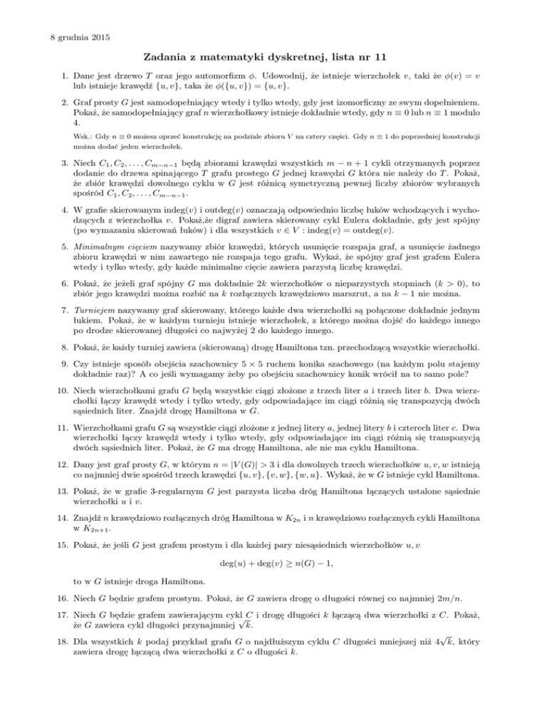 1. Dane jest drzewo T oraz jego automorfizm φ. Udowodnij, że istnieje wierzchołek v, taki że φ(v) = v