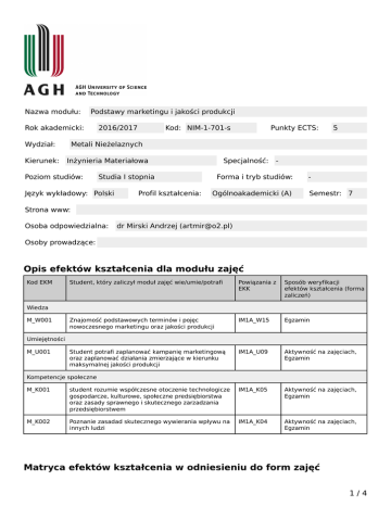 Nazwa modułu: Podstawy marketingu i jakości produkcji Rok akademicki: 2016/2017 Kod: NIM-1-701-s Wydział: Metali Nieżelaznych Kierunek: Inżynieria Materiałowa Poziom studiów: Specjalność: Studia I stopnia Język wykładowy: Polski Profil kształcenia: Punkty ECTS: 5 - Forma i tryb studiów: Ogólnoakademicki (A) Semestr: 7 Strona www: Osoba odpowiedzialna: dr Mirski Andrzej ([email protected]) Osoby prowadzące: Opis efektów kształcenia dla modułu zajęć Kod EKM Student, który zaliczył moduł zajęć wie/umie/potrafi Powiązania z EKK Sposób weryfikacji efektów kształcenia (forma zaliczeń) Znajomość podstawowych terminów i pojęc nowoczesnego marketingu oraz jakości produkcji IM1A_W15 Egzamin Student potrafi zaplanować kampanię marketingową oraz zaplanować działania zmierzające w kierunku maksymalnej jakości produkcji IM1A_U09 Aktywność na zajęciach, Egzamin Wiedza M_W001 Umiejętności M_U001 Kompetencje społeczne M_K001 student rozumie współczesne otoczenie technologicze gospodarcze, kulturowe, społeczne predsiębiorstwa oraz zasady sprawnego i skutecznego zarzadzania przedsiębiorstwem IM1A_K05 Aktywność na zajęciach, Egzamin M_K002 Poznanie zasadad skutecznego wywierania wpływu na innych ludzi IM1A_K04 Aktywność na zajęciach, Egzamin Matryca efektów kształcenia w odniesieniu do form zajęć 1/4 Karta modułu - Podstawy marketingu i jakości produkcji Konwersatori um Zajęcia seminaryjne Zajęcia praktyczne Zajęcia terenowe Zajęcia warsztatowe + - - + - - - - - - - Student potrafi zaplanować kampanię marketingową oraz zaplanować działania zmierzające w kierunku maksymalnej jakości produkcji + - - + - - - - - - - E-learning Ćwiczenia projektowe Znajomość podstawowych terminów i pojęc nowoczesnego marketingu oraz jakości produkcji Inne Ćwiczenia laboratoryjne Forma zajęć Ćwiczenia audytoryjne Student, który zaliczył moduł zajęć wie/umie/potrafi Wykład Kod EKM Wiedza M_W001 Umiejętności M_U001 Kompetencje społeczne M_K001 student rozumie współczesne otoczenie technologicze gospodarcze, kulturowe, społeczne predsiębiorstwa oraz zasady sprawnego i skutecznego zarzadzania przedsiębiorstwem + - - + - - - - - - - M_K002 Poznanie zasadad skutecznego wywierania wpływu na innych ludzi + - - + - - - - - - - Treść modułu zajęć (program wykładów i pozostałych zajęć) Wykład Podstawy marketingu i jakości produkcji Istota marketingu. Marketing mix 2. Potrzeby klienta 3. Segmentacja i grupy docelowe 4. Badania rynkowe marketingowe 5. Produkt 6. Promocja 7. Public relations 8. Marka 9. System identyfikacji wizualnej, typografia 10. Reklama 11. Psychologia reklamy i marketingu 12. Strategia marketingowa 13. Marketing międzynarodowy 14. Zarządzanie jakością 15. Przykłady systemów zarządzania jakością: TQM i Kaizen 2/4 Karta modułu - Podstawy marketingu i jakości produkcji Ćwiczenia projektowe Podstawy marketingu i jakości produkcji Istota marketingu. Marketing mix 2. Potrzeby klienta 3. Segmentacja i grupy docelowe 4. Badania rynkowe marketingowe 5. Produkt 6. Promocja 7. Public relations 8. Marka 9. System identyfikacji wizualnej, typografia 10. Reklama 11. Psychologia reklamy i marketingu 12. Strategia marketingowa 13. Marketing międzynarodowy 14. Zarządzanie jakością 15. Przykłady systemów zarządzania jakością: TQM i Kaizen Sposób obliczania oceny końcowej ocena końcowa ustalana na podstawie oceny z egzaminu i oceny z ćwiczeń projektowych Wymagania wstępne i dodatkowe Zaliczony przedmiot z Podstaw Zarządzania Zalecana literatura i pomoce naukowe Literatura obowiązkowa Mirski, A.: Wykłady (w przygotowywaniu podręcznik) Kotler Ph. Marketing. Warszawa, wiele wydań. Baruk, A.I., Hys, K., Dzidowski, A.: Marketing dla inżynierów, Polskie Wydawnictwo Ekonomiczne, Warszawa, wiele wydań. Kazanowski, D.: Nowy marketing, VFP Communications Sp. z o.o., Warszawa 2008, Warszawa 2008. Marketing. Kluczowe pojęcia i praktyczne zastosowania, pod red. L. Garbarskiego, PWE, W-wa. Literatura dodatkowa 1. Altkorn J., Podstawy marketingu, Instytut Marketingu, Kraków 2006. 2. Białecki K., Podstawy marketingu, WSHiP, Warszawa 2002. 3. Domański T., Marketing dla menedżerów, PWN, Warszawa–Łódź 2000. 4. Frąckiewicz E., Karwowski J., Karwowski M., Rudawska E., Zarządzanie marketingowe, PWE, Warszawa 2004. 5. Garbarski L., Marketing, Punkt zwrotny nowoczesnej firmy, Polskie Wydawnictwo Ekonomiczne, Warszawa 2001. 6. Gierszewska G., Romanowska M., Analiza strategiczna przedsiębiorstwa, PWE, Warszawa 2003. 7. Grzegorczyk W., Finansowanie strategii marketingowych, Branta, Bydgoszcz 2008. 8. Kędzior Z., Karcz K., Badania marketingowe w praktyce, PWE, Warszawa 2007. 9. Klęczek R., Kowal W., Woźniczka J., Strategiczne planowanie marketingowe, PWE, Warszawa 2001. 10. Kotler P., Marketing. Podręcznik europejski, PWE, Warszawa 2002. 11 Kramer T., Podstawy marketingu, PWE, Warszawa 2004. Publikacje naukowe osób prowadzących zajęcia związane z tematyką modułu Nie podano dodatkowych publikacji Informacje dodatkowe Brak 3/4 Karta modułu - Podstawy marketingu i jakości produkcji Nakład pracy studenta (bilans punktów ECTS) Forma aktywności studenta Obciążenie studenta Udział w wykładach 28 godz Samodzielne studiowanie tematyki zajęć 35 godz Udział w ćwiczeniach projektowych 42 godz Dodatkowe godziny kontaktowe z nauczycielem 20 godz Sumaryczne obciążenie pracą studenta 125 godz Punkty ECTS za moduł 5 ECTS 4/4