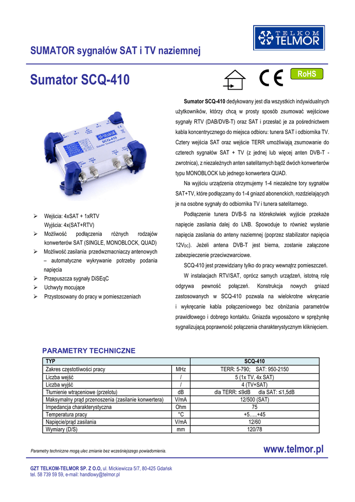 SUMATOR sygnałów SAT i TV naziemnej RoHS Sumator SCQ-410 Sumator SCQ-410 dedykowany jest dla wszystkich indywidualnych użytkowników, którzy chcą w prosty sposób zsumować wejściowe sygnały RTV (DAB/DVB-T) oraz SAT i przesłać je za pośrednictwem kabla koncentrycznego do miejsca odbioru: tunera SAT i odbiornika TV. Cztery wejścia SAT oraz wejście TERR umożliwiają zsumowanie do czterech sygnałów SAT + TV (z jednej lub więcej anten DVB-T zwrotnica), z niezależnych anten satelitarnych bądź dwóch konwerterów typu MONOBLOCK lub jednego konwertera QUAD. Na wyjściu urządzenia otrzymujemy 1-4 niezależne tory sygnałów SAT+TV, które podłączamy do 1-4 gniazd abonenckich, rozdzielających je na osobne sygnały do odbiornika TV i tunera satelitarnego. Wejścia: 4xSAT + 1xRTV Wyjścia: 4x(SAT+RTV) Możliwość podłączenia Podłączenie tunera DVB-S na którekolwiek wyjście przekaże napięcie zasilania dalej do LNB. Spowoduje to również wysłanie różnych rodzajów napięcia zasilania do anteny naziemnej (poprzez stabilizator napięcia konwerterów SAT (SINGLE, MONOBLOCK, QUAD) Możliwość zasilania przedwzmacniaczy antenowych – automatyczne wykrywanie potrzeby podania 12VDC). Jeżeli antena DVB-T jest bierna, zostanie załączone zabezpieczenie przeciwzwarciowe. SCQ-410 jest przewidziany tylko do pracy wewnątrz pomieszczeń. napięcia Przepuszcza sygnały DiSEqC Uchwyty mocujące odgrywa Przystosowany do pracy w pomieszczeniach zastosowanych w SCQ-410 pozwala na wielokrotne wkręcanie W instalacjach RTV/SAT, oprócz samych urządzeń, istotną rolę pewność połączeń. Konstrukcja nowych gniazd i wykręcanie kabla połączeniowego bez obniżania parametrów prawidłowego i dobrego kontaktu. Gniazda wyposażono w sprężynkę sygnalizującą poprawność połączenia charakterystycznym kliknięciem. PARAMETRY TECHNICZNE TYP Zakres częstotliwości pracy Liczba wejść Liczba wyjść Tłumienie wtrąceniowe (przelotu) Maksymalny prąd przenoszenia (zasilanie konwertera) Impedancja charakterystyczna Temperatura pracy Napięcie/prąd zasilania Wymiary (D/S) Parametry techniczne mogą ulec zmianie bez wcześniejszego powiadomienia. GZT TELKOM-TELMOR SP. Z O.O, ul. Mickiewicza 5/7, 80-425 Gdańsk tel. 58 739 59 59, e-mail: [email protected] MHz / / dB V/mA Ohm °C V/mA mm SCQ-410 TERR: 5-790; SAT: 950-2150 5 (1x TV, 4x SAT) 4 (TV+SAT) dla TERR: ≤9dB dla SAT: ≤1,5dB 12/500 (SAT) 75 +5…..+45 12/60 120/78 www.telmor.pl