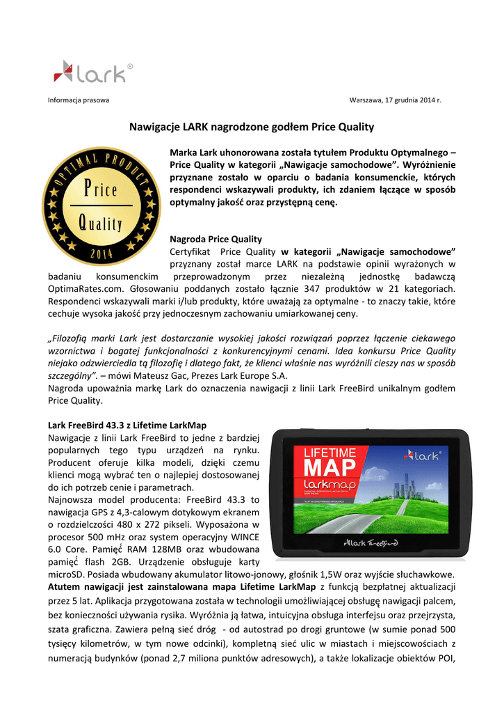 Informacja prasowa Warszawa, 17 grudnia 2014 r. Nawigacje LARK nagrodzone godłem Price Quality Marka Lark uhonorowana została tytułem Produktu Optymalnego – Price Quality w kategorii „Nawigacje samochodowe”. Wyróżnienie przyznane zostało w oparciu o badania konsumenckie, których respondenci wskazywali produkty, ich zdaniem łączące w sposób optymalny jakość oraz przystępną cenę. Nagroda Price Quality Certyfikat Price Quality w kategorii „Nawigacje samochodowe” przyznany został marce LARK na podstawie opinii wyrażonych w badaniu konsumenckim przeprowadzonym przez niezależną jednostkę badawczą OptimaRates.com. Głosowaniu poddanych zostało łącznie 347 produktów w 21 kategoriach. Respondenci wskazywali marki i/lub produkty, które uważają za optymalne - to znaczy takie, które cechuje wysoka jakość przy jednoczesnym zachowaniu umiarkowanej ceny. „Filozofią marki Lark jest dostarczanie wysokiej jakości rozwiązań poprzez łączenie ciekawego wzornictwa i bogatej funkcjonalności z konkurencyjnymi cenami. Idea konkursu Price Quality niejako odzwierciedla tą filozofię i dlatego fakt, że klienci właśnie nas wyróżnili cieszy nas w sposób szczególny”. – mówi Mateusz Gac, Prezes Lark Europe S.A. Nagroda upoważnia markę Lark do oznaczenia nawigacji z linii Lark FreeBird unikalnym godłem Price Quality. Lark FreeBird 43.3 z Lifetime LarkMap Nawigacje z linii Lark FreeBird to jedne z bardziej popularnych tego typu urządzeń na rynku. Producent oferuje kilka modeli, dzięki czemu klienci mogą wybrać ten o najlepiej dostosowanej do ich potrzeb cenie i parametrach. Najnowsza model producenta: FreeBird 43.3 to nawigacja GPS z 4,3-calowym dotykowym ekranem o rozdzielczości 480 x 272 pikseli. Wyposażona w procesor 500 mHz oraz system operacyjny WINCE 6.0 Core. Pamięć ́ RAM 128MB oraz wbudowana pamięć ́ flash 2GB. Urządzenie obsługuje karty microSD. Posiada wbudowany akumulator litowo-jonowy, głośnik 1,5W oraz wyjście słuchawkowe. Atutem nawigacji jest zainstalowana mapa Lifetime LarkMap z funkcją bezpłatnej aktualizacji przez 5 lat. Aplikacja przygotowana została w technologii umożliwiającej obsługę ̨ nawigacji palcem, bez konieczności używania rysika. Wyróżnia ją łatwa, intuicyjna obsługa interfejsu oraz przejrzysta, szata graficzna. Zawiera pełną sieć dróg - od autostrad po drogi gruntowe (w sumie ponad 500 tysięcy kilometrów, w tym nowe odcinki), kompletną sieć ulic w miastach i miejscowościach z numeracją budynków (ponad 2,7 miliona punktów adresowych), a także lokalizacje obiektów POI, oznakowanie niebezpiecznych miejsc na drodze i funkcję omijania przeszkód drogowych. Niezawodnie prowadzi kierowcę nawet w trudnym terenie, jakim są np. centra miast, góry czy dukty leśne. Dodatkowo urządzenie poinformuje nas o atrakcjach turystycznych znajdujących się w pobliżu. Nawigacja posiada blisko 1.800 dźwiękowych komunikatów krajoznawczych opisujących najatrakcyjniejsze miejsca w Polsce oraz ponad 75 tras wycieczek samochodowych z głosowym przewodnikiem (w tym nowość wycieczki o tematyce sakralnej). Sugerowana cena producenta dla tego urządzenia wynosi 169 PLN. Produkt dostępny w sieciach: Tesco, Neonet, RTV Euro AGD, Auchan. W ofercie marki Lark znajdują się również m.in. tablety, smartfony, sprzęt audio, kamery sportowe, wideorejestratory, powerbanki oraz ramki cyfrowe. Oferta jest stale poszerzana i aktualizowana. *** O LARK EUROPE Marka LARK jest obecna na polskim rynku od 2004 roku, a jej oferta obejmuje urządzenia nawigacyjne GPS, tablety, smartfony, smart audio, przenośny sprzęt audio i video oraz inne. LARK systematycznie poszerza ofertę swoich urządzeń o nowe, ciekawe rozwiązania. Dystrybucja oferty odbywa się poprzez sprzedaż stacjonarną i internetową, a produkty firmy dostępne są w ponad 1400 sklepach w całym kraju, w tym wszystkich wiodących sieciach handlowych.