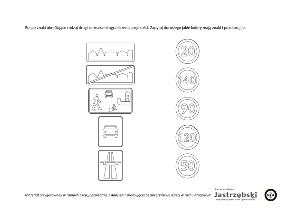 Połącz znaki określające rodzaj drogi ze znakami ograniczenia prędkości. Zapytaj dorosłego jakie kolory mają znaki i pokoloruj je. Partnerami akcji są: Materiał przygotowany w ramach akcji „Bezpiecznie z Adasiem” promującej bezpieczeństwo dzieci w ruchu drogowym