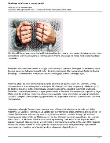 Modlitwa różańcowa w naszej parafii Wpisany przez Administrator czwartek, 20 sierpnia 2009 11:37 - Zmieniony środa, 16 września 2009 09:56 Modlitwa Różańcowa znana jest w Kościele od bardzo dawna i ma swoją głęboką tradycję. Jest to modlitwa Maryjna związana z rozmyślaniem Pisma Świętego na miarę możliwości każdego człowieka. Różaniec to rozważanie razem z Maryją podstawowych tajemnic Ewangelii od Wcielenia Syna Bożego poprzez Odkupienie na Krzyżu i Zmartwychwstanie Chrystusa aż po Zesłanie Ducha Świętego i chwałę nieba, w której uczestniczy Maryja przy boku swojego Syna. Tradycja głosi, że wzór odmawiania różańca otrzymał od samej Maryi św. Dominik. On też rozpowszechnił tę modlitwę wśród wiernych. Modlitwę różańcową nazywamy „Biblią ubogich”, bo dzięki niej nawet ludzie nieumiejący czytać mogli poznać i zgłębić tajemnice Ewangelii. Różaniec prowadzi do autentycznego zjednoczenia z Jezusem Chrystusem przy pomocy Jego Matki. Jest to modlitwa niezwykle skuteczna, zwycięża moce ciemności, dźwiga grzeszników, umacnia chorych, podnosi upadających na duchu, daje siłę w chwilach doświadczeń, broni od nieprzyjaciół. Najświętsza Maryja Panna często ukazuje się z różańcem i oświadcza, że miła jest Jej ta modlitwa. W Lourdes, Fatimie, w La Salette czy Gietrzwałdzie prosi „Odmawiajcie różaniec”. W historii Różańca św. odznaczyły się szczególnie trzy wielkie postacie, którzy byli wielkimi misjonarzami nabożeństw do Różańca św., to: św. Dominik Guzman, Alan Rupe, św. Ludwik Maria Gruon de Montfort. Wielkie znaczenie tej modlitwy podkreślali liczni Papieże. Wśród papieży naszych czasów, którzy wyróżnili się w promowaniu różańca był bł. Jan XXIII i przede wszystkim papież Paweł VI, który zgodnie z inspiracją Soboru Watykańskiego II podkreślił ewangeliczny charakter różańca i jego ukierunkowanie chrystologiczne. 1/4 Modlitwa różańcowa w naszej parafii Wpisany przez Administrator czwartek, 20 sierpnia 2009 11:37 - Zmieniony środa, 16 września 2009 09:56 Różaniec to łańcuch bezpieczeństwa na stromej skale szczytów górskich. Nie wolno się zatrzymać na żadnej tajemnicy, trzeba iść dalej. Bo pełnia życia jest u szczytu (Kard. S. Wyszyński). Ojciec Św. Jan Paweł II mówi: Różaniec to przedziwna modlitwa, którą bardzo ukochałem od młodzieńczych lat. Modlitwa ta miała ważne miejsce w moim życiu duchowym. Różaniec towarzyszył mi w chwilach radości i doświadczenia. Zawierzyłem mu wiele trosk, dzięki niemu zawsze doznawałem otuchy. Przedziwna modlitwa w swej prostocie i głębi zarazem. W Różańcu przesuwają się przed oczyma naszej duszy główne momenty z życia Jezusa Chrystusa. Układają się w całokształt tajemnic radosnych, bolesnych, chwalebnych. Aby rozwinąć chrystologiczny wymiar różańca stosowne było uzupełnienie, które pozwoliło objąć także tajemnice życia publicznego między chrztem w Jordanie a męką. Po przypomnieniu Wcielenia i ukrytego życia Chrystusa (radosne) rozważać pewne momenty życia publicznego o szczególnej wadze (tajemnice światła). To uzupełnienie o nowe tajemnice ma sprawić, że będzie to modlitwa przeżywana w duchowości chrześcijańskiej jako rzeczywiste wprowadzenie w głębie Serca Jezusa Chrystusa – oceanu radości, światła, boleści i chwały. Z okazji zbliżającej się sto dwudziestej rocznicy ogłoszenia encykliki Leona XIII, Ojciec Św. pragnie, aby modlitwę różańcową proponowano w szczególny sposób przez cały rok, ukazywano jej wartość w różnych wspólnotach chrześcijańskich . Ogłaszam okres od października 2002 roku do października 2003 Rokiem Różańca . Różaniec to skarb, który trzeba odkryć. Proszę Was odmawiajcie Różaniec. Żywy Różaniec oznacza: 1. Życie według Ewangelii, który jest fundamentem i źródłem życia chrześcijańskiego. Jest modlitwą ewangeliczną, ponieważ zawiera Modlitwę Pańską, Pozdrowienie Anielskie, oraz ewangeliczne tajemnice naszego odkupienia; 2/4 Modlitwa różańcowa w naszej parafii Wpisany przez Administrator czwartek, 20 sierpnia 2009 11:37 - Zmieniony środa, 16 września 2009 09:56 2. Życie wiarą, nadzieją i miłością – znaczy wierzyć w istnienie Boga i wierzyć Bogu, który przemawia, ufać Bogu i w Jego dzieło zbawienia, oraz kochać Boga i dla Boga ludzi; 3. Oznacza jakby „Elektrownię Duchową”, która zasila wiernych mocą Bożą i pobudza ich do czynu apostolskiego, czyli do praktycznej działalności apostolskiej, jak praca wśród ubogich, chorych, rodzin wielodzietnych, rodzin alkoholików, zaniedbanych religijnie i moralnie, dbałość o dom Boży, o szaty liturgiczne, krzewienie cnót moralnych, zwłaszcza czynnej miłości bliźniego sprawiedliwości społecznej; 4. Żywy Różaniec jest jak by niezdobytą „Twierdzą Obronną”, albowiem broni jednostkę, rodzinę i społeczeństwo przed śmiercią duchową, mianowicie przed ateizmem i laicyzmem, przed zepsuciem obyczajów, zwłaszcza w życiu małżeńskim i rodzinnym, przed alkoholizmem; 5. Żywy Różaniec składa się z Żywych Róż. Każda Róża posiada 20 osób, z których każda odmawia jeden dziesiątek różańca połączonego z rozważaniem (zanosi przed tron Niepokalanej najpiękniejszy bukiet z dziesięciu różyczek „Ave” śnieżno-białej lilii Modlitwy Pańskiej) Członkowie Róż Różańcowych naśladują gorliwe cnoty Matki Bożej. Zamawiają Msze św., przystępują do sakramentów świętych. Jest to jakby uroczystość imieninowa w Żywym Różańcu. W pierwszą niedziele każdego miesiąca o godz. 7.00 jest sprawowana Eucharystia w intencji członków Żywych Róż i ich Rodzin. Po Mszy św. ks. Proboszcz podaje nam intencję modlitewną, papieską, misyjną i parafialną. Po Mszy św. ks. Proboszcz spotyka się z Kołami Żywego Różańca i modli się wspólnie w podanych intencjach. Obow