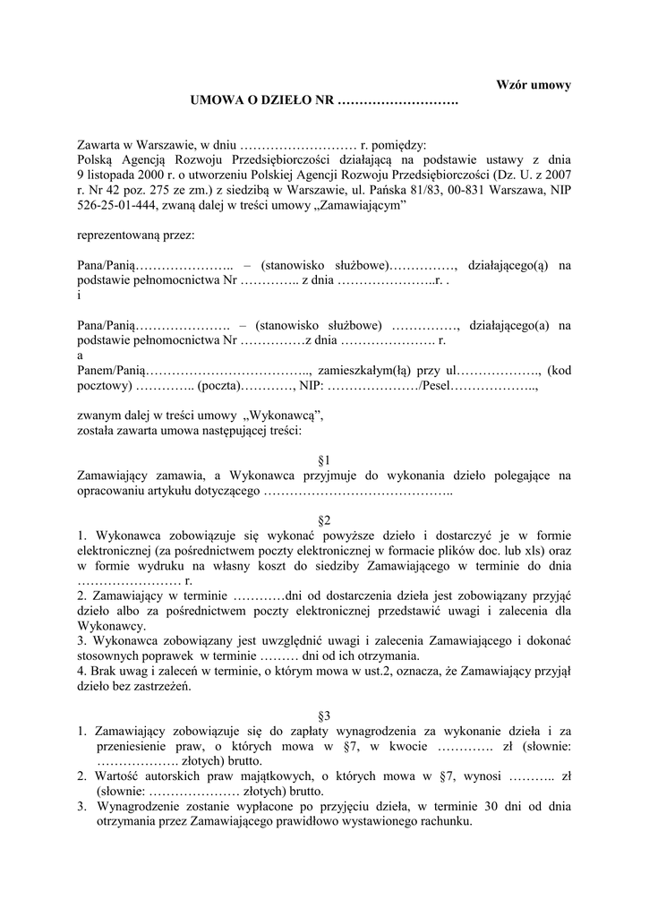 Wzór umowy UMOWA O DZIEŁO NR ………………………. Zawarta w Warszawie, w dniu ……………………… r. pomiędzy: Polską Agencją Rozwoju Przedsiębiorczości działającą na podstawie ustawy z dnia 9 listopada 2000 r. o utworzeniu Polskiej Agencji Rozwoju Przedsiębiorczości (Dz. U. z 2007 r. Nr 42 poz. 275 ze zm.) z siedzibą w Warszawie, ul. Pańska 81/83, 00-831 Warszawa, NIP 526-25-01-444, zwaną dalej w treści umowy „Zamawiającym” reprezentowaną przez: Pana/Panią………………….. – (stanowisko służbowe)……………, działającego(ą) na podstawie pełnomocnictwa Nr ………….. z dnia …………………..r. . i Pana/Panią…………………. – (stanowisko służbowe) ……………, działającego(a) na podstawie pełnomocnictwa Nr ……………z dnia …………………. r. a Panem/Panią……………………………….., zamieszkałym(łą) przy ul………………., (kod pocztowy) ………….. (poczta)…………, NIP: …………………/Pesel……………….., zwanym dalej w treści umowy „Wykonawcą”, została zawarta umowa następującej treści: §1 Zamawiający zamawia, a Wykonawca przyjmuje do wykonania dzieło polegające na opracowaniu artykułu dotyczącego …………………………………….. §2 1. Wykonawca zobowiązuje się wykonać powyższe dzieło i dostarczyć je w formie elektronicznej (za pośrednictwem poczty elektronicznej w formacie plików doc. lub xls) oraz w formie wydruku na własny koszt do siedziby Zamawiającego w terminie do dnia …………………… r. 2. Zamawiający w terminie …………dni od dostarczenia dzieła jest zobowiązany przyjąć dzieło albo za pośrednictwem poczty elektronicznej przedstawić uwagi i zalecenia dla Wykonawcy. 3. Wykonawca zobowiązany jest uwzględnić uwagi i zalecenia Zamawiającego i dokonać stosownych poprawek w terminie ……… dni od ich otrzymania. 4. Brak uwag i zaleceń w terminie, o którym mowa w ust.2, oznacza, że Zamawiający przyjął dzieło bez zastrzeżeń. §3 1. Zamawiający zobowiązuje się do zapłaty wynagrodzenia za wykonanie dzieła i za przeniesienie praw, o których mowa w §7, w kwocie …………. zł (słownie: ………………. złotych) brutto. 2. Wartość autorskich praw majątkowych, o których mowa w §7, wynosi ……….. zł (słownie: ………………… złotych) brutto. 3. Wynagrodzenie zostanie wypłacone po przyjęciu dzieła, w terminie 30 dni od dnia otrzymania przez Zamawiającego prawidłowo wystawionego rachunku. 4. Zapłata wynagrodzenia zostanie dokonana przelewem na rachunek Wykonawcy Nr ……………………, prowadzony przez Bank………………. 5. Wynagrodzenie na rzecz Wykonawcy może zostać pomniejszone o naliczone kary umowne, jeżeli taka forma zapłaty kary umownej zostanie wybrana przez Zamawiającego. 1. 2. 3. 4. 5. 6. 7. §4 Wykonawca jest zobowiązany do zapłaty na rzecz Zamawiającego kar umownych w przypadku: 1) odstąpienia od umowy przez Zamawiającego z przyczyn leżących po stronie Wykonawcy lub rozwiązania umowy przez Wykonawcę albo Zamawiającego z przyczyn, za które odpowiedzialność ponosi Wykonawca – w wysokości 10% wynagrodzenia brutto określonego w § 3 ust. 1; 2) opóźnienia w przekazywaniu dzieła lub jego poprawionej wersji w stosunku do terminów określonych w § 2 ust 1 i 3 – w wysokości 0,5 % wynagrodzenia brutto, o którym mowa w § 3 ust. 1 za każdy dzień opóźnienia; 3) innym niż wskazane w pkt. 1 – 2 nienależytego wykonania umowy przez Wykonawcę, w wysokości 1% wynagrodzenia brutto, o którym mowa § 3 ust.1. Roszczenia z tytułu kar umownych będą pokrywane z wynagrodzenia należnego Wykonawcy lub na podstawie pisemnego wezwania Wykonawcy do zapłaty, w zależności od wyboru Zamawiającego. Na kary umowne zostanie wystawiona przez Zamawiającego nota obciążeniowa. Wykonawca zobowiązuje się do zapłaty kary umownej w ciągu 10 dni od otrzymania noty obciążeniowej, na rachunek bankowy wskazany w wezwaniu. Zamawiający może dokonać potrącenia naliczonych kar umownych z wynagrodzenia Wykonawcy. Kary umowne mogą podlegać łączeniu. Zamawiający zastrzega sobie prawo do dochodzenia, na zasadach ogólnych, odszkodowania przewyższającego wysokość kary umownej. §5 1. W przypadku opóźnienia w wykonywaniu dzieła przekraczającego 7 dni w stosunku do terminów określonych w § 2 ust. 1 lub 3, Zamawiający w terminie 30 dni od dnia upływu któregokolwiek z terminów, o których mowa w § 2 ust. 1 lub 3, może odstąpić od umowy w całości lub od jej części, bez wypłaty jakiegokolwiek odszkodowania i bez wyznaczania dodatkowego terminu wykonania dzieła. Oświadczenie Zamawiającego o odstąpieniu od umowy będzie miało formę pisemną i będzie zawierało uzasadnienie. Oświadczenie to może zostać doręczone Wykonawcy listem poleconym. 2. W przypadku odstąpienia przez Zamawiającego od umowy Zamawiający nie traci uprawnienia do naliczenia kar umownych. §6 Wykonawca nie może powierzyć ani w całości, ani w części wykonania dzieła osobom trzecim pod rygorem nieważności. §7 1. Wykonawca zobowiązuję się do zapewnienia tego, że: 1) utwory powstałe w ramach wykonania dzieła, o którym mowa w §1, będą stanowiły twórcze i oryginale opracowania; 2) będą mu przysługiwały autorskie prawa majątkowe oraz uprawnienie do zezwalania na wykonywanie zależnych praw do utworów powstałych w ramach wykonania dzieła, o którym mowa w §1; 3) utwory powstałe w ramach wykonania dzieła, o którym mowa w § 1, nie będą obciążone prawami osób trzecich i nie będą naruszały jakichkolwiek praw osób trzecich, w szczególności nie będą zawierały niedozwolonych zapożyczeń z innych utworów i nie będą naruszały w inny sposób praw autorskich osób trzecich. 2. Z dniem przyjęcia dzieła, Wykonawca przenosi na zasadach wyłączności na Zamawiającego autorskie prawa ma
