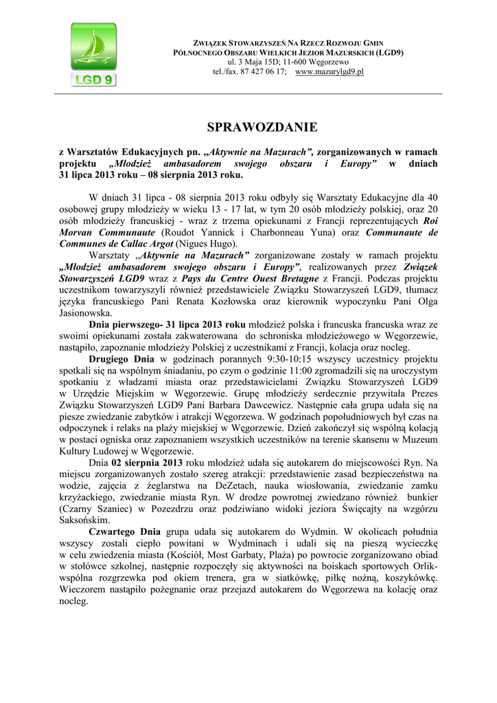 ZWIĄZEK STOWARZYSZEŃ NA RZECZ ROZWOJU GMIN PÓŁNOCNEGO OBSZARU WIELKICH JEZIOR MAZURSKICH (LGD9) ul. 3 Maja 15D; 11-600 Węgorzewo tel./fax. 87 427 06 17; www.mazurylgd9.pl SPRAWOZDANIE z Warsztatów Edukacyjnych pn. ,,Aktywnie na Mazurach”, zorganizowanych w ramach projektu „MłodzieŜ ambasadorem swojego obszaru i Europy” w dniach 31 lipca 2013 roku – 08 sierpnia 2013 roku. W dniach 31 lipca - 08 sierpnia 2013 roku odbyły się Warsztaty Edukacyjne dla 40 osobowej grupy młodzieŜy w wieku 13 - 17 lat, w tym 20 osób młodzieŜy polskiej, oraz 20 osób młodzieŜy francuskiej - wraz z trzema opiekunami z Francji reprezentujących Roi Morvan Communaute (Roudot Yannick i Charbonneau Yuna) oraz Communaute de Communes de Callac Argot (Nigues Hugo). Warsztaty ,,Aktywnie na Mazurach” zorganizowane zostały w ramach projektu „MłodzieŜ ambasadorem swojego obszaru i Europy”, realizowanych przez Związek Stowarzyszeń LGD9 wraz z Pays du Centre Ouest Bretagne z Francji. Podczas projektu uczestnikom towarzyszyli równieŜ przedstawiciele Związku Stowarzyszeń LGD9, tłumacz języka francuskiego Pani Renata Kozłowska oraz kierownik wypoczynku Pani Olga Jasionowska. Dnia pierwszego- 31 lipca 2013 roku młodzieŜ polska i francuska francuska wraz ze swoimi opiekunami została zakwaterowana do schroniska młodzieŜowego w Węgorzewie, nastąpiło, zapoznanie młodzieŜy Polskiej z uczestnikami z Francji, kolacja oraz nocleg. Drugiego Dnia w godzinach porannych 9:30-10:15 wszyscy uczestnicy projektu spotkali się na wspólnym śniadaniu, po czym o godzinie 11:00 zgromadzili się na uroczystym spotkaniu z władzami miasta oraz przedstawicielami Związku Stowarzyszeń LGD9 w Urzędzie Miejskim w Węgorzewie. Grupę młodzieŜy serdecznie przywitała Prezes Związku Stowarzyszeń LGD9 Pani Barbara Dawcewicz. Następnie cała grupa udała się na piesze zwiedzanie zabytków i atrakcji Węgorzewa. W godzinach popołudniowych był czas na odpoczynek i relaks na plaŜy miejskiej w Węgorzewie. Dzień zakończył się wspólną kolacją w postaci ogniska oraz zapoznaniem wszystkich uczestników na terenie skansenu w Muzeum Kultury Ludowej w Węgorzewie. Dnia 02 sierpnia 2013 roku młodzieŜ udała się autokarem do miejscowości Ryn. Na miejscu zorganizowanych zostało szereg atrakcji: przedstawienie zasad bezpieczeństwa na wodzie, zajęcia z Ŝeglarstwa na DeZetach, nauka wiosłowania, zwiedzanie zamku krzyŜackiego, zwiedzanie miasta Ryn. W drodze powrotnej zwiedzano równieŜ bunkier (Czarny Szaniec) w Pozezdrzu oraz podziwiano widoki jeziora Święcajty na wzgórzu Saksońskim. Czwartego Dnia grupa udała się autokarem do Wydmin. W okolicach południa wszyscy zostali ciepło powitani w Wydminach i udali się na pieszą wycieczkę w celu zwiedzenia miasta (Kościół, Most Garbaty, PlaŜa) po powrocie zorganizowano obiad w stołówce szkolnej, następnie rozpoczęły się aktywności na boiskach sportowych Orlikwspólna rozgrzewka pod okiem trenera, gra w siatkówkę, piłkę noŜną, koszykówkę. Wieczorem nastąpiło poŜegnanie oraz przejazd autokarem do Węgorzewa na kolację oraz nocleg. ZWIĄZEK STOWARZYSZEŃ NA RZECZ ROZWOJU GMIN PÓŁNOCNEGO OBSZARU WIELKICH JEZIOR MAZURSKICH (LGD9) ul. 3 Maja 15D; 11-600 Węgorzewo tel./fax. 87 427 06 17; www.mazurylgd9.pl 04 sierpnia 2013 uczestnicy projektu wyruszyli autokarem do GiŜycka. Podczas pobytu młodzieŜ z opiekunami brała udział w pokazach lotniczych Mazury AirShow prezentowanych nad jeziorem Niegocin, na plaŜy miejskiej. MłodzieŜ miała moŜliwość zwiedzić ciekawe i nowoczesne miejsca w GiŜycku- pasaŜ, Ekomarina, plaŜa, molo. Szóstego dnia zajęcia zorganizowane zostały zajęcia w Muzeum Kultury Ludowej w Węgorzewie. MłodzieŜ została podzielona na grupy i pobierała nauki z garncarstwa, kwiaciarstwa artystycznego, brała udział w pokazach tkactwa, a takŜe w własnoręcznym ubijaniu masła. Po zajęciach w MKL i pieszym przejściu do schroniska na obiad, cała grupa udała się na plaŜę miejską. Siódmego dnia warsztatów po porannym śniadaniu w ośrodku noclegowym, uczestnicy projektu mieli czas wolny na Międzynarodowym Jarmarku Folkloru w Węgorzewie. Następnie autokarem młodzieŜ została przewieziona do Przerwanek- miejsca rozpoczęcia spływu kajakowego. Na miejscu przedstawiono wszystkim zasady bezpieczeństwa oraz podstawy pierwszej pomocy. W czasie spływu odbył się obiad nad brzegiem rzeki Sapiny przygotowany przez Gospodarstwo Agroturystyczne Stręgielek. W godzinach wieczornych odbyło się podsumowanie realizacji projektu wraz z podzieleniem się wraŜeniami przez młodzieŜ oraz przedstawicielami francuskiego i polskiego LGD. Ósmego dnia nastąpiła ewaluacja warsztatów. MłodzieŜ wraz z opiekunami opracowali ustne procedury monitorowania projektu, nastąpiło podsumowanie warsztatów oraz rozdanie pamiątkowych dyplomów. Ostatniego dnia warsztatów odbyło się wczesne śniadanie w Schronisku młodzieŜowym oraz zakończenie realizacji warsztatów. Celem projektu było przedstawienie młodzieŜy podobieństwa oraz róŜnic pomiędzy obszarami, podzieleniem się róŜnymi działaniami prowadzonymi na ich terenie, poprzez prowadzenie wspólnych akcji i przedsięwzięć. Rozwinięcie wśród uczestników poczucia dumy i przynaleŜności do miejsc z których pochodzą, tak aby w przyszłości zechciała łączyć swą aktywność zawodową z miejscem pochodzenia. Warsztaty przebiegły w miłej atmosferze, pod okiem opiekunów oraz osób wykwalifikowanych w danych dziedzinach. Koordynator ds. obsługi Rady Beata Bartnik
