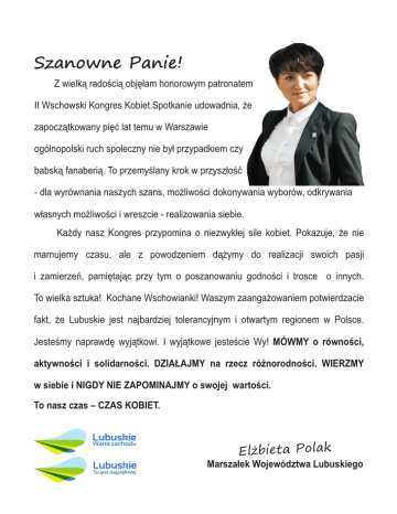 Szanowne Panie! Z wielk¹ radoœci¹ objê³am honorowym patronatem II Wschowski Kongres Kobiet.Spotkanie udowadnia, ¿e zapocz¹tkowany piêæ lat temu w Warszawie ogólnopolski ruch spo³eczny nie by³ przypadkiem czy babsk¹ fanaberi¹. To przemyœlany krok w przysz³oœæ - dla wyrównania naszych szans, mo¿liwoœci dokonywania wyborów, odkrywania w³asnych mo¿liwoœci i wreszcie - realizowania siebie. Ka¿dy nasz Kongres przypomina o niezwyk³ej sile kobiet. Pokazuje, ¿e nie marnujemy czasu, ale z powodzeniem d¹¿ymy do realizacji swoich pasji i zamierzeñ, pamiêtaj¹c przy tym o poszanowaniu godnoœci i trosce o innych. To wielka sztuka! Kochane Wschowianki! Waszym zaanga¿owaniem potwierdzacie fakt, ¿e Lubuskie jest najbardziej tolerancyjnym i otwartym regionem w Polsce. Jesteœmy naprawdê wyj¹tkowi. I wyj¹tkowe jesteœcie Wy! MÓWMY o równoœci, aktywnoœci i solidarnoœci. DZIA£AJMY na rzecz ró¿norodnoœci. WIERZMY w siebie i NIGDY NIE ZAPOMINAJMY o swojej wartoœci. To nasz czas – CZAS KOBIET. Warte zachodu Tu jest najpiêkniej El¿bieta Polak Marsza³ek Województwa Lubuskiego Drogie Kole¿anki 28 wrzeœnia tego roku, to wyj¹tkowy dzieñ w kobiecym ¿yciu naszego powiatu. To dzieñ Drugiego Wschowskiego Kongresu Kobiet pod nazw¹ "Wiedza, Aktywnoœæ, Samorealizacja". Honorowy nad nim patronat objê³a Marsza³ek Województwa Lubuskiego Pani El¿bieta Polak. Pragniemy bardzo, byœcie w tym dniu by³y z nami. Oczekujemy na panie o ró¿nych pogl¹dach i wywodz¹ce siê z ró¿nych œrodowisk. Wspólnie pos³uchamy wyk³adu na przyk³ad o tym, ¿e równoœæ siê op³aca, zarówno w pracy, w ¿yciu zawodowym jak i w polityce. Dowiemy siê jak pogodziæ wiele ¿yciowych ról - polityka, samorz¹dowca, ¿ony i matki. Bêd¹ tematy o tañcu i mi³oœci - bo jak powiedzia³a Pani Marsza³ek w Lubniewicach na otwarciu parku im. Michaliny Wis³ockiej, to uczucie jest wpisane w strategiê i promocjê naszego województwa. Nieraz jednak ona zawodzi. Jak wówczas zachowaæ swoj¹ godnoœæ, jak przemocy domowej powiedzieæ "nie", te¿ bêdzie mo¿na us³yszeæ podczas kongresowych wyk³adów. Nie zabraknie te¿ muzyki.Podczas Kongresu bêdziemy mia³y okazjê do wymiany pogl¹dów i doœwiadczeñ. Do zdobywania inspiracji. Po prostu - do bycia w tym dniu razem do czego zachêcamy, prosimy i oczekujemy. SPONSOR STRATEGICZNY Rada Programowa Kongresu Renata Chilarska Hanna Knaflewska-Walkowiak Urszula Chudak