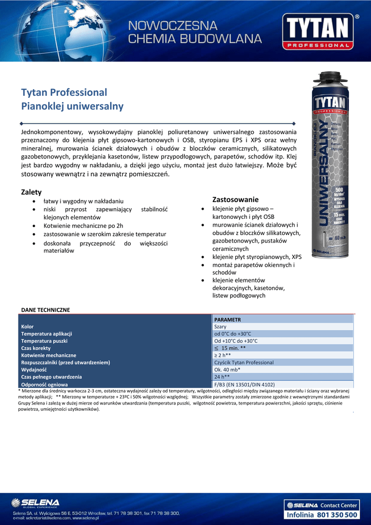 Tytan Professional Pianoklej uniwersalny Jednokomponentowy, wysokowydajny pianoklej poliuretanowy uniwersalnego zastosowania przeznaczony do klejenia płyt gipsowo-kartonowych i OSB, styropianu EPS i XPS oraz wełny mineralnej, murowania ścianek działowych i obudów z bloczków ceramicznych, silikatowych gazobetonowych, przyklejania kasetonów, listew przypodłogowych, parapetów, schodów itp. Klej jest bardzo wygodny w nakładaniu, a dzięki jego użyciu, montaż jest dużo łatwiejszy. Może być stosowany wewnątrz i na zewnątrz pomieszczeń. Zalety łatwy i wygodny w nakładaniu niski przyrost zapewniający stabilność klejonych elementów Kotwienie mechaniczne po 2h zastosowanie w szerokim zakresie temperatur doskonała przyczepność do większości materiałów Zastosowanie klejenie płyt gipsowo – kartonowych i płyt OSB murowanie ścianek działowych i obudów z bloczków silikatowych, gazobetonowych, pustaków ceramicznych klejenie płyt styropianowych, XPS montaż parapetów okiennych i schodów klejenie elementów dekoracyjnych, kasetonów, listew podłogowych DANE TECHNICZNE Kolor Temperatura aplikacji Temperatura puszki Czas korekty Kotwienie mechaniczne Rozpuszczalniki (przed utwardzeniem) Wydajność Czas pełnego utwardzenia Odporność ogniowa PARAMETR Szary od 0°C do +30°C Od +10°C do +30°C ≤ 15 min. ** ≥ 2 h** Czyścik Tytan Professional Ok. 40 mb* 24 h** F/B3 (EN 13501/DIN 4102) * Mierzone dla średnicy warkocza 2-3 cm, ostateczna wydajność zależy od temperatury, wilgotności, odległości między związanego materiału i ściany oraz wybranej metody aplikacji; ** Mierzony w temperaturze + 23ºC i 50% wilgotności względnej; Wszystkie parametry zostały zmierzone zgodnie z wewnętrznymi standardami Grupy Selena i zależą w dużej mierze od warunków utwardzania (temperatura puszki, wilgotność powietrza, temperatura powierzchni, jakości sprzętu, ciśnienie powietrza, umiejętności użytkowników). SPOSÓB UŻYCIA Przygotowanie podłoża: Podłoże powinno być stabilne, równe, nośne, suche, oczyszczone z kurzu, pyłu, brudu, zanieczyszczeń, starych, kruchych i łuszczących się warstw, luźnych elementów i środków antyadhezyjnych. Podłoże robocze nie może być oszronione lub z zaciekami wodnymi. Przygotowanie pianokleju: Puszka powinna mieć temperaturę pokojową. Przed użyciem należy silnie energicznie wstrząsnąć puszką przez ok. 30 sekund. Przykręcić puszkę do pistoletu. Pianoklej należy aplikować trzymając puszkę „do góry dnem”. Ogólne wytyczne aplikacji Nałożyć klej na powierzchnię klejoną w postaci warkocza o średnicy 23 cm. Następnie połączyć klejone elementy, jednak nie później niż do 5 minut po aplikacji. W zależności od wagi / rozmiaru klejonych elementów dociskać lub podpierać klejone elementy minimum przez 15 min. (UWAGA: nie zaleca się zwilżania wodą kleju i powierzchni roboczych). W przypadku małych elementów wykończeniowych lub dekoracyjnych pianoklej powinien pokrywać min. 50% powierzchni klejenia. W przypadku dużych powierzchni, takich jak płyty gipsowokartonowej lub OSB pianoklej powinien pokrywać min 5%powierzchni klejenia. Zalecana grubość spoiny wynosi max. 5 mm. W celu polepszenia przyczepności, zaleca się klejenie kontaktowe. Pełny czas utwardzania 24 h. Chronić przed promieniami UV pokrywając tynkiem, farbą lub taśmą. Płyty G-K i OSB Płytę OSB przeszlifować w celu zwiększenia przyczepności i oczyścić z pyłu. Nałożyć warkocz pianokleju wokół obwodu płyty, ok. 5cm od krawędzi oraz zygzakiem przez środek w razie potrzeby i połączyć klejone elementy. Klej powinien pokrywać co najmniej 5% powierzchni płyty. Elementy dekoracyjne Aplikować pianoklej punktowo, lub pasami i połączyć klejone elementy. W celu przyśpieszenia wiązania pianokleju zaleca się rozłączyć i ponownie połączyć klejone elementy (klejenie kontaktowe). Parapety okienne i schody Nałożyć min. dwa równoległe warkocze na powierzchnię, na której będzie montowany parapet lub wokół podstopnicy ok. 5 cm od krawędzi i połączyć klejone elementy. Beton komórkowy i bloczki silikatowe Nakładać minimum dwa warkocze pianokleju o średnicy 2-3 cm, około 5 cm od krawędzi bloczka i połączyć klejone elementy. Pierwsza warstwa musi być wykonana przy użyciu tradycyjnej zaprawy murarskiej. Klejone bloczki muszą być równe i gładkie. Uwaga: dotyczy nieobciążonych ścianek działowych oraz obudów. EPS/XPS i płytki Nałożyć warkocz kleju wokół obwodu płyty, około 5cm od krawędzi oraz zygzakiem przez środek w razie potrzeby i połączyć klejone elementy. Izolacje i naprawy dachów Aplikować warkocz kleju dookoła klejonej powierzchni zachowując 5 cm odstępu od krawędzi elementu i połączyć klejone elementy. Czyszczenie W przypadku przerwy w pracy dłuższej niż niż 15 minut, oczyścić dyszę pistoletu Czyścikiem Tytan Professional i zablokować spust. Po zakończeniu prac wyczyścić pistolet Czyścikiem Tytan Professional. Świeży klej usuwać czyścikiem przy czym należy zwrócić uwagę, że czyścik może niszczyć płytę styropianową. OGRANICZENIA STOSOWANIA Produkt nie przylega do polietylenu, polipropylenu, poliamidu i teflonu. Przed użyciem zaleca się wykonać próbę klejenia. Temperatury niższe niż zalecane obniżają wydajność oraz wydłużają czas utwardzania kleju. Otwarte opakowanie kleju należy zużyć w ciągu 1 tygodnia. Utwardzony klej można usunąć jedynie mechanicznie (np. za pomocą noża). PRZECHOWYWANIE I OPAKOWANIE Termin ważności wynosi 15 miesięcy od daty produkcji. Produkt przechowywać w suchym, chłodnym miejscu, w oryginalnie zapakowanych pojemnikach, „zaworem do góry”. Temperatura przechowywania: od +5°C do +30°C (przekroczenie tych limitów zmniejsza okres przydatności do użycia do 9 miesięcy lub nawet może spowodować uszkodzenie produktu). Nie jest dozwolone przechowywanie po