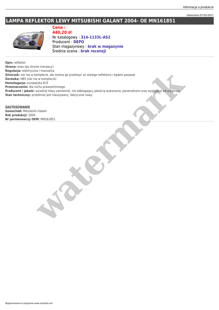 Informacje o produkcie Utworzono 07-03-2017 LAMPA REFLEKTOR LEWY MITSUBISHI GALANT 2004- OE MN161851 Cena : 440,20 zł Nr katalogowy : 314-1133L-AS2 Producent : DEPO Stan magazynowy : brak w magazynie Średnia ocena : brak recenzji w at ZASTOSOWANIE Samochód: Mitsubishi Galant Rok produkcji: 2004Nr porównawczy OEM: MN161851 er m ar k Opis: reflektor Strona: lewa (po stronie kierowcy) Regulacja: elektryczna / manualna Silniczek: nie ma w komplecie, ale można go przełożyć ze starego reflektora i będzie pasował Żarówka: HB5 (nie ma w komplecie) Homologacja: europejska ECE Przeznaczenie: dla ruchu prawostronnego Producent / jakość: wysokiej klasy zamiennik, nie odbiegający jakością wykonania, parametrami oraz wyglądem od oryginału Stan techniczny: przedmiot jest nieużywany, fabrycznie nowy Wygenerowano w programie www.oscGold.com