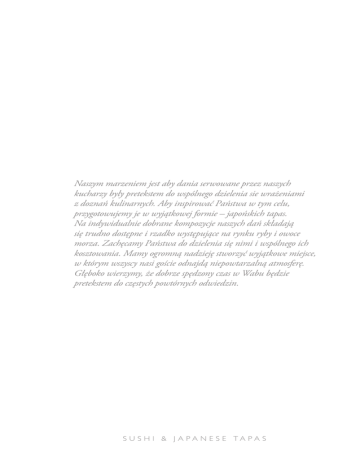 ZUPY Miso-shiru – tradycyjna japońska zupa na bazie dashi z dodatkiem pasty sojowej klasyczna 15 ZŁ / łosoś 23 ZŁ / owoce morza 25 ZŁ Gyoza donburi – bulion wegetariański na bazie kombu z pierożkami warzywnymi 21 ZŁ Tom yum – pikantny bulion z mlekiem kokosowym, grzybami poku i kolendrą kurczak 29 ZŁ / krewetki 35 ZŁ Zarigani osuimono – esencjonalny bulion z szyjek rakowych, czerwonego miso i kombu 34 ZŁ P R Z Y S TAW K I Naszym marzeniem jest aby dania serwowane przez naszych Pierożki gyoza – japońskie pierożki z kurczakiem lub warzywami kucharzy były dzielenia sie wrażeniami 19 ZŁpretekstem / kurczak do23wspólnego ZŁ warzywa z doznań inspirować Tori karagekulinarnych. – marynowaneAby kawałki kurczakaPaństwa 21 ZŁ w tym celu, przygotowujemy je w wyjątkowej formie – japońskich tapas. 45 ZŁ Na indywidualnie dobrane kompozycje naszych dań składają się trudno dostępne i rzadko występujące na rynku ryby i owoce morza. Zachęcamy Państwa do dzielenia się nimi i wspólnego ich T E M P U R AMamy ogromną nadzieję stworzyć wyjątkowe miejsce, kosztowania. w którym wszyscy nasi2 szt., goście odnajdą niepowtarzalną Veggie tempura – batat papryka 2 szt., cukinia 2 szt., atmosferę. lotos 3 szt., okra 3 szt. 33 ZŁ Głęboko wierzymy, że dobrze spędzony czas w Wabu będzie Ebi tempura do – krewetki szt. 45 ZŁ odwiedzin. pretekstem częstych6powtórnych Spice hotategai – przegrzebki smażone z brokułami S A Ł AT Y Kimchi – pikantna sałatka z kiszonych warzyw 17 ZŁ Midori sarada – sezonowe warzywa z vinegrettem 17 ZŁ Wakame sarada – algi morskie, ogórek, tofu z dresingiem sojowo-sezamowym 19 ZŁ Chairo sarada – sałatka z gotowanych grzybów i marynowanych warzyw S U S H I & J A PA N E S E TA PA S 19 ZŁ S U S H I & J A PA N E S E TA PA S ZUPY Miso-shiru – tradycyjna japońska zupa na bazie dashi z dodatkiem pasty sojowej klasyczna 15 ZŁ / łosoś 23 ZŁ / owoce morza 25 ZŁ Gyoza donburi – bulion wegetariański na bazie kombu z pierożkami warzywnymi 21 ZŁ Tom yum – pikantny bulion z mlekiem kokosowym, grzybami poku i kolendrą kurczak 29 ZŁ / krewetki 35 ZŁ Zarigani osuimono – esencjonalny bulion z szyjek rakowych, czerwonego miso i kombu 34 ZŁ P R Z Y S TAW K I Pierożki gyoza – japońskie pierożki z kurczakiem lub warzywami warzywa 19 ZŁ / kurczak 23 ZŁ Tori karage – marynowane kawałki kurczaka 21 ZŁ Spice hotategai – przegrzebki smażone z brokułami 45 ZŁ TEMPURA Veggie tempura – batat 2 szt., papryka 2 szt., cukinia 2 szt., lotos 3 szt., okra 3 szt. 33 ZŁ Ebi tempura – krewetki 6 szt. 45 ZŁ S A Ł AT Y Kimchi – pikantna sałatka z kiszonych warzyw 17 ZŁ Midori sarada – sezonowe warzywa z vinegrettem 17 ZŁ Wakame sarada – algi morskie, ogórek, tofu z dresingiem sojowo-sezamowym 19 ZŁ Chairo sarada – sałatka z gotowanych grzybów i marynowanych warzyw S U S H I & J A PA N E S E TA PA S 19 ZŁ S U S H I & J A PA N E S E TA PA S C I E PZ ŁUEP YW A R Z Y W A Miso-shiru – tradycyjna zupa na bazie dashi Edamame – fasolka sojowa 19japońska ZŁ z dodatkiem pasty sojowej Okra –klasyczna okra smażona w mące kukurydzianej z sosem chili 25 21ZŁ ZŁ 15 ZŁ / łosoś 23 ZŁ / owoce morza Gyoza donburi – bulion wegetariański na bazie kombu z pierożkami warzywnymi 21 ZŁ Tom yum – pikantny bulion z mlekiem kokosowym, grzybami poku i kolendrą G R I kurczak LLOWA Y B Y 35 ZŁ 29N ZŁE / Rkrewetki Łosoś –Zarigani łosoś podawany ze –słodkim sosem bulion sojowym, miseczką ryżu czerwonego miso 33 ZŁ osuimono esencjonalny z szyjek rakowych, i kombu 34 ZŁ Corvina – corvina podawana z sosem z czerwonego miso, miseczką ryżu 34 ZŁ P R Z Y S TAW K I SASHIMI Pierożki gyoza – japońskie pierożki z kurczakiem lub warzywami ZŁ / kurczak 23 ZŁ warzywa 1 gatunek ryby – 519kawałków do wyboru (łosoś, tuńczyk yellow fin, okoń) 45 ZŁ Toriryby karage marynowane kawałki(seriola,tuńczyk kurczaka 21 ZŁ 1 gatunek – 5–kawałków do wyboru blue fin, węgorz, ośmiornica, gotowana–krewetka, przegrzebek, małż czerwony) 55 ZŁ Spice hotategai przegrzebki smażone z brokułami 45 ZŁ 3 gatunki ryby – 15 kawałków do wyboru (tuńczyk yellow fin, okoń, corvina, seriola, tuńczyk blue fin, węgorz, ośmiornica, gotowana krewetka, przegrzebek, małż czerwony) 160 ZŁ TEMPURA Veggie tempura – batat 2 szt., papryka 2 szt., cukinia 2 szt., lotos 3 szt., okra 3 szt. 33 ZŁ T A T Ebi A Rtempura Y – krewetki 6 szt. Tatar z łososia – miseczka / maki Tatar z tuńczyka – miseczka / maki S A Ł AT Y 45 ZŁ 36 ZŁ 45 ZŁ Kimchi – pikantna sałatka z kiszonych warzyw 17 ZŁ Midori sarada – sezonowe warzywa z vinegrettem 17 ZŁ Wakame sarada – algi morskie, ogórek, tofu z dresingiem sojowo-sezamowym 19 ZŁ Chairo sarada – sałatka z gotowanych grzybów i marynowanych warzyw S U S H SI U& S H J AI P &A NJ AE PS A E NTEASPEA ST A P A S 19 ZŁ S U S H I & J A PA N E S E TA PA S N I G I R I - 2 SZ T. Nigiri tamago 13 ZŁ Nigiri kalmar 16 ZŁ Nigiri łosoś 19 ZŁ Nigiri okoń morski 26 ZŁ Nigiri gotowana krewetka Nigiri ośmiornica Nigiri tuńczyk 26 ZŁ 27 ZŁ 29 ZŁ Nigiri hokkigai 29 ZŁ Nigiri pieczony węgorz Nigiri seriola 34 ZŁ 35 ZŁ Nigiri tuńczyk blue fin 42 ZŁ Nigiri krewetka + łosoś + awokado Nigir łosoś + węgorz + awokado Nigiri hotategai Nigiri toro 41 ZŁ 42 ZŁ 42 ZŁ 52 ZŁ G U N K A N & OYA KO M A K I - 2 S Z T. Gunkan tatar z łososia Gunkan ebi mayo 27 ZŁ 31 ZŁ Gunkan tatar z tuńczyka Gunkan tako mayo 33 ZŁ 33 ZŁ Gunkan kawior ikura 39 ZŁ Oyakomaki z mięsem kraba owinięte w łososia 41 ZŁ Oyakomaki z jajem przepiórczym owiniętą w tuńczyka Oyakomaki z kawiorem ikura owinięte w łososia 41 ZŁ 43 ZŁ S U S H I & J A PA N E S E TA PA S S U S H I & J A PA N E S E TA PA S H O SZOU M PY A K I - 6 SZ T. Miso-shiru japońska zupa na bazie dashi Hosomaki oshinko– tradycyjna 13 ZŁ z dodatkiem pasty sojowej Hosomaki kampyo1