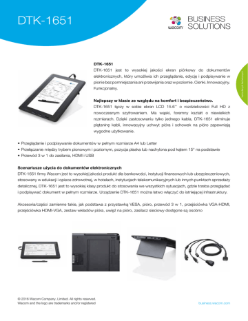 DTK-1651 DTK-1651 jest to wysokiej jakości ekran piórkowy do dokumentów elektronicznych, który umożliwia ich przeglądanie, edycję i podpisywanie w pionie bez pomniejszania ani przewijania oraz w poziomie. Cienki. Innowacyjny. Funkcjonalny. Najlepszy w klasie ze względu na komfort i bezpieczeństwo. DTK-1651 łączy w sobie ekran LCD 15.6’’ o rozdzielczości Full HD z nowoczesnym szyfrowaniem. Ma wąski, foremny kształt o niewielkich rozmiarach. Dzięki zastosowaniu tylko jednego kabla, DTK-1651 eliminuje plątaninę kabli, innowacyjny uchwyt pióra i schowek na pióro zapewniają wygodne użytkowanie. •Przeglądanie i podpisywanie dokumentów w pełnym rozmiarze A4 lub Letter •Przełączanie między trybem pionowym i poziomym, pozycja płaska lub nachylona pod kątem 15° na podstawie •Przewód 3 w 1 do zasilania, HDMI i USB Scenariusze użycia do dokumentów elektronicznych DTK-1651 firmy Wacom jest to wysokiej jakości produkt dla bankowości, instytucji finansowych lub ubezpieczeniowych, stosowany w edukacji i opiece zdrowotnej, w hotelach, instytucjach telekomunikacyjnych lub innych punktach sprzedaży detalicznej, DTK-1651 jest to wysokiej klasy produkt do stosowania we wszystkich sytuacjach, gdzie trzeba przeglądać i podpisywać dokument w pełnym rozmiarze. Urządzenie DTK-1651 można łatwo włączyć do istniejącej infrastruktury. Akcesoria/części zamienne takie, jak podstawa z przystawką VESA, pióro, przewód 3 w 1, przejściówka VGA-HDMI, przejściówka HDMI-VGA, zestaw wkładów pióra, uwięź na pióro, zasilacz sieciowy dostępne są osobno © 2016 Wacom Company, Limited. All rights reserved. Wacom and the logo are trademarks and/or registered business.wacom.com karta danych technicznych DTK-1651 DTK-1651 DTK-1651 Wymiary (S x G x W, bez stojaka) 420 x 286 x 17 mm Ciężar (ze stojakiem) 2,0 kg Kolor obudowy Zwart Nachylenie podstawy geïntegreerde standaard (liggend 15° / staand 15°) Zasilanie energią 100 tot 240 VAC, 50/60 Hz Pobór mocy 12 V DC, 3 A (max.) Obsługiwany system operacyjny Windows 10/8.1/8/7 (32-bits, 64-bits) Mac OSX 10.9 of nieuwer karta danych technicznych Specyfikacje ogólne Ekran LCD Wyświetlacz IPS Powierzchnia pokrywy Antyrefleksyjne, wytrawione szkło Przekątna ekranu 15.6" (344,16 x 193,59 mm) Współczynnik proporcji 16:9 Rozdzielczość Full HD, 1920 x 1080 pikseli Kąt widzenia (w poziomie / w pionie) 170 °/ 170° Jasność 200 cd/ m² (typowo) Kontrast 800:1 (typowo) Czas reakcji 30 ms (typowo) Okres trwałości podświetlenia 25 000 h Pióro i tablet Technologia Rezonans elektromagnetyczny (EMR) Obszar roboczy 346,16 x 195,59 mm Rozdzielczość 2 540 lpi Dokładność współrzędnych ±0,5 mm (środek) Częstość próbkowania 197 punktów na sekundę Poziomy nacisku 1.024 Różne Wysokość odczytu Miejsce na pióro Karta graficzna Uchwyt ścienny Oprogramowanie Zawartość opakowania 5 mm lub więcej (środek) Wbudowany schowek na pióro, uchwyt na pióro nie dot. VESA 75 mm kompatybilne z oprogramowaniem do podpisów / eSignature i sign pro PDF firmy Wacom interaktywny ekran piórkowy z wbudowaną podstawą, bezprzewodowe i nie wymagające baterii pióro, przewód 3 w 1 (1,8 m/ 5.91 ft), instalacyjna płyta CD (sterownik Wacom, informacja o produkcie), podręcznik szybkiej instalacji, uwięź na pióro, (włókno nylonowe, 50 cm / 19.7“), 5 dodatkowych wkładów pióra, narzędzie do wyjmowania wkładów, zasilacz, przewód zasilania od 5 do 40°C, wilgotność względna: od 30% do 80% (bez skraplania) Temperatura otoczenia podczas pracy, wilgotność względna Dopuszczalna temperatura podczas przechowywania, od -10°C do 60°C, wilgotność względna: od 20% do 90% (bez skraplania) wilgotność względna (Maksymalna wilgotność podczas przechowywania wynosi 38% przy temperaturze 60 stopni C, maksymalna temperatura podczas przechowywania wynosi 42 stopnie C przy wilgotności 90%.) Gwarancja © 2016 Wacom Company, Limited. All rights reserved. Wacom and the logo are trademarks and/or registered „3 lata (WTC, WEG), 1 rok (WAP, WJP, WCN)“ business.wacom.com