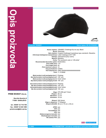 Opis proizvoda Proizvod: 19548851 Datum izpisa: 09:10 07/03/2017 Numer artykulu: Brand: Opis artykulu: Informacja katalogowa( nazwy/strony): Kolor(y): Material: Cechy: Recommended decoration option: Print width (mm): Print height (mm): Print maximum colours: Kraj pochodzenia: Kod statystyczny: Cena: 19548851 Challenge 6p sw.cap, Black Slazenger Czapka Challenge 6-panelowa typu sandwich. Bawełna. Label Catalogue 2017 259 nieprzeźroczysty czarny Bawełna. The sandwich color is ''off-white'' Embroidery 110 45 12 CHINA (090) 6505003000000000000000 11.19 BAM Blank product multi packaging level 1: Qty blank product multi packaging level1: Blank product multi packaging level 2: Qty blank product multi packaging level2: Polybag 100 pcs Inner carton 100 pcs Decorated product multi packaging lever1: Qty deco product multi packaging level1: Decorated product multi packaging level2: Qty deco product multi packaging level2: Polybag 100 pcs Inner carton 100 pcs Waga: Dlugosc: Wysokosc: Szerokosc: PRIM INVEST d.o.o. Derviša Numića 9 71000 SARAJEVO 275-280 g/m² Gram 26 cm 12 cm 18 cm Eksport: 200 Sztuki Waga w eksporcie: 17 Kilogram Eksport (DxSxW): 46 cm x 70 cm x 38 cm tel.: 00387 33 718 705 fax.: 00387 33 661 999 APEO: AZO: Formaldehyd: PCP: Niekancerogenne barwniki: Niealergizujące barwniki: Nie zawiera PVC: [email protected] (c) 2005 yes yes yes yes yes yes yes Pro+PROMOTION - ponuda je namijenjena samo pravnim osobama