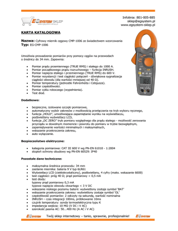 Infolinia: 801-005-885 [email protected] www.egsystem-sklep.pl KARTA KATALOGOWA Nazwa: Cyfrowy miernik cęgowy CMP-1006 ze świadectwem wzorcowania Typ: EG-CMP-1006 Umożliwia prowadzenie pomiarów przy pomocy cęgów na przewodach o średnicy do 34 mm. Zapewnia: Pomiar prądu przemiennego (TRUE RMS) i stałego do 1000 A. Pomiar początkowego prądu rozruchowego – funkcja INRUSH. Pomiar napięcia stałego i przemiennego (TRUE RMS) do 600 V. Pomiar rezystancji i test ciągłości połączeń - dźwiękowa sygnalizacja ciągłości obwodu (dla wartości mniejszej od 40 Ω). Pomiar temperatury (jednostki Fahrenheita i Celsjusza). Pomiar częstotliwości. Pomiar cyklu roboczego (wypełnienia). Test diod. Dodatkowo: bezpieczne, izolowane szczęki pomiarowe, automatyczny wybór zakresów z możliwością przełączania na tryb wyboru ręcznego, funkcja „HOLD”, umożliwiająca zapamiętanie wyniku na wyświetlaczu, podświetlany wyświetlacz LCD, funkcja „DC ZERO” tryb pomiaru względnego dla prądu stałego - możliwość zerowania przyrządu w dowolnym momencie i powrotu do pomiaru w trybie bezwględnym, zapamiętywanie wartości minimalnych i maksymalnych, wskazanie przekroczenia zakresu, auto wyłączanie. Bezpieczeństwo elektryczne: kategoria pomiarowa: CAT III 600 V wg PN-EN 61010 - 1:2004 stopień ochrony obudowy wg PN-EN 60529: IP40 Pozostałe dane techniczne: maksymalna średnica przewodu: 34 mm zasilanie miernika: bateria 9 V typ 6LR61 Wyświetlacz LCD (ciekłokrystaliczny), podświetlany, 4 cyfry (maks. wskazanie 6600) test ciągłości: próg 40 Ω; prąd pomiarowy < 0,5 mA test diody: typowy prąd pomiarowy 0,3 mA typowe napięcie obwodu otwartego < 3 V DC wskazanie niskiego poziomu baterii: wyświetlony zostaje symbol ‘BAT’ wskazanie przekroczenia zakresu: wyświetlony zostaje symbol ‘OL’ częstotliwość pomiarów: 2 odczyty na sekundę, wartość nominalna INRUSH – czas integracji 100ms, próbkowanie 10ms czujnik temperatury: sonda termoelektryczna typu K impedancja wejścia: 10 MΩ (V DC i V AC) szerokość pasma AC: 50...400 Hz (A AC i V AC) Twój sklep internetowy – tanio, sprawnie, profesjonalnie! Infolinia: 801-005-885 [email protected] www.egsystem-sklep.pl autowyłączanie po czasie: ok. 25 minut wymiary: 229 x 80 x 49 mm waga: 303 g zgodność z wymaganiami norm: PN-EN 61010 - 1:2002, PN-EN 61010 - 2-032 standard jakości: ISO 9001 Nominalne warunki użytkowania: wewnętrzne średnice cęgów: Ø=36/52 mm temperatura pracy: +5...+50°C temperatura przechowywania: -20...+60°C wilgotność robocza: - maks. 80% do 31°C - zmniejszająca się liniowo do 50% przy 40°C wilgotność ładowania: <80% wysokość robocza: maks. 2000 m Pomiar prądu stałego i przemiennego (TRUE RMS) Zakres Rozdz. Błąd podstawowy (DC) Błąd podstawowy (AC) 0...659,9 A 0,1 A ±(2,5% w.m. +5 cyfr) ±(2,5% w.m. + 8 cyfr) dla f=50...60 Hz 660...1000 A 1A ±(2,8% w.m. +8 cyfr) ±(2,8% w.m. + 8 cyfr) dla f=50...60 Hz Pomiar napięcia stałego Zakres Rozdz. 0...6,599 V 0,001 V 6,60...65,99 V 0,01 V 66,0...600,0 V 0,1 V Błąd podstawowy ±(1,5% w.m. + 3 cyfry) Pomiar napięcia przemiennego (TRUE RMS) Zakres Rozdz. 0...6,599 V 0,001 V 6,60...65,99 V 0,01 V 66,0...600,0 V 0,1 V Błąd podstawowy ±(1,8% w.m. + 5 cyfr) dla f=50...60 Hz Twój sklep internetowy – tanio, sprawnie, profesjonalnie! Infolinia: 801-005-885 [email protected] www.egsystem-sklep.pl Pomiar pojemności Zakres Rozdzielczość Dokładność (kondensator warstwowy lub lepszy) 0...999μF 0,1μF ±(5% w.m. + 10 cyfr) Pomiar rezystancji (zabezpieczenie 500 V DC lub AC RMS) Zakres Rozdzielczość 0...999,9 Ω 0,1 Ω 1000...9999 Ω 1Ω Błąd podstawowy ±(1,5% w.m. + 5 cyfr) Pomiar rezystancji Zakres Rozdzielczość Błąd podstawowy 0,0...659,9 Ω 0,1 Ω ±(1,0% w.m. + 4 cyfry) 0,660...6,599 kΩ 0,001 kΩ 6,60...65,99 kΩ 0,01 kΩ 66,0...659,9 kΩ 0,1 kΩ 0,660...6,599 MΩ 0,001 MΩ ±(2,5% w.m. + 3 cyfry) 6,60...66,00 MΩ 0,01 MΩ ±(3,5% w.m. + 5 cyfr) ±(1,5% w.m. + 2 cyfry) Pomiar częstotliwości Zakres Rozdzielczość Błąd podstawowy 30,0...999,9 Hz 0,1 Hz 1,000...9,999 kHz 0,001 kHz 10,00...15,00 kHz 0,01 kHz ±(1.2% w.m. + 2 cyfry) czułość: 30...5 kHz:10 Vrms min. 5 kHz...15 kHz:40 Vrms min. dla 20%...80% cyklu roboczego Pomiar temperatury Zakres Rozdzielczość Błąd podstawowy -20...760°C 0,1°C ±(3,0% w.m. + 5°C) -4...1400°F 0,1°F ±(3,0% w.m. + 9°F) Twój sklep internetowy – tanio, sprawnie, profesjonalnie! Infolinia: 801-005-885 [email protected] www.egsystem-sklep.pl Pomiar cyklu roboczego (wypełnienia) Zakres Rozdzielczość Błąd podstawowy 10,0...94,9% 0,1% ±(1,2% w.m. + 2 cyfry) • szerokość impulsu: 100μs...100 ms, • zakres częstotliwości: 30 Hz...5 kHz •czułość: 30 Hz...5 kHz: 10 Vrms, 5 kHz...15 kHz: 40 Vrms. Skrót „w.m.” oznacza „wartość mierzoną wzorcową”. Wyposażenie standardowe miernika CMP-1006: - przewody pomiarowe (2 szt.) bateria 9V sonda temperatury typu K futerał instrukcja obsługi karta gwarancyjna Twój sklep internetowy – tanio, sprawnie, profesjonalnie!