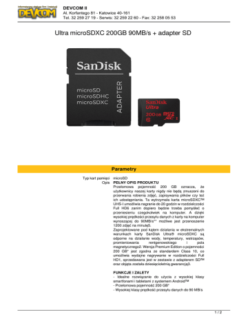 DEVCOM II Al. Korfantego 81 - Katowice 40-161 Tel. 32 259 27 19 - Serwis: 32 259 22 60 - Fax: 32 258 05 53 Ultra microSDXC 200GB 90MB/s + adapter SD Parametry Typ kart pamięci microSD Opis PEŁNY OPIS PRODUKTU Przełomowa pojemność 200 GB oznacza, że użytkownicy naszej karty nigdy nie będą zmuszeni do przerwania robienia zdjęć, zapisywania plików czy też ich udostępniania. Ta wytrzymała karta microSDXC™ UHS-I umożliwia nagranie do 20 godzin w rozdzielczości Full HD6 zanim dopiero będzie trzeba pomyśleć o przeniesieniu czegokolwiek na komputer. A dzięki wysokiej prędkości przesyłu danych z karty na komputer wynoszącej do 90MB/s** możliwe jest przenoszenie 1200 zdjęć na minutę5. Zaprojektowane pod kątem działania w ekstremalnych warunkach karty SanDisk Ultra® microSDXC są odporne na działanie wody, temperatury, wstrząsów, promieniowania rentgenowskiego i pola magnetycznego2. Wersja Premium Edition o pojemności 200 GB* jest zgodna ze standardem Class 10, co umożliwia wydajne nagrywanie w rozdzielczości Full HD1, sprzedawana jest w zestawie z adapterem SD™ oraz objęta została dziesięcioletnią gwarancją3. FUNKCJE I ZALETY - Idealne rozwiązanie do użycia z wysokiej klasy smartfonami i tabletami z systemem Android™ - Przełomowa pojemność 200 GB* - Wysokiej klasy prędkość przesyłu danych do 90 MB/s 1/2 DEVCOM II Al. Korfantego 81 - Katowice 40-161 Tel. 32 259 27 19 - Serwis: 32 259 22 60 - Fax: 32 258 05 53 - Znakomite rozwiązanie do nagrywania w rozdzielczości Full HD1 dzięki zgodności ze standardem prędkości zapisu Class 10 - Odporne na działanie wody, skrajnych temperatur, wstrząsów, pola magnetycznego oraz promieniowania rentgenowskiego2 - Przenoszenie do 1200 zdjęć na minutę5 - Pojemność umożliwiająca przechowywanie do 20 godzin nagrań w rozdzielczości Full HD6 - Aplikacja Memory Zone umożliwia automatyczne zarządzanie mediami i pamięcią, aby uzyskać najwyższy poziom wydajności smartfona4 - Sprzedawane w komplecie z adapterem SD™ umożliwiającym użycie w aparatach fotograficznych Pojemność pamięci flash 200 Prędkość odczytu 90 Klasa pamięci Standard pamięci SD / CF Standard pamięci SD / CF Adapter Czytnik USB Pozostałe parametry Class10 SDXC UHS-I do SD Nie - Wymiary karty microSDXC: 15 mm × 11 mm × 1,0 mm - Wymiary adaptera SD™: 24 mm × 32 mm × 2,1 mm - Temperatura działania: −25°C do 85°C - Temperatura przechowywania: −40°C do 85°C 2/2 Powered by TCPDF (www.tcpdf.org)
