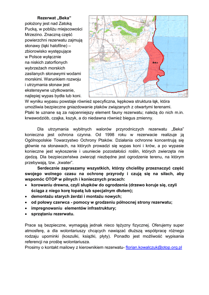 Rezerwat „Beka” położony jest nad Zatoką Pucką, w pobliżu miejscowości Mrzezino. Znaczną część powierzchni rezerwatu zajmują słonawy (łąki halofilne) – zbiorowisko występujące w Polsce wyłącznie na niskich zatorfionych wybrzeżach morskich zasilanych słonawymi wodami morskimi. Warunkiem rozwoju i utrzymania słonaw jest ekstensywne użytkowanie, najlepiej wypas bydła lub koni. W wyniku wypasu powstaje również specyficzna, kępkowa struktura łąk, która umożliwia bezpieczne gniazdowanie ptaków związanych z otwartymi terenami. Ptaki te uznane są za najcenniejszy element fauny rezerwatu; należą do nich m.in. krwawodziób, czajka, kszyk, a do niedawna również biegus zmienny. Dla utrzymania wybitnych walorów przyrodniczych rezerwatu „Beka” konieczna jest ochrona czynna. Od 1998 roku w rezerwacie realizuje ją Ogólnopolskie Towarzystwo Ochrony Ptaków. Działania ochronne koncentrują się głównie na słonawach, na których prowadzi się wypas koni i krów, a po wypasie konieczne jest wykoszenie i usuniecie pozostałości roślin, których zwierzęta nie zjedzą. Dla bezpieczeństwa zwierząt niezbędne jest ogrodzenie terenu, na którym przebywają, tzw. „kwater”. Serdecznie zapraszamy wszystkich, którzy chcieliby przeznaczyć część swojego wolnego czasu na ochronę przyrody i czują się na siłach, aby wspomóc OTOP w pilnych i koniecznych pracach: korowaniu drewna, czyli słupków do ogrodzenia (drzewo koruje się, czyli ściąga z niego korę łopatą lub specjalnym dłutem); demontażu starych żerdzi i montażu nowych; od połowy czerwca - pomocy w grodzeniu północnej strony rezerwatu; impregnowaniu elementów infrastruktury; sprzątaniu rezerwatu. Prace są bezpieczne, wymagają jednak nieco tężyzny fizycznej. Oferujemy super atmosferę, a dla wolontariuszy chcących nawiązać dłuższą współpracę różnego rodzaju upominki (koszulki, książki, płyty). Ponadto jest możliwość wypisania referencji na prośbę wolontariusza. Prosimy o kontakt mailowy z kierownikiem rezerwatu- [email protected] Na słonawach wypasa się konie i bydło. Foto. F. Kowalczuk Na tablicach można znaleźć wiele ciekawych informacji o rezerwacie. Foto. F. Kowalczuk Po wypasie pozostaje niska murawa. Foto. Z. Lenartowicz