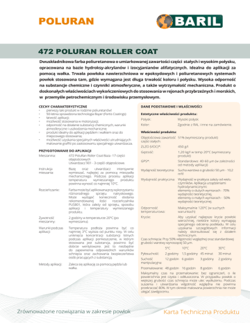 POLURAN 472 POLURAN ROLLER COAT Dwuskładnikowa farba poliuretanowa o umiarkowanej zawartości części stałych i wysokim połysku, opracowana na bazie hydroksy-akrylanów i izocyjanianów alifatycznych. Idealna do aplikacji za pomocą wałka. Trwała powłoka nawierzchniowa w epoksydowych i poliuretanowych systemach powłok stosowana tam, gdzie wymagana jest długa trwałość koloru i połysku. Wysoka odporność na substancje chemiczne i czynniki atmosferyczne, a także wytrzymałość mechaniczna. Produkt o doskonałych właściwościach wykończeniowych do stosowania w rejonach przybrzeżnych i morskich, w przemyśle petrochemicznym i środowisku przemysłowym. CECHY CHARAKTERYSTYCZNE • pierwszy taki produkt w rodzinie poliuretanów! • 50-letnia sprawdzona technologia Bayer (Fortis Coatings) • łatwość aplikacji; • możliwość stosowania w motoryzacji; • odporność na działanie substancji chemicznych, warunki atmosferyczne i uszkodzenia mechaniczne; • produkt idealny do aplikacji pędzlem i wałkiem oraz do miejscowego stosowania; • możliwość uzyskania specjalnych właściwości utrudniających malowanie graffiti po zastosowaniu specjalnego utwardzacza. DANE PODSTAWOWE I WŁAŚCIWOŚCI ZLZO (VOC)*: 450 g/l PRZYGOTOWANIE DO APLIKACJI Gęstość: 1,20 kg/l w temp 20°C (wymieszany produkt) GPS*: Standardowo: 40-60 μm (w zależności od metody aplikacji) Wydajność teoretyczna: Sucha warstwa o grubości 50 μm - 10,2 m²/l Mieszanina: Instrukcja mieszania: Rozcieńczanie: 472 PoluRan Roller Coat Baza -17 części objętościowych Utwardzacz 901 - 3 częśći objętościowe. Bazę oraz utwardzacz intensywnie wymieszać, najlepiej za pomocą mieszadła mechanicznego. Podczas procesu aplikacji temperatura wymieszanego produktu powinna wynosić co najmniej 10°C. Farba może być aplikowana przy wykorzystaniu różnorodnego sprzętu natryskowego. Może wystąpić konieczność dodania rekomendowanej ilości rozcieńczalnika PU5801, która zależy od sprzętu, sposobu aplikacji i temperatury wymieszanego produktu. Żywotność mieszaniny: 2 godziny w temperaturze 20°C (po wymieszaniu). Warunki podczas aplikacji: Temperatura podłoża powinna być co najmniej 3°C wyższa od punktu rosy. W celu uniknięcia koncentracji substancji lotnych podczas aplikacji pomieszczenie, w którym stosowana jest substancja, powinno być dobrze wentylowane. Jest to niezbędne do zapewnienia odpowiednich warunków schnięcia oraz zachowania bezpieczeństwa osób pracujących z substancją. Metody aplikacji: Zaleca się aplikację za pomocą pędzla lub wałka. Estetyczne właściwości produktu: Połysk: Wysoki połysk Kolor: Zgodnie z RAL i inne na zamówienie. Właściwości produktu: Objętościowa zawartość 51% (wymieszany produkt) części stałych: Wydajność praktyczna: Wydajność w praktyce zależy od wielu czynników. Aplikacja urządzeniami hydrodynamicznymi: elementy o dużych wymiarach - 70% wydajności teoretycznej, elementy o małych wymiarach - 50% wydajności teoretycznej. Odporność temperaturowa: Maksymalnie 120ºC (w suchych warunkach) Krycie: Aby uzyskać najlepsze krycie powłoki wierzchniej, niektóre kolory wymagają specjalnego odcienia podkładu. W celu uzyskania szczegółowych informacji należy skonsultować się z działem technicznym. Czas schnięcia: Przy 50% wilgotności względnej oraz standardowej grubości warstwy wynoszącej 50 μm. 5°C Pyłosuchość: 10°C 20°C 2 godziny 1,5 godziny 45 minut 30°C 30 minut Suchość 12 godzin 6 godzin manipulacyjna: 3 godziny 2 godziny Przemalowanie: 48 godzin 16 godzin 8 godzin 6 godzin Maksymalny czas na przemalowanie: bez ograniczeń, o ile powierzchnia jest czysta i odtłuszczona. W przypadku powłok o większej grubości czas schnięcia może ulec wydłużeniu. Podczas suszenia i utwardzania wilgotność względna nie powinna przekraczać 80%. W tym okresie malowana powierzchnia nie może ulegać zawilgoceniu. ty Zrównoważone rozwiązania w zakresie powłok Karta Techniczna Produktu POLURAN 472 POLURAN ROLLER COAT ZALECENIA APLIKACYJNE Rozcieńczalnik: Zalecana ilość: Rozmiar dyszy: Ciśnienie robocze: GPS*: Rozcieńczalnik: Zalecana ilość: Rozmiar dyszy: Ciśnienie robocze: GPS*: ŚRODOWISKO NATURALNE I ZDROWIE Natrysk hydrodynamiczny PU5801 0-10% obj. min. 0,009 cala min. 140 bar 40-60 µm Metoda airmix Pędzel-wałek Natrysk powietrzny PU5801 5-10% obj. min. 2 mm min. 3 bar 40-60 µm S5102 0-5% obj. 40 µm PU5801 0-5% obj. min. 0,009 cala min. 70 bar 40-60 µm Czyszczenie narzędzi: Niezwłocznie po aplikacji z wykorzystaniem rozcieńczalnika PU5801. OPAKOWANIE I PRZECHOWYWANIE Opakowania: 20-litrowe puszki i 200-litrowe beczki Rozcieńczalnik: 25-litrowe puszki i 200-litrowe beczki Okres 12 miesięcy w oryginalnym szczelnie przechowywania: zamkniętym opakowaniu w temperaturze od 5°C do 40°C. Oznakowanie: Zgodnie z wytycznymi dyrektywy UE 67/548/WE dotyczącej materiałów niebezpiecznych. Substancja niebezpieczna i podrażniająca w przypadku kontaktu ze skórą, oczami oraz podczas wdychania. W przypadku kontaktu substancji z oczami należy natychmiast przemyć je dużą ilością wody oraz skontaktować się z lekarzem. Nie należy spożywać pokarmów, napojów ani palić tytoniu w miejscu aplikacji ani podczas aplikacji substancji. UN: Kod Aware: 1263 27-IV KODOWANIE AWARE Kod AWARE (Adequate Warning and Air Requirement – wymagania dotyczące odpowiedniego ostrzeżenia i zapewnienia jakości powietrza) to system kodowania produktów zawierających lotne związki organiczne (LZO) stanowiący narzędzie wsparcia producentów wspomagające ocenę ryzyka i innowacyjności produktu. System ten dodatkowo może być wykorzystywany do informowania użytkowników końcowych o potencjalnie możliwym ryzyku zagrożenia zdrowia wynikającym z użytkowania produktu. System został opracowany na podstawie norweskiego systemu OAR (Occupational Air Requirement – wymagania dotyczące jakości powiet
