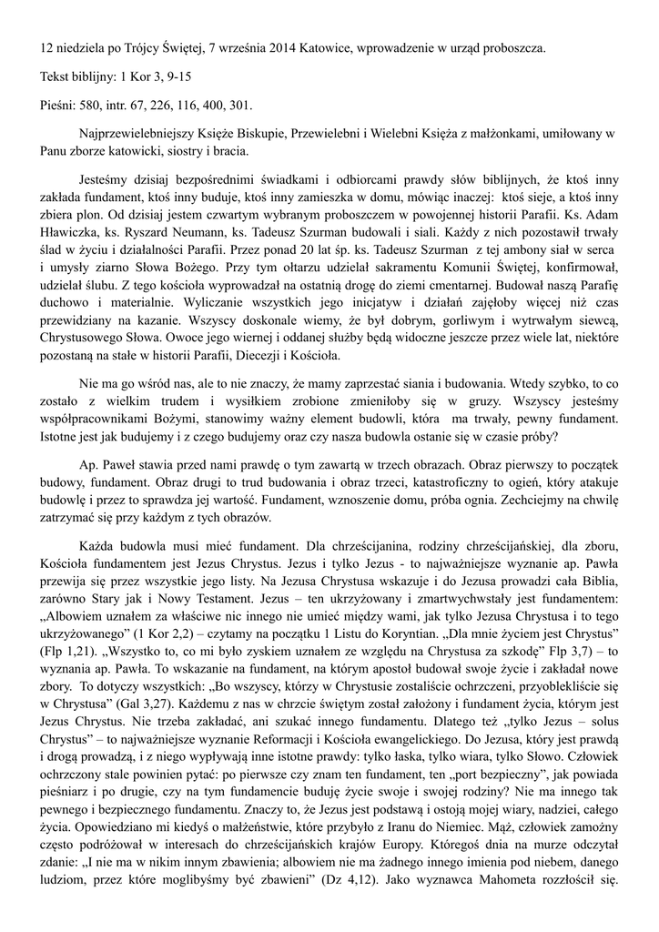 12 niedziela po Trójcy Świętej, 7 września 2014 Katowice, wprowadzenie w urząd proboszcza. Tekst biblijny: 1 Kor 3, 9-15 Pieśni: 580, intr. 67, 226, 116, 400, 301. Najprzewielebniejszy Księże Biskupie, Przewielebni i Wielebni Księża z małżonkami, umiłowany w Panu zborze katowicki, siostry i bracia. Jesteśmy dzisiaj bezpośrednimi świadkami i odbiorcami prawdy słów biblijnych, że ktoś inny zakłada fundament, ktoś inny buduje, ktoś inny zamieszka w domu, mówiąc inaczej: ktoś sieje, a ktoś inny zbiera plon. Od dzisiaj jestem czwartym wybranym proboszczem w powojennej historii Parafii. Ks. Adam Hławiczka, ks. Ryszard Neumann, ks. Tadeusz Szurman budowali i siali. Każdy z nich pozostawił trwały ślad w życiu i działalności Parafii. Przez ponad 20 lat śp. ks. Tadeusz Szurman z tej ambony siał w serca i umysły ziarno Słowa Bożego. Przy tym ołtarzu udzielał sakramentu Komunii Świętej, konfirmował, udzielał ślubu. Z tego kościoła wyprowadzał na ostatnią drogę do ziemi cmentarnej. Budował naszą Parafię duchowo i materialnie. Wyliczanie wszystkich jego inicjatyw i działań zajęłoby więcej niż czas przewidziany na kazanie. Wszyscy doskonale wiemy, że był dobrym, gorliwym i wytrwałym siewcą, Chrystusowego Słowa. Owoce jego wiernej i oddanej służby będą widoczne jeszcze przez wiele lat, niektóre pozostaną na stałe w historii Parafii, Diecezji i Kościoła. Nie ma go wśród nas, ale to nie znaczy, że mamy zaprzestać siania i budowania. Wtedy szybko, to co zostało z wielkim trudem i wysiłkiem zrobione zmieniłoby się w gruzy. Wszyscy jesteśmy współpracownikami Bożymi, stanowimy ważny element budowli, która ma trwały, pewny fundament. Istotne jest jak budujemy i z czego budujemy oraz czy nasza budowla ostanie się w czasie próby? Ap. Paweł stawia przed nami prawdę o tym zawartą w trzech obrazach. Obraz pierwszy to początek budowy, fundament. Obraz drugi to trud budowania i obraz trzeci, katastroficzny to ogień, który atakuje budowlę i przez to sprawdza jej wartość. Fundament, wznoszenie domu, próba ognia. Zechciejmy na chwilę zatrzymać się przy każdym z tych obrazów. Każda budowla musi mieć fundament. Dla chrześcijanina, rodziny chrześcijańskiej, dla zboru, Kościoła fundamentem jest Jezus Chrystus. Jezus i tylko Jezus - to najważniejsze wyznanie ap. Pawła przewija się przez wszystkie jego listy. Na Jezusa Chrystusa wskazuje i do Jezusa prowadzi cała Biblia, zarówno Stary jak i Nowy Testament. Jezus – ten ukrzyżowany i zmartwychwstały jest fundamentem: „Albowiem uznałem za właściwe nic innego nie umieć między wami, jak tylko Jezusa Chrystusa i to tego ukrzyżowanego” (1 Kor 2,2) – czytamy na początku 1 Listu do Koryntian. „Dla mnie życiem jest Chrystus” (Flp 1,21). „Wszystko to, co mi było zyskiem uznałem ze względu na Chrystusa za szkodę” Flp 3,7) – to wyznania ap. Pawła. To wskazanie na fundament, na którym apostoł budował swoje życie i zakładał nowe zbory. To dotyczy wszystkich: „Bo wszyscy, którzy w Chrystusie zostaliście ochrzczeni, przyoblekliście się w Chrystusa” (Gal 3,27). Każdemu z nas w chrzcie świętym został założony i fundament życia, którym jest Jezus Chrystus. Nie trzeba zakładać, ani szukać innego fundamentu. Dlatego też „tylko Jezus – solus Chrystus” – to najważniejsze wyznanie Reformacji i Kościoła ewangelickiego. Do Jezusa, który jest prawdą i drogą prowadzą, i z niego wypływają inne istotne prawdy: tylko łaska, tylko wiara, tylko Słowo. Człowiek ochrzczony stale powinien pytać: po pierwsze czy znam ten fundament, ten „port bezpieczny”, jak powiada pieśniarz i po drugie, czy na tym fundamencie buduję życie swoje i swojej rodziny? Nie ma innego tak pewnego i bezpiecznego fundamentu. Znaczy to, że Jezus jest podstawą i ostoją mojej wiary, nadziei, całego życia. Opowiedziano mi kiedyś o małżeństwie, które przybyło z Iranu do Niemiec. Mąż, człowiek zamożny często podróżował w interesach do chrześcijańskich krajów Europy. Któregoś dnia na murze odczytał zdanie: „I nie ma w nikim innym zbawienia; albowiem nie ma żadnego innego imienia pod niebem, danego ludziom, przez które moglibyśmy być zbawieni” (Dz 4,12). Jako wyznawca Mahometa rozzłościł się. Jednak te słowa nie dawały mu spokoju. Kupił Nowy Testament zaczął czytać i porównywać go z treścią Koranu. Tak doszedł do wiary w Jezusa Chrystusa. Ze względu na wiarę wyemigrował z żoną z Iranu do Niemiec zostawiając tam swój dosyć duży majątek. Gdy go zapytano, czy nie szkoda mu, że tak wiele stracił oburzony odpowiedział: zyskałem coś o wiele cenniejszego, łaskę Jezusa Chrystusa. Jezus Chrystus stał się fundamentem jego życia i jego rodziny. Uważał, że to największy skarb jaki otrzymał w życiu. My mamy fundament, ale jak budujemy? Ap. Paweł napisał, że w tym budowaniu jesteśmy współpracownikami Boga, stanowimy budowlę Bożą. Mamy dobrze budować. Swego czasu bardzo popularna była piosenka zespołu VOX „Szczęśliwej drogi już czas”. Zacytuję jej fragment: „Los cię w drogę pchnął i ukradkiem, drwiąc się śmiał, bo nadzieję dając ci, fałszywy klejnot dał. A ty idziesz w świat, niosąc klejnot ten co dnia, chociaż rozpacz już od lat wyziera z jego dna. Głupi jest los, nadaremnie wzywasz go”. Jakże często ludzie łapią fałszywe klejnoty, z nadzieją, że przyniosą im szczęście, powodzenie, radość, pokój, a może i życie wieczne. Tworzymy, działamy, poznajemy, wykorzystujemy darowane nam możliwości, nadarzające się okazje, wszyscy chcemy szczęścia dla siebie i dla najbliższych. Budujemy niestrudzenie. Z zewnątrz może wyglądać, że wznosimy piękną budowlę. Jak budujemy, czym i z czego budujemy? Budulcem jest Boże Słowo, to zwiastowane i to widzialne Słowo jakim jest Sakrament Stołu Pańskiego? Budowanie w społeczności zb