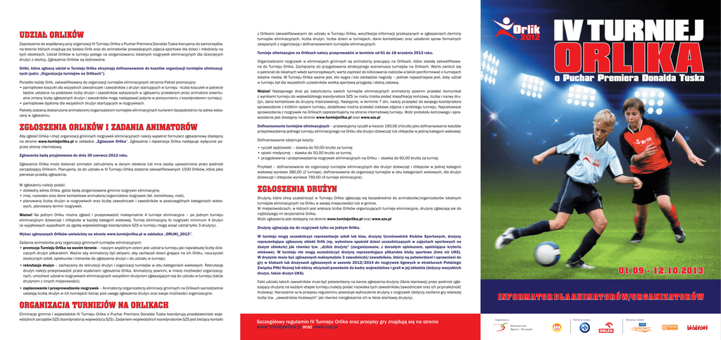 UDZIAŁ ORLIKÓW Zaproszenie do współpracy przy organizacji IV Turnieju Orlika o Puchar Premiera Donalda Tuska kierujemy do samorządów, na terenie których znajdują się boiska Orlik oraz do animatorów prowadzących zajęcia sportowe dla dzieci i młodzieży na tych obiektach. Udział Orlików w turnieju polega na zorganizowaniu lokalnych rozgrywek eliminacyjnych dla dziecięcych drużyn z okolicy. Zgłoszenia Orlików są dobrowolne. Orliki, które zgłoszą udział w Turnieju Orlika otrzymają dofinansowanie do kosztów organizacji turniejów eliminacyjnych (patrz „Organizacja turniejów na Orlikach”). Ponadto każdy Orlik, zakwalifikowany do organizacji turniejów eliminacyjnych otrzyma Pakiet promocyjny: • pamiątkowe koszulki dla wszystkich zawodniczek i zawodników z drużyn startujących w turnieju - liczba koszulek w pakiecie będzie ustalana na podstawie liczby drużyn i zawodników wykazanych w zgłoszeniu przesłanym przez animatora (ewentualne zmiany liczby zgłoszonych drużyn i zawodników mogą następować jedynie w porozumieniu z koordynatorem turnieju); • pamiątkowe dyplomy dla wszystkich drużyn startujących w rozgrywkach. z Orlikami zakwalifikowanymi do udziału w Turnieju Orlika, weryfikacja informacji przekazanych w zgłoszeniach (terminy turniejów eliminacyjnych, liczba drużyn, liczba dzieci w turniejach, dane kontaktowe) oraz ustalenie spraw formalnych związanych z organizacją i dofinansowaniem turniejów eliminacyjnych. Turnieje eliminacyjne na Orlikach należy przeprowadzić w terminie od 01 do 18 września 2013 roku. Organizatorami rozgrywek w eliminacjach gminnych są animatorzy pracujący na Orlikach, które zostały zakwalifikowane do Turnieju Orlika. Zachęcamy do przygotowania atrakcyjnego scenariusza turniejów na Orlikach. Warto zwrócić się o patronat do lokalnych władz samorządowych, warto zaprosić do kibicowania rodziców a także poinformować o turniejach lokalne media. W Turnieju Orlika ważne jest, kto wygra i kto zdobędzie nagrody – jednak najważniejsze jest, żeby udział w turnieju był dla wszystkich uczestników wielką sportową przygodą i dobrą zabawą. Pakiety zostaną dostarczone animatorom/organizatorom turniejów eliminacyjnych kurierem bezpośrednio na adres wskazany w zgłoszeniu. Ważne! Następnego dnia po zakończeniu swoich turniejów eliminacyjnych animatorzy powinni przesłać komunikat z wynikami turnieju do wojewódzkiego koordynatora SZS (w mailu trzeba podać klasyfikację końcową, liczbę i nazwy drużyn, dane kontaktowe do drużyny mistrzowskiej). Następnie, w terminie 7 dni, należy przesyłać do swojego koordynatora sprawozdanie z krótkim opisem turnieju, dodatkowo można przesłać ciekawe zdjęcia z przebiegu turnieju. Najciekawsze sprawozdania z rozgrywek na Orlikach zaprezentujemy na stronie internetowej turnieju. Wzór protokołu końcowego i sprawozdania jest dostępny na stronie www.turniejorlika.pl oraz www.szs.pl ZGŁOSZENIA ORLIKÓW I ZADANIA ANIMATORÓW Dofinansowanie turniejów eliminacyjnych – przewidujemy ryczałt w kwocie 190,00 zł brutto jako dofinansowanie kosztów przeprowadzenia jednego turnieju eliminacyjnego na Orliku dla drużyn dziewcząt lub chłopców w jednej kategorii wiekowej: Aby zgłosić Orlika i chęć organizacji gminnych rozgrywek eliminacyjnych należy wypełnić formularz zgłoszeniowy dostępny na stronie www.turniejorlika.pl w zakładce „Zgłaszam Orlika”. Zgłoszenie i rejestracja Orlika następuje wyłącznie poprzez stronę internetową. Dofinansowanie obejmuje koszty: Zgłoszenia będą przyjmowane do dnia 30 czerwca 2013 roku. Zgłoszenia Orlika może dokonać animator zatrudniony w danym obiekcie lub inna osoba upoważniona przez podmiot zarządzający Orlikiem. Planujemy, że do udziału w IV Turnieju Orlika zostanie zakwalifikowanych 1500 Orlików, które jako pierwsze prześlą zgłoszenia. W zgłoszeniu należy podać: • dokładny adres Orlika, gdzie będą zorganizowane gminne rozgrywki eliminacyjne, • imię, nazwisko oraz dane kontaktowe animatora/organizatora rozgrywek (tel. komórkowy, mail), •p lanowaną liczbę drużyn w rozgrywkach oraz liczbę zawodniczek i zawodników w poszczególnych kategoriach wiekowych, planowany termin rozgrywek. Ważne! Na jednym Orliku można zgłosić i przeprowadzić maksymalnie 4 turnieje eliminacyjne – po jednym turnieju eliminacyjnym dziewcząt i chłopców w każdej kategorii wiekowej. Turniej eliminacyjny to rozgrywki minimum 4 drużyn (w wyjątkowych wypadkach za zgodą wojewódzkiego koordynatora SZS w turnieju mogą wziąć udział tylko 3 drużyny). Wykaz zgłoszonych Orlików umieścimy na stronie www.turniejorlika.pl w zakładce „ORLIKI_2013”. Zadania animatorów przy organizacji gminnych turniejów eliminacyjnych: •p romocja Turnieju Orlika na swoim terenie – naszym wspólnym celem jest udział w turnieju jak największej liczby dziecięcych drużyn piłkarskich. Ważne aby animatorzy byli aktywni, aby zachęcali dzieci grające na ich Orliku, nauczycieli okolicznych szkół, opiekunów i trenerów do zgłaszania drużyn i do udziału w turnieju; • r ekrutacja drużyn – zachęcamy do rekrutacji drużyn i organizacji turniejów w obu kategoriach wiekowych. Rekrutację drużyn należy przeprowadzić przed wysłaniem zgłoszenia Orlika. Animatorzy powinni, w miarę możliwości organizacyjnych, umożliwić udział w rozgrywkach eliminacyjnych wszystkim drużynom zgłaszającym się do udziału w turnieju (także drużynom z innych miejscowości); • z aplanowanie i przeprowadzenie rozgrywek – Animatorzy/organizatorzy eliminacji gminnych na Orlikach samodzielnie ustalają liczbę drużyn w ich turniejach biorąc pod uwagę zgłoszenia drużyn oraz swoje możliwości organizacyjne. ORGANIZACJA TURNIEJÓW NA ORLIKACH Eliminacje gminne i wojewódzkie IV Turnieju Orlika o Puchar Premiera Donalda Tuska koordynują przedstawiciele wojewódzkich zarządów SZS (koordynator