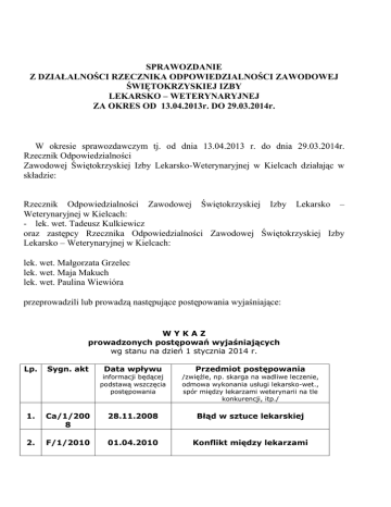 SPRAWOZDANIE Z DZIAŁALNOŚCI RZECZNIKA ODPOWIEDZIALNOŚCI ZAWODOWEJ ŚWIĘTOKRZYSKIEJ IZBY LEKARSKO – WETERYNARYJNEJ ZA OKRES OD 13.04.2013r. DO 29.03.2014r. W okresie sprawozdawczym tj. od dnia 13.04.2013 r. do dnia 29.03.2014r. Rzecznik Odpowiedzialności Zawodowej Świętokrzyskiej Izby Lekarsko-Weterynaryjnej w Kielcach działając w składzie: Rzecznik Odpowiedzialności Zawodowej Świętokrzyskiej Izby Lekarsko – Weterynaryjnej w Kielcach: - lek. wet. Tadeusz Kulkiewicz oraz zastępcy Rzecznika Odpowiedzialności Zawodowej Świętokrzyskiej Izby Lekarsko – Weterynaryjnej w Kielcach: lek. wet. Małgorzata Grzelec lek. wet. Maja Makuch lek. wet. Paulina Wiewióra przeprowadzili lub prowadzą następujące postępowania wyjaśniające: WYKAZ prowadzonych postępowań wyjaśniających wg stanu na dzień 1 stycznia 2014 r. Lp. Sygn. akt Data wpływu Przedmiot postępowania informacji będącej podstawą wszczęcia postępowania /zwięźle, np. skarga na wadliwe leczenie, odmowa wykonania usługi lekarsko-wet., spór między lekarzami weterynarii na tle konkurencji, itp./ 1. Ca/1/200 8 28.11.2008 Błąd w sztuce lekarskiej 2. F/1/2010 01.04.2010 Konflikt między lekarzami 3. Ca/1/201 0 02.06.2010 Błąd w sztuce lekarskiej 4. BC/1/201 0 29.09.2010 Błąd w sztuce lekarskiej 5. C/1/2012 18.10.2012 Błąd w sztuce lekarskiej 6. F/1/2013 26.02/2013 Konflikt między lekarzami 7. 18.05.2013 Konflikt między lekarzami 8. Ab/1/201 3 B/1/2013 09.07.2013 9. D/1/2013 12.07.2013 10. D/2/2013 12.07.2013 11. 01.08.2013 Obrót Środkami farmaceutycznymi Nieprawidłowe wystawianie dokumentów Nieprawidłowe wystawianie dokumentów Błąd w sztuce lekarskiej Ca/1/201 3 12. B/2/2013 02.08.2013 13. 09.08.2013 Obrót Środkami farmaceutycznymi Błąd w sztuce lekarskiej Ca/2/201 3 14. B/3/2013 09.08.2013 15. B/4/2013 14.08.2013 16. 02.09.2013 Obrót Środkami farmaceutycznymi Obrót Środkami farmaceutycznymi Błąd w sztuce lekarskiej 31.10.2013 Błąd w sztuce lekarskiej 25.11.2013 Błąd w sztuce lekarskiej 13.12.2013 Błąd w sztuce lekarskiej 20.12.2013 Nieprawidłowe wystawianie dokumentów 17. 18. 19. 20. Ca/3/201 3 Ca/4/201 3 Ca/5/201 3 Ca/6/201 3 D/3/2013 lek. wet. Tadeusz Kulkiewicz /podpis Rzecznika Odpowiedzialności Zawodowej/