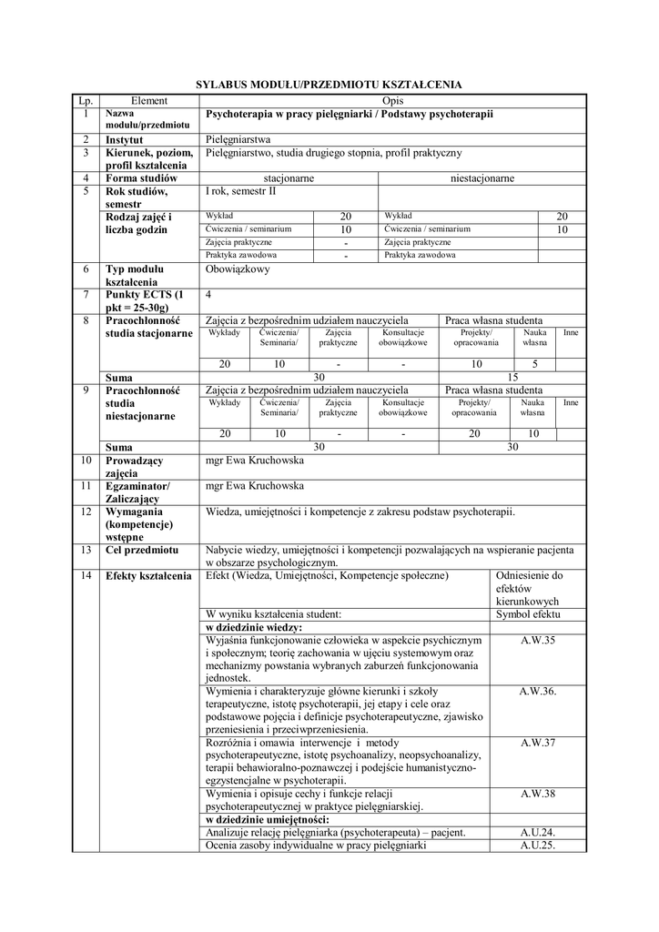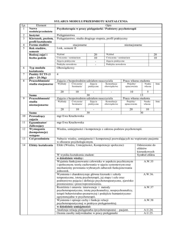 Lp. 1 2 3 4 5 6 7 8 9 Element Nazwa modułu/przedmiotu Instytut Kierunek, poziom, profil kształcenia Forma studiów Rok studiów, semestr Rodzaj zajęć i liczba godzin Pielęgniarstwa Pielęgniarstwo, studia drugiego stopnia, profil praktyczny Typ modułu kształcenia Punkty ECTS (1 pkt = 25-30g) Pracochłonność studia stacjonarne Obowiązkowy Suma Pracochłonność studia niestacjonarne 13 Suma Prowadzący zajęcia Egzaminator/ Zaliczający Wymagania (kompetencje) wstępne Cel przedmiotu 14 Efekty kształcenia 10 11 12 SYLABUS MODUŁU/PRZEDMIOTU KSZTAŁCENIA Opis Psychoterapia w pracy pielęgniarki / Podstawy psychoterapii stacjonarne I rok, semestr II niestacjonarne Wykład Ćwiczenia / seminarium Zajęcia praktyczne Praktyka zawodowa 20 10 - Wykład Ćwiczenia / seminarium Zajęcia praktyczne Praktyka zawodowa 20 10 4 Zajęcia z bezpośrednim udziałem nauczyciela Wykłady Ćwiczenia/ Seminaria/ 20 10 Wykłady Ćwiczenia/ Seminaria/ 20 10 Zajęcia praktyczne Konsultacje obowiązkowe 30 Zajęcia z bezpośrednim udziałem nauczyciela Praca własna studenta Projekty/ opracowania Inne 10 5 15 Praca własna studenta Zajęcia praktyczne Konsultacje obowiązkowe Projekty/ opracowania - - 20 30 Nauka własna Nauka własna Inne 10 30 mgr Ewa Kruchowska mgr Ewa Kruchowska Wiedza, umiejętności i kompetencje z zakresu podstaw psychoterapii. Nabycie wiedzy, umiejętności i kompetencji pozwalających na wspieranie pacjenta w obszarze psychologicznym. Efekt (Wiedza, Umiejętności, Kompetencje społeczne) Odniesienie do efektów kierunkowych W wyniku kształcenia student: Symbol efektu w dziedzinie wiedzy: Wyjaśnia funkcjonowanie człowieka w aspekcie psychicznym A.W.35 i społecznym; teorię zachowania w ujęciu systemowym oraz mechanizmy powstania wybranych zaburzeń funkcjonowania jednostek. Wymienia i charakteryzuje główne kierunki i szkoły A.W.36. terapeutyczne, istotę psychoterapii, jej etapy i cele oraz podstawowe pojęcia i definicje psychoterapeutyczne, zjawisko przeniesienia i przeciwprzeniesienia. Rozróżnia i omawia interwencje i metody A.W.37 psychoterapeutyczne, istotę psychoanalizy, neopsychoanalizy, terapii behawioralno-poznawczej i podejście humanistycznoegzystencjalne w psychoterapii. Wymienia i opisuje cechy i funkcje relacji A.W.38 psychoterapeutycznej w praktyce pielęgniarskiej. w dziedzinie umiejętności: Analizuje relację pielęgniarka (psychoterapeuta) – pacjent. A.U.24. Ocenia zasoby indywidualne w pracy pielęgniarki A.U.25. Forma i warunki potwierdzenia efektu kształcenia Kompetencja społeczne umiejętności wiedza 15 (psychoterapeuty). Omawia podstawowe zjawiska w psychoterapii. A.U.26. Współuczestniczy w psychoterapii grupowej. A.U.27. Stosuje zachowania terapeutyczne w ramach Interwencji A.U.28. pielęgniarskich, z wykorzystaniem elementarnej psychoterapii. Przeprowadza psychoedukację grupową pacjenta i jego A.U.29. rodziny (opiekunów). w dziedzinie kompetencji społecznych: Jest otwarty na rozwój podmiotowości własnej i pacjenta. BK13-1 Efekt kształcenia Sposób potwierdzenia (weryfikacji) osiągany przez moduł/przedmiot Symbol efektu A.W.35 prezentacja wiedzy na zajęciach konwersatoryjnych, aktywny A.W.36 udział w dyskusji problemowej, opracowywanie i analiza A.W.37 tekstów problemowych w domu i na zajęciach A.W.38 konwersatoryjnych A.U.24. przygotowanie projektu grupowego na zadany temat A.U.25. związany z problematyką wykładów i ćwiczeń i jego A.U.26. prezentacja ustna na forum grupy A.U.27. A.U.28 A.U.29 16 17 18 Stosowane metody dydaktyczne Forma i warunki zaliczenia modułu, zasady dopuszczenia do egzaminu oraz zaliczenia poszczególnych zajęć Treści merytoryczne przedmiotu BK9 obserwacja w czasie zajęć, analiza wypowiedzi i postawy względem prezentowanych treści Wykład multimedialny, praca zbiorowa, praca własna, burza mózgów, dyskusja dydaktyczna, projekcje multimedialne, gry symulacyjne, projekcie filmów. Niestacjonarne -Egzamin po II semestrze Stacjonarne – zaliczenie z oceną po II semestrz Zasady dopuszczenia do zaliczenia: 1. Obecność na zajęciach (minimum 50% frekwencji) 2. Aktywny udział w zajęciach (możliwość uzyskania zwolnienia z projektu podczas aktywnego uczestnictwa w ćwiczeniach) 3. Przygotowanie i prezentacja projektu na ćwiczeniach 4. Egzamin Egzamin w formie testowej (pytania zamknięte, test jednokrotnego wyboru) weryfikuje stopień przyswojenia wiedzy z wykładów i ćwiczeń. Tematyka wykładów : 1. Podstawy psychologii ogólnej (m.in. analiza specyfiki funkcjonowania człowieka w obszarze psychicznym i społecznym, mechanizmy funkcjonowania człowieka, ogólna teoria zachowania). 2. Elementy psychologii klinicznej (mechanizmy powstawania wybranych zaburzeń, przykłady oddziaływań terapeutycznych różnych szkół psychologicznych). 3. Prezentacja szkół psychoterapeutycznych z naciskiem na psychoterapię systemową (m.in. specyfika poszczególnych szkół, etapy i cele terapii poszczególnych szkół, ramowy przebieg terapii, zjawiska charakterystyczne dla terapii np. przeniesienie i przeciwprzeniesienie, opór)/ 4. Rola i specyfika psychoterapii grupowej/ 5. Specyfika oddziaływań psychologicznych w warunkach szpitalnych (czynniki jatrogenne i wspierające zdrowienie pacjenta, pojęcie psychoimmunologii, logoterapii). 6. Cele, sposoby i rodzaje oddziaływań psychoedukacyjnych w warunkach 7. 8. 19 Wykaz literatury podstawowej 20 Wykaz literatury uzupełniającej (pomocniczej) szpitalnych. Etyka i podmiotowe traktowanie pacjenta (analizowanie relacji pielęgniarka, psychoterapeuta a pacjent). Autoanaliza zasobów indywidualnych w pracy pielęgniarki (mocne i słabe strony, automotywacja, przeciwdziałanie wypaleniu zawodowemu). Tematyka ćwiczeń/seminarium 1. Historia psychologii - drogi i bezdroża. 2. Efektywna komunikacja podstawowym narzędziem pracy pielęgniarki. 3. Praca zespołowa w praktyce - identyfikacja przyjmowanej roli. 4. Etyka zawodu - dylematy i decyzj