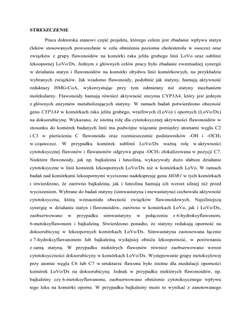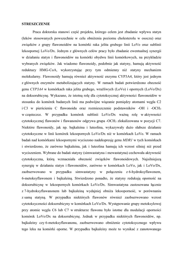 STRESZCZENIE Praca doktorska stanowi część projektu, którego celem jest zbadanie wpływu statyn (leków stosowanych powszechnie w celu obniżenia poziomu cholesterolu w osoczu) oraz związków z grupy flawonoidów na komórki raka jelita grubego linii LoVo oraz sublinii lekoopornej LoVo/Dx. Jednym z głównych celów pracy było zbadanie ewentualnej synergii w działaniu statyn i flawonoidów na komórki obydwu linii komórkowych, na przykładzie wybranych związków. Jak wiadomo flawonoidy, podobnie jak statyny, hamują aktywność reduktazy HMG-CoA, wykorzystując przy tym odmienny niż statyny mechanizm molekularny. Flawonoidy hamują również aktywność enzymu CYP3A4, który jest jednym z głównych enzymów metabolizujących statyny. W ramach badań potwierdzono obecność genu CYP3A4 w komórkach raka jelita grubego, wrażliwych (LoVo) i opornych (LoVo/Dx) na doksorubicynę. Wykazano, że istotną rolę dla cytotoksycznej aktywności flawonoidów w stosunku do komórek badanych linii ma podwójne wiązanie pomiędzy atomami węgla C2 i C3 w pierścieniu C flawonoidu oraz rozmieszczenie podstawników -OH i -OCH3 w cząsteczce. W przypadku komórek sublinii LoVo/Dx ważną rolę w aktywności cytotoksycznej flawonów i flawanonów odgrywa grupa -OCH3 zlokalizowana w pozycji C7. Niektóre flawonoidy, jak np. bajkaleina i luteolina, wykazywały dużo słabsze działanie cytotoksyczne w linii komórek lekoopornych LoVo/Dx niż w komórkach LoVo. W ramach badań nad komórkami lekoopornymi wyciszono nadekspresję genu MDR1 w tych komórkach i stwierdzono, że zarówno bajkaleina, jak i luteolina hamują ich wzrost silniej niż przed wyciszeniem. Wybrane do badań statyny (simwastatyna i mewastatyna) cechowała aktywność cytotoksyczna, którą wzmacniała obecność związków flawonoidowych. Najsilniejszą synergię w działaniu statyn i flawonoidów, zarówno w komórkach LoVo, jak i LoVo/Dx, zaobserwowano w przypadku simwastatyny w połączeniu z 6-hydroksyflawonem, 6-metoksyflawonem i bajkaleiną. Stwierdzono ponadto, że statyny redukują oporność na doksorubicynę w lekoopornych komórkach LoVo/Dx. Simwastatyna zastosowana łącznie z 7-hydroksyflawanonem lub bajkaleiną wydajniej obniża lekooporność, w porównaniu z samą statyną. W przypadku niektórych flawonów również zaobserwowano wzrost cytotoksyczności doksorubicyny w komórkach LoVo/Dx. Występowanie grupy metoksylowej przy atomie węgla C6 lub C7 w strukturze flawonu było istotne dla modulacji oporności komórek LoVo/Dx na doksorubicynę. Jednak w przypadku niektórych flawonoidów, np. bajkaleiny czy 6-metoksyflawanonu, zaobserwowano obniżenie cytotoksycznego wpływu tego leku na komórki oporne. W przypadku bajkaleiny może to wynikać z zanotowanego wzrostu ekspresji białka P-gp w komórkach LoVo/Dx w obecności tego flawonu. Oznaczona też została ekspresja białka PCNA w obecności flawonoidów i statyn. Stwierdzono, że wszystkie badane związki obniżają ekspresję PCNA, co wskazuje na hamowanie przez nie proliferacji komórek nowotworowych LoVo i LoVo/Dx. Flawony: 6-hydroksyflawon, chryzyna, luteolina i wogonina indukują również proces apoptozy w obydwu badanych liniach komórkowych, przy czym chryzyna, luteolina i wogonina stymulują aktywność kaspazy 3, jednego z kluczowych enzymów tego procesu. Indukcję apoptozy poprzez aktywację kaspazy 3 stwierdzono także w obecności simwastatyny i mewastatyny. W przypadku zastosowania kombinacji simwastatyny z 6-metoksyflawonem lub bajkaleiną stwierdzono dodatkowy wzrost aktywności proapoptotycznej w stosunku do obydwu badanych linii komórkowych, w porównaniu z działaniem poszczególnych związków oddzielnie. Wszystkie badane substancje zmieniają termotropowe właściwości błon lipidowych utworzonych z fosfatydylocholiny DPPC. Z badań mikrokalorymetrycznych wynika, że na właściwości biofizyczne dwuwarstwy lipidowej najsilniej wpływają następujące związki flawonoidowe: wogonina, luteolina, 6-hydroksyflawanon oraz 7-metoksyflawon. Flawonoidy te mogą wiązać się z dwuwarstwą lipidową, zarówno w obrębie hydrofilowych główek, jak i hydrofobowego rdzenia błony. W przypadku statyn wykazano zdolność simwastatyny do głębszej penetracji dwuwarstwy lipidowej w porównaniu z mewastatyną.