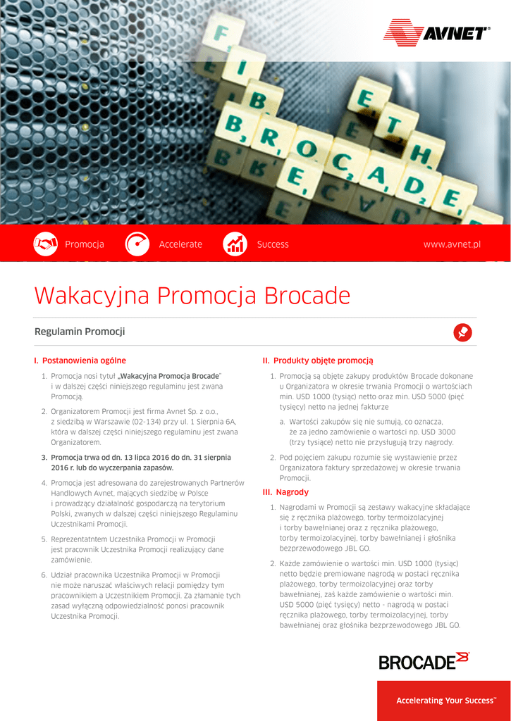 Promocja Accelerate Success www.avnet.pl Wakacyjna Promocja Brocade Regulamin Promocji I. Postanowienia ogólne 1. Promocja nosi tytuł „Wakacyjna Promocja Brocade” i w dalszej części niniejszego regulaminu jest zwana Promocją. 2. Organizatorem Promocji jest firma Avnet Sp. z o.o., z siedzibą w Warszawie (02-134) przy ul. 1 Sierpnia 6A, która w dalszej części niniejszego regulaminu jest zwana Organizatorem. 3. Promocja trwa od dn. 13 lipca 2016 do dn. 31 sierpnia 2016 r. lub do wyczerpania zapasów. 4. Promocja jest adresowana do zarejestrowanych Partnerów Handlowych Avnet, mających siedzibę w Polsce i prowadzący działalność gospodarczą na terytorium Polski, zwanych w dalszej części niniejszego Regulaminu Uczestnikami Promocji. 5. Reprezentatntem Uczestnika Promocji w Promocji jest pracownik Uczestnika Promocji realizujący dane zamówienie. 6. Udział pracownika Uczestnika Promocji w Promocji nie może naruszać właściwych relacji pomiędzy tym pracownikiem a Uczestnikiem Promocji. Za złamanie tych zasad wyłączną odpowiedzialność ponosi pracownik Uczestnika Promocji. II. Produkty objęte promocją 1. Promocją są objęte zakupy produktów Brocade dokonane u Organizatora w okresie trwania Promocji o wartościach min. USD 1000 (tysiąc) netto oraz min. USD 5000 (pięć tysięcy) netto na jednej fakturze a. Wartości zakupów się nie sumują, co oznacza, że za jedno zamówienie o wartości np. USD 3000 (trzy tysiące) netto nie przysługują trzy nagrody. 2. Pod pojęciem zakupu rozumie się wystawienie przez Organizatora faktury sprzedażowej w okresie trwania Promocji. III. Nagrody 1. Nagrodami w Promocji są zestawy wakacyjne składające się z ręcznika plażowego, torby termoizolacyjnej i torby bawełnianej oraz z ręcznika plażowego, torby termoizolacyjnej, torby bawełnianej i głośnika bezprzewodowego JBL GO. 2. Każde zamówienie o wartości min. USD 1000 (tysiąc) netto będzie premiowane nagrodą w postaci ręcznika plażowego, torby termoizolacyjnej oraz torby bawełnianej, zaś każde zamówienie o wartości min. USD 5000 (pięć tysięcy) netto - nagrodą w postaci ręcznika plażowego, torby termoizolacyjnej, torby bawełnianej oraz głośnika bezprzewodowego JBL GO. Regulamin Promocji, cd. 3. Nagrody będą przesyłane Uczestnikom Promocji w okresie do 7 dni roboczych od daty wystawienia przez Organizatora faktury sprzedażowej lub będą do odebrania przez Uczestnika Promocji w siedzibie Organizatora (do uzgodnienia pomiędzy Organizatorem a Uczestnikiem Promocji). VI. Postanowienia dodatkowe 4. Obowiązek podatkowy spoczywa po stronie Uczestnika Promocji. 5. Za osobę uprawnioną do odbioru nagrody w imieniu Uczestnika Promocji przyjmuje się pracownika Uczestnika Promocji, który realizował dane zamówienie, chyba że osoba decyzyjna Uczestnika Promocji podejmie inną decyzję i swoją wolę wyrazi na piśmie, a następnie prześle pod adres e-mail: [email protected]. 1. Wszelkie pytania, wątpliwości i uwagi związane z Promocją będą przyjmowane przez cały czas trwania Promocji pod adresem Organizatora: Avnet Sp. z o.o., ul. 1 Sierpnia 6a, 02-134 Warszawa. 2. W kwestiach nieuregulowanych niniejszym Regulaminem stosuje się przepisy Kodeksu Cywilnego. 3. Niniejszy Regulamin wchodzi w życie z dniem 13.07.2016 r. IV. Postanowienie końcowe 1. Nie istnieje możliwość zamiany nagrody w Promocji na inną nagrodę. 2. Organizator zastrzega sobie prawo do weryfikacji faktur wystawionych za zakup produktów objętych Promocją w okresie trwania Promocji. 3. Organizator zastrzega sobie prawo do zmiany nagrody lub odwołania Promocji bez podania przyczyny. 4. Obowiązek zapłacenia podatku od nagrody w Promocji spoczywa po stronie Uczestnika Promocji. 5. W przypadku jakichkolwiek zmian w niniejszym Regulaminie Organizator niezwłocznie poinformuje o tym Uczestników Promocji drogą elektroniczną (e-mail). V. Postępowanie reklamacyjne 1. Wszelkie reklamacje z tytułu Promocji powinny być składane na piśmie, na adres Organizatora: Avnet Sp. z o.o. , ul. 1 Sierpnia 6a, 02-134 Warszawa nie później niż w terminie 7 dni roboczych od daty zakończenia Promocji. 2. Reklamacje będą rozpatrywane w terminie 7 dni roboczych od dnia otrzymania pisma, po czym Uczestnik Promocji otrzyma pisemną informację o zajętym stanowisku.. Masz pytania dotyczące Promocji? Adam Bandura — Business Development Manager, e-mail: [email protected] tel.: +48 22 878 77 43, +48 691 464 474 © 2016 Avnet, Inc. Wszystkie prawa zastrzeżone Logo Avnet oraz hasło „Accelerating Your Success” stanowią znaki towarowe firmy Avnet, Inc. Wszystkie pozostałe produkty, marki i nazwy stanowią znaki towarowe lub zarejestrowane znaki towarowe innych podmiotów. Avnet Sp. z o.o., ul. 1 Sierpnia 6a, Warszawa, tel.: +48 22 878 77 22, fax: +48 22 878 77 33, www.avnet.pl