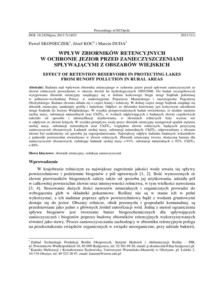 Proceedings of ECOpole DOI: 10.2429/proc.2013.7(1)033 2013;7(1) Paweł SKONIECZEK1, Józef KOC2 i Marcin DUDA2 WPŁYW ZBIORNIKÓW RETENCYJNYCH W OCHRONIE JEZIOR PRZED ZANIECZYSZCZENIAMI SPŁYWAJĄCYMI Z OBSZARÓW WIEJSKICH EFFECT OF RETENTION RESERVOIRS IN PROTECTING LAKES FROM RUNOFF POLLUTION IN RURAL AREAS Abstrakt: Badania nad wpływem zbiornika retencyjnego w ochronie jezior przed spływem zanieczyszczeń ze zlewni rolniczych prowadzono w okresie dwóch lat hydrologicznych 2005/2006. Do badań szczegółowych wytypowano zbiornik retencyjny znajdujący się w dolinie końcowego biegu strugi Sząbruk położonej w północno-wschodniej Polsce, w makroregionie Pojezierza Mazurskiego i mezoregionie Pojezierza Olsztyńskiego. Badana zlewnia składa się z części leśnej i rolniczej. W dolnej części strugi Sząbruk znajduje się zbiornik retencyjny zamknięty groblą i mnichem. Odpływ ze zbiornika kierowany jest końcowym odcinkiem strugi Sząbruk do Jeziora Wulpińskiego. W wyniku przeprowadzonych badań stwierdzono, iż średnie stężenie suchej masy, substancji mineralnych oraz ChZTCr w wodach odpływających z badanych zlewni cząstkowych zależało od sposobu i intensyfikacji użytkowania, w zlewniach rolniczych były wyższe niż w odpływie ze zlewni leśnych. W wyniku przepływu wody przez zbiornik retencyjny następował spadek stężenia suchej masy, substancji mineralnych oraz ChZTCr względem zlewni rolniczych, będących przyczyną zanieczyszczeń obszarowych. Ładunek suchej masy, substancji mineralnych, ChZTCr odprowadzany z obszaru zlewni był uzależniony od sposobu jej zagospodarowania. Największy odpływ ładunku badanych wskaźników z jednostki powierzchni stwierdzono w zlewni rolniczych. Zbiornik retencyjny tworzy skuteczną barierę dla zanieczyszczeń obszarowych, redukując ładunek suchej masy o 91%, substancji mineralnych o 92%, ChZTCr o 88%. Słowa kluczowe: zbiornik retencyjny, redukcja zanieczyszczeń Wprowadzenie W krajobrazie rolniczym za największe zagrożenie jakości wody uważa się spływy powierzchniowe i podziemne biogenów z pól uprawnych [1, 2]. Ilość wynoszonych ze zlewni pierwiastków biogennych zależy także od sposobu jej użytkowania, udziału pól w całkowitej powierzchni zlewni oraz intensywności rolnictwa, w tym wielkości nawożenia [3, 4]. Stosowanie dużych ilości nawozów mineralnych i organicznych prowadzi do wzbogacenia gleb w składniki pokarmowe. Rośliny nie są w stanie ich w pełni wykorzystać, a ich nadmiar poprzez spływ powierzchniowy bądź z wodami gruntowymi dostaje się do jezior. Obszary rolnicze, obok przemysłu i gospodarki komunalnej, są przedstawiane jako jedno z głównych źródeł eutrofizacji wód. Jedną z metod ograniczenia spływu biogenów jest tworzenie barier biogeochemicznych dla spływających zanieczyszczeń i biogenów poprzez budowę zbiorników retencyjnych wykorzystywanych również jako stawy. Proces samooczyszczania zachodzący w zbiorniku retencyjnym polega na przekształceniu związków organicznych w związki nieorganiczne, przy udziale bakterii, 1 Zakład Technologii Produkcji Roślin Okopowych, Instytut Hodowli i Aklimatyzacji Roślin - PIB, ul. Powstańców Wielkopolskich 10, 85-090 Bydgoszcz, tel. 52 581 69 20, email: [email protected] 2 Katedra Melioracji i Kształtowania Środowiska, Uniwersytet Warmińsko-Mazurski w Olsztynie, pl. Łódzki 2, 10-719 Olsztyn, tel. 89 523 38 97, email: [email protected] 248 Paweł Skonieczek, Józef Koc i Marcin Duda kosztem pobierania z wody tlenu [5, 6] oraz na zatrzymaniu i przechwyceniu zanieczyszczeń przez roślinność wodną [7]. Celem niniejszej pracy było wykazanie znaczenia funkcjonowania zbiornika retencyjnego jako bariery przechwytującej zanieczyszczenia pochodzenia antropogennego (sucha masa, substancje mineralne, ChZTCr) przenikające do wód powierzchniowych z obszaru zlewni rolniczej oraz określenie roli tego zbiornika w ochronie pobliskiego jeziora. Materiał i metody Badania nad znaczeniem zbiornika retencyjnego w przemieszczaniu substancji niesionych z wodą w zlewni rolniczej prowadzono w okresie dwóch lat hydrologicznych 2005/2006. Rys. 1. Lokalizacja stanowisk badawczych w zlewni strugi Sząbruk Fig. 1. Location of study sites on the Sząbruk stream Znaczenie zbiornika retencyjnego w ochronie jeziora przed zanieczyszczeniami spływającymi … 249 Do badań szczegółowych wytypowano zbiornik retencyjny położony w dolinie końcowego biegu strugi Sząbruk zlokalizowanej w północno-wschodniej Polsce, w makroregionie Pojezierza Mazurskiego i mezoregionie Pojezierza Olsztyńskiego. Zlewnia strugi Sząbruk składa się z części leśnej i rolniczej. Powierzchnia zlewni wynosi 13,2 km2, w tym część zalesiona - 4,4 km2, co stanowi 33% całkowitej powierzchni zlewni. Do czerwca 2005 r. odprowadzane były do strugi ścieki z 2 podczyszczalni ścieków. W dolnej części doliny strugi Sząbruk znajduje się zbiornik retencyjny wykonany przed 30 laty. Odpływ został zamknięty groblą i mnichem, tworząc zbiornik retencyjny o powierzchni 24,80 ha i maksymalnej głębokości 1,51 m. Odpływ ze zbiornika kierowany jest końcowym odcinkiem strugi Sząbruk do Jeziora Wulpińskiego, w którym wody ze zbiornika i rowu opaskowego mieszają się. Prowadzone badania obejmowały pomiary hydrologiczne oraz analizy laboratoryjne. Pomiary przepływu wykonywano poniżej zlewni leśnej, na dopływie do stawu i rowu opaskowego, na odpływie ze zbiornika i rowu opaskowego oraz na dopływie do Jeziora Wulpińskiego. Mierzono również odpływy z dwóch zlewni drenarskich, zasilających bezpośrednio zbiornik retencyjny i rów opaskowy. Pomiary wykonywano raz w tygodniu przy użyciu elektromagnetycznego miernika przepływu firmy VALEPORT, przy małym przepływie (poniżej 2 dm3·s–1) stosowano metodę wolumetryczną. Próbki wód do analiz fizykochemicznych pobierano raz na dwa miesiące z 7 wybranych stanowisk (rys. 1) i oznaczano w