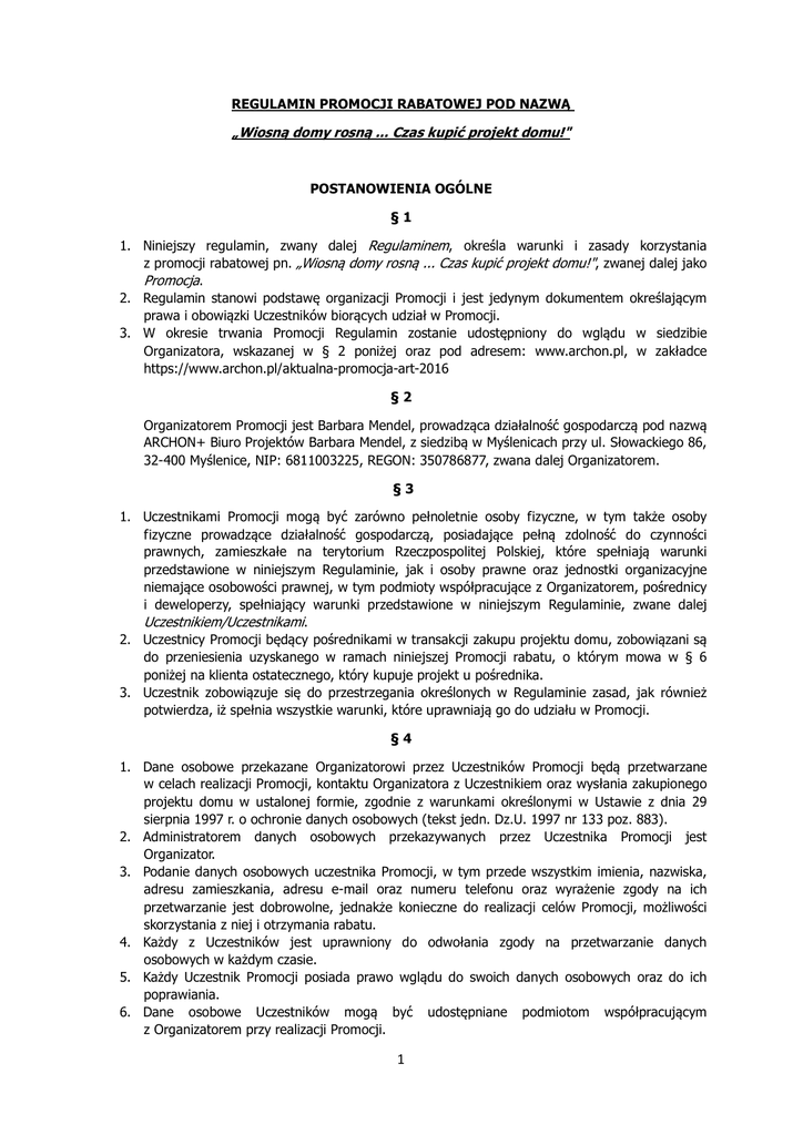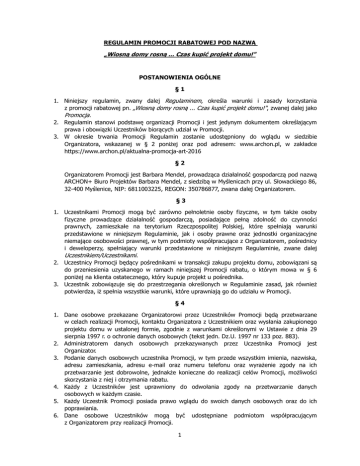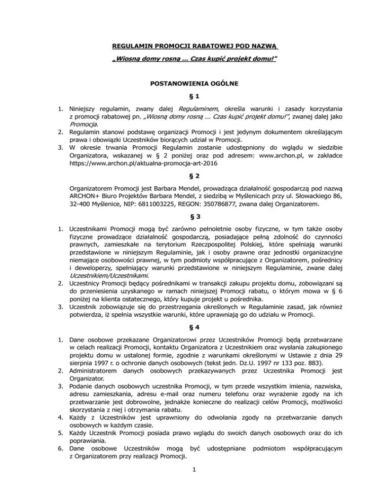 REGULAMIN PROMOCJI RABATOWEJ POD NAZWĄ „Wiosną domy rosną ... Czas kupić projekt domu!" POSTANOWIENIA OGÓLNE §1 1. Niniejszy regulamin, zwany dalej Regulaminem, określa warunki i zasady korzystania z promocji rabatowej pn. „Wiosną domy rosną ... Czas kupić projekt domu!", zwanej dalej jako Promocja. 2. Regulamin stanowi podstawę organizacji Promocji i jest jedynym dokumentem określającym prawa i obowiązki Uczestników biorących udział w Promocji. 3. W okresie trwania Promocji Regulamin zostanie udostępniony do wglądu w siedzibie Organizatora, wskazanej w § 2 poniżej oraz pod adresem: www.archon.pl, w zakładce https://www.archon.pl/aktualna-promocja-art-2016 §2 Organizatorem Promocji jest Barbara Mendel, prowadząca działalność gospodarczą pod nazwą ARCHON+ Biuro Projektów Barbara Mendel, z siedzibą w Myślenicach przy ul. Słowackiego 86, 32-400 Myślenice, NIP: 6811003225, REGON: 350786877, zwana dalej Organizatorem. §3 1. Uczestnikami Promocji mogą być zarówno pełnoletnie osoby fizyczne, w tym także osoby fizyczne prowadzące działalność gospodarczą, posiadające pełną zdolność do czynności prawnych, zamieszkałe na terytorium Rzeczpospolitej Polskiej, które spełniają warunki przedstawione w niniejszym Regulaminie, jak i osoby prawne oraz jednostki organizacyjne niemające osobowości prawnej, w tym podmioty współpracujące z Organizatorem, pośrednicy i deweloperzy, spełniający warunki przedstawione w niniejszym Regulaminie, zwane dalej Uczestnikiem/Uczestnikami. 2. Uczestnicy Promocji będący pośrednikami w transakcji zakupu projektu domu, zobowiązani są do przeniesienia uzyskanego w ramach niniejszej Promocji rabatu, o którym mowa w § 6 poniżej na klienta ostatecznego, który kupuje projekt u pośrednika. 3. Uczestnik zobowiązuje się do przestrzegania określonych w Regulaminie zasad, jak również potwierdza, iż spełnia wszystkie warunki, które uprawniają go do udziału w Promocji. §4 1. Dane osobowe przekazane Organizatorowi przez Uczestników Promocji będą przetwarzane w celach realizacji Promocji, kontaktu Organizatora z Uczestnikiem oraz wysłania zakupionego projektu domu w ustalonej formie, zgodnie z warunkami określonymi w Ustawie z dnia 29 sierpnia 1997 r. o ochronie danych osobowych (tekst jedn. Dz.U. 1997 nr 133 poz. 883). 2. Administratorem danych osobowych przekazywanych przez Uczestnika Promocji jest Organizator. 3. Podanie danych osobowych uczestnika Promocji, w tym przede wszystkim imienia, nazwiska, adresu zamieszkania, adresu e-mail oraz numeru telefonu oraz wyrażenie zgody na ich przetwarzanie jest dobrowolne, jednakże konieczne do realizacji celów Promocji, możliwości skorzystania z niej i otrzymania rabatu. 4. Każdy z Uczestników jest uprawniony do odwołania zgody na przetwarzanie danych osobowych w każdym czasie. 5. Każdy Uczestnik Promocji posiada prawo wglądu do swoich danych osobowych oraz do ich poprawiania. 6. Dane osobowe Uczestników mogą być udostępniane podmiotom współpracującym z Organizatorem przy realizacji Promocji. 1 7. Uczestnik wyraża zgodę na otrzymywanie, w tym na otrzymanie drogą elektroniczną na podany adres e-mail oraz numer telefonu, informacji handlowych wysyłanych przez Organizatora, zgodnie z Ustawą z dnia 18 lipca 2002 r. o świadczeniu usług drogą elektroniczną (teks jedn. Dz.U. 2002 nr 144 poz. 1204). §5 1. Promocja ograniczona jest czasowo – rozpoczyna się w dniu 24.02.2017 r. o godzinie 8:00, a kończy w dniu 28.02.2017 r. o godzinie 8:00. 2. Promocja prowadzona jest na całym obszarze Rzeczpospolitej Polskiej. ZASADY PROMOCJI §6 Celem Promocji jest umożliwienie Uczestnikom dokonania zakupu wybranego projektu domu jedno i dwurodzinnego (zarówno w wersji podstawowej jak i w pełno branżowym odbiciu lustrzanym), a także projektu budynku wielorodzinnego, z rabatem w wysokości 250 zł brutto (słownie: dwieście pięćdziesiąt złotych), która to kwota odejmowana będzie od pierwotnej, podstawowej ceny danego projektu określonej w aktualnie obowiązującym cenniku, zwanym dalej jako Rabat. §7 1. Osoba, która chce skorzystać z Promocji, powinna w trakcie jej obowiązywania, złożyć zamówienie na zakup wybranego projektu domu, dostępnego w ramach usług świadczonych przez Organizatora. 2. Zamówienia składane mogą być: telefonicznie pod numerem: 12 37 21 900; mailowo na adres: [email protected]; poprzez formularz dostępny na stronie internetowej www.archon.pl (strona produktowa konkretnego projektu domu); osobiście – w siedzibie firmy ARCHON+, Oddziałach oraz u Przedstawicieli ARCHON+ na terenie całego kraju. 3. Rabat zostanie uwzględniony w końcowej cenie zakupu projektu i naliczony automatycznie. 4. Przyznany zgodnie z warunkami Promocji Rabat zostanie uwidoczniony na fakturze/paragonie. §8 1. Uczestnik dokonujący zakupu projektu domu może skorzystać w ramach tego zakupu tylko z jednej promocji dotyczącej projektu domu. 2. Niniejsza Promocja nie łączy się z innymi promocjami na zakup projektu domu. 3. Możliwe jest łączne skorzystanie z niniejszej Promocji rabatowej z promocją na zakup produktów oferowanych przez Organizatora nie będących projektem domu, przykładowo takich jak: kosztorys, projekty dodatkowych instalacji, projekty altan, itp. 2 POSTANOWIENIA KOŃCOWE §9 1. Ewentualne reklamacje dotyczące przebiegu Promocji Uczestnicy zobowiązani są przesłać w formie pisemnej, listem poleconym, na adres Organizatora wskazany w § 2. 2. Reklamacja powinna zawierać w szczególności dane umożliwiające kontakt ze zgłaszającym, tj. imię, nazwisko, adres pocztowy. Ponadto konieczne jest zwięzłe określenie, czego reklamacja dotyczy, podanie okoliczności uzasadniających jej złożenie i ewentualnie wskazanie żądanego sposobu usunięcia zarzucanego naruszenia. 3. Reklamacje będą rozpatrywane w terminie 14 dni od dnia otrzymania listu poleconego przez Organizatora. 4. O rozpatrzeniu 