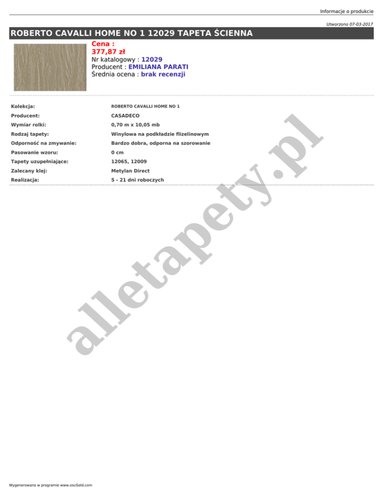 Informacje o produkcie Utworzono 07-03-2017 ROBERTO CAVALLI HOME NO 1 12029 TAPETA ŚCIENNA Cena : 377,87 zł ROBERTO CAVALLI HOME NO 1 Producent: CASADECO Wymiar rolki: 0,70 m x 10,05 mb Rodzaj tapety: Winylowa na podkładzie flizelinowym Odporność na zmywanie: Bardzo dobra, odporna na szorowanie Pasowanie wzoru: 0 cm Tapety uzupełniające: 12065, 12009 Zalecany klej: Metylan Direct Realizacja: 5 - 21 dni roboczych al le ta pe ty Kolekcja: .p l Nr katalogowy : 12029 Producent : EMILIANA PARATI Średnia ocena : brak recenzji Wygenerowano w programie www.oscGold.com
