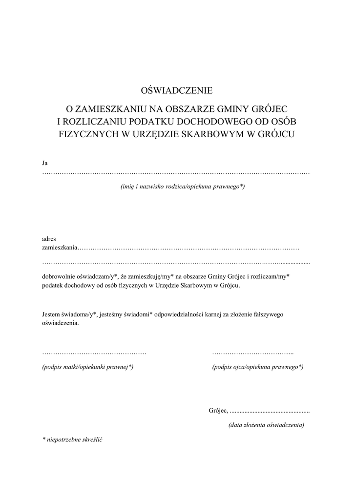 OŚWIADCZENIE O ZAMIESZKANIU NA OBSZARZE GMINY GRÓJEC I ROZLICZANIU PODATKU DOCHODOWEGO OD OSÓB FIZYCZNYCH W URZĘDZIE SKARBOWYM W GRÓJCU Ja …………………………………………………………………………………………………………… (imię i nazwisko rodzica/opiekuna prawnego*) adres zamieszkania………………………………………………………………………………………… ………………………………………………………………………………………….……................... dobrowolnie oświadczam/y*, że zamieszkuję/my* na obszarze Gminy Grójec i rozliczam/my* podatek dochodowy od osób fizycznych w Urzędzie Skarbowym w Grójcu. Jestem świadoma/y*, jesteśmy świadomi* odpowiedzialności karnej za złożenie fałszywego oświadczenia. ………………………………………… ……………………………….. (podpis matki/opiekunki prawnej*) (podpis ojca/opiekuna prawnego*) Grójec, ................................................. (data złożenia oświadczenia) * niepotrzebne skreślić