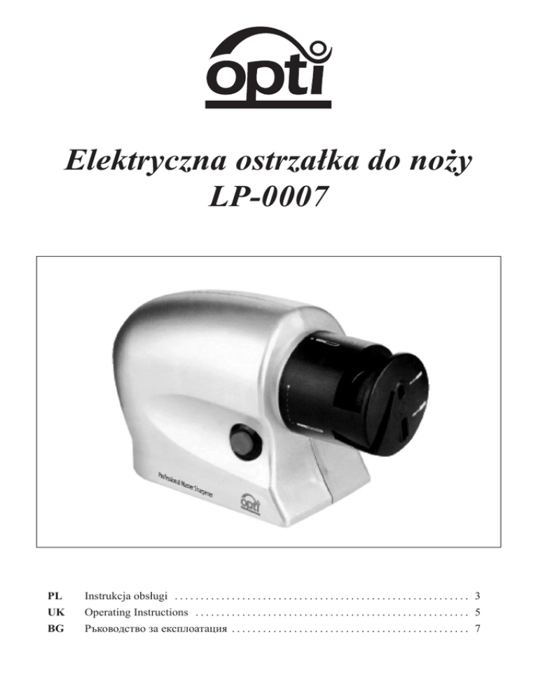 Elektryczna ostrzałka do noży LP-0007 PL Instrukcja obsługi . . . . . . . . . . . . . . . . . . . . . . . . . . . . . . . . . . . . . . . . . . . . . . . . . . . . . . . . . . 3 UK Operating Instructions . . . . . . . . . . . . . . . . . . . . . . . . . . . . . . . . . . . . . . . . . . . . . . . . . . . . . . 5 BG Ръководство за експлоатация . . . . . . . . . . . . . . . . . . . . . . . . . . . . . . . . . . . . . . . . . . . . . . . 7 ELEKTRYCZNA OSTRZAŁKA DO NOŻY LP-0007 KARTA GWARANCYJNA NR .............. Ważna wraz z dowodem zakupu Sprzęt przeznaczony wyłącznie do użytku domowego Nazwa sprzętu: ................................................................................... Typ, model: ......................................................................................... Data sprzedaży: .................................................................................. ................................................. pieczątka i podpis sprzedawcy Warunki gwarancji Produkt objęty jest 24-miesięczną gwarancją od daty jego zakupu. Gwarancja dotyczy wyrobów zakupionych w Polsce i jest ważna na terytorium Rzeczypospolitej Polskiej. W tym okresie istnieje wygodna możliwość wymiany uszkodzonego produktu na nowy w miejscu jego zakupu (termin na rozpatrzenie reklamacji wynosi 14 dni). Podstawą do wymiany jest czytelnie wypełniona karta gwarancyjna z załączonym do niej dowodem zakupu produktu. Niniejsza gwarancja nie obejmuje uszkodzeń powstałych w wyniku nieprawidłowego użytkowania produktu, uszkodzeń mechanicznych lub samowolnych napraw. Gwarancja nie wyłącza, nie ogranicza ani nie zawiesza uprawnień kupującego wynikających z niezgodności towaru z umową. SERWIS ARCONET ul. Dr Jana Huberta 41 05-300 MIŃSK MAZOWIECKI tel. (25)759-12-31, INFOLINIA: 0801-44-33-22 LISTA PUNKTÓW SERWISOWYCH: www.arconet.pl IMPORTER / DYSTRYBUTOR: Expo-service Sp. z o. o. 00-710 Warszawa, Al. Witosa 31/22, Polska tel. +48 25 759 1881, fax +48 25 759 1885 [email protected] www.opti.hoho.pl 2 Adres do korespondencji: Expo-service Sp. z o. o. 05-300 Mińsk Mazowiecki ul. Grobelnego 4 LP0700_IM_PL_UK_BG_RO_13062013 PL INSTRUKCJA OBSŁUGI Elektryczna ostrzałka do noży LP-0007 PRZED PIERWSZYM UŻYCIEM -Rozpakować urządzenie i jego części, sprawdzając czy wszystkie są w dobrym stanie. - Zapoznać się dokładnie z niniejszą instrukcją, a następnie przestrzegać zaleceń dotyczących obsługi i bezpieczeństwa. Zachować niniejszą instrukcję i poinformować o niej przyszłych użytkowników urządzenia. CHARAKTERYSTYKA -Elektryczna ostrzałka do noży kuchennych i nożyczek ze stali nierdzewnej. Nie nadaje się do noży z ząbkami. - Zasilanie: 220-240 V~ 50 Hz 10 W. - 6-pozycyjny, obrotowy układ ostrzący. ZALECENIA DOTYCZĄCE BEZPIECZEŃSTWA 1. Urządzenie jest zgodne z obowiązującymi normami dotyczącymi tego rodzaju produktów. 2. Urządzenie jest przeznaczony do pracy z lokalnym zasilaniem sieciowym. 3.Jeśli konieczne jest użycie przedłużacza, powinien on być uziemiony i ułożony tak, aby nie stwarzać ryzyka zaplątania się w przewód. 4. Powierzchnia robocza powinna być stabilna i sucha. Nie wolno umieszczać urządzenia na gorących powierzchniach. 5. Nie dopuszczać, aby przewód zasilający stykał się z gorącymi powierzchniami. 6. OSTRZEŻENIE: Nie wolno zanurzać urządzenia w wodzie lub innej cieczy. 7. Nie włączać urządzania, jeśli jest puste. 8.Postępować zgodnie z instrukcją obsługi. W przeciwnym razie urządzenie może się nagle wyślizgnąć, co grozi urazem. 9. UWAGA: Nie zwilżać ani nie smarować osełki, gdyż może stać się niezdatna do użytku. 10. Zawsze zachować ostrożność podczas pracy urządzenia. 11.Nie odłączać pokrętła wyboru ostrzałki podczas pracy urządzenia. 12. Nie pozostawiać włączonego urządzenia bez nadzoru. 13.Urządzenie nie jest przeznaczone dla osób (w tym dzieci) o ograniczonych zdolnościach fizycznych, czuciowych lub umysłowych, bądź osób nieposiadających doświadczenia i odpowiedniej wiedzy, chyba że są one nadzorowane przez osobę odpowiedzialną za ich bezpieczeństwo lub otrzymały od niej wskazówki dotyczące używania urządzenia. 14. Dzieci powinny znajdować się pod nadzorem, aby uniemożliwić im zabawę urządzeniem. 15. To urządzenie nie jest zabawką. Chronić przed dziećmi. 16. Nie używać urządzenia, jeśli przewód zasilający jest wadliwy. W takim przypadku nie wolno wymieniać przewodu zasilającego samodzielnie – powinien go wymienić wykwalifikowany specjalista. 17. Urządzenie należy odłączyć od zasilania: - po każdym użyciu, - przed jego przenoszeniem, - jeśli nie działa prawidłowo. 18. Urządzenie jest przeznaczone wyłącznie do użytku domowego. Użycie do zastosowań profesjonalnych, niewłaściwe użycie lub użycie niezgodne z instrukcją obsługi skutkuje wyłączeniem odpowiedzialności producenta i nie jest objęte gwarancją. OPIS: 1.Wyłącznik 2. Pokrętło wyboru ostrzałki Pozycja wskaźnika Uwaga: W celu zapoznania się z urządzeniem zalecamy najpierw naostrzyć stary przedmiot. Niewłaściwe ostrzenie przedmiotów może spowodować uszkodzenie ostrza. OBSŁUGA - Sprawdzić, czy ostrzałka jest sucha i czy nie jest zabrudzona smarem. -Umieścić urządzenie na płaskiej powierzchni. Podłączyć urządzenie do gniazdka sieciowego. - Ustawić odpowiednio pokrętło wyboru ostrzałki (2) w zależności od rodzaju ostrzonego przedmiotu. Pokrętło wyboru ostrzałki przekręcać do momentu, aż umieszczony na nim wskaźnik (biała kropka z symbolem przedmiotu) nie znajdzie się na szczycie urządzenia. Uwaga: Symbol <=> jest przeznaczony wyłącznie do odłączania pokrętła wyboru ostrzałki (2). Nie wolno go wybierać w celu naostrzenia przedmiotu. 3 -Przytrzymując urządzenie lewą ręką, nacisnąć przycisk Start/Stop (1) lewym kciukiem – osełka zacznie się obracać. Po zwolnieniu przyci