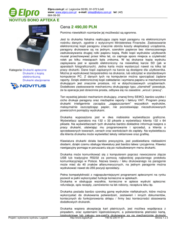 Elpro.com.pl: ul. Legionów 93/95, 91-072 Łódź www: www.elpro.com.pl e-mail: [email protected] tel: (42) 664-06-00 NOVITUS BONO APTEKA E Cena 2 490,00 PLN Pomimo niewielkich rozmiarów jej możliwości są ogromne. Kategorie Drukarki apteczne Drukarki z kopią elektroniczną Drukarki stacjonarne Jest to drukarka fiskalna realizująca zapis kopii paragonu na elektronicznym nośniku danych, zgodnie z wytycznymi Ministerstwa Finansów. Zastosowanie elektronicznej kopii paragonu znacznie obniża koszty eksploatacji urządzenia, paragony drukowane są na jednym, szerokim papierze bez równoczesnego zadrukowywania drugiej rolki papieru kopią. Rolki kopii wydruków użytkownik musiał przechowywać przez kilka lat, co zajmuje sporo miejsca a czytelność rolek po kilku miesiącach była znikoma. W tej drukarce kopia wydruku zapisywana jest w sposób elektroniczny na niewielkiej karcie SD (jak w aparatach fotograficznych). Jedna karta może wystarczyć nawet na kilka lat pracy drukarki. Dane kopii zapisanych na karcie są dostępne dla użytkownika. Można je wydrukować bezpośrednio na drukarce, lub odczytać w standardowym komputerze PC. Z danych tych na komputerze można sporządzać żądane raporty. Dzięki elektronicznej kopii zakładanie i wymiana papieru w mechanizmie drukującym jest znacznie prostsze, niż w dotychczasowych urządzeniach. Dodatkowo zastosowanie mechanizmu drukującego typu „clamshell” powoduje, że ta operacja jest dziecinnie prosta, odbywa się na zasadzie: „wrzuć i pracuj”. Ten wysokiej jakości mechanizm drukujący, znanej firmy SEIKO, bardzo szybko i cicho drukuje paragony oraz niezbędne raporty i faktury VAT. Program pracy drukarki inteligentnie zarządza „zagęszczaniem” wszystkich wydruków, maksymalnie oszczędzając papier, nie pozostawiając niezadrukowanych powierzchni pomiędzy wydrukami. Drukarka wyposażona jest w dwa niebieskie wyświetlacze graficzne. Wyświetlacz operatora ma 132 x 32 piksele a wyświetlacz klienta 132 x 64 piksele. Na wyświetlaczach tych drukarka bardzo dokładnie informuje kasjera o pracy drukarki, ułatwiając mu programowanie i sprzedaż, a klienta o sprzedawanych towarach, cenach oraz wartościach do zapłaty. Na wyświetlaczu dla klienta drukarka może wyświetlać teksty reklamowe oraz grafikę. Klawiatura drukarki działa bardzo precyzyjnie, jest podświetlana niebieskimi diodami, dzięki czemu obsługa klawiatury jest bardzo łatwa i przyjemna. Klawisz nawigacyjny pomaga w poruszaniu się po rozbudowanym menu drukarki. Drukarka może komunikować się z komputerem poprzez nowoczesne złącze USB lub tradycyjne RS232 za pomocą najbardziej popularnego protokołu komunikacyjnego w Polsce. Nazwa towaru / leku drukowanego na paragonie może mieć do 40 znaków alfanumerycznych, na jednym paragonie można wydrukować nawet do 255 pozycji sprzedaży. Pełna kompatybilność z najpopularniejszymi programami aptecznymi na rynku pozwoli w pełni wykorzystać funkcje konieczne w aptekach. Drukarka w obsługuje wszelkie, konieczne w aptece wydruki apteczne: refundacje, opis recepty, zamówienie na lek robiony, receptura leku itp. Drukarka posiada bardzo szeroką gamę wydruków niefiskalnych, które można wykorzystać do drukowania potwierdzeń, zestawień i innych dokumentów, koniecznych do funkcjonowania sklepu / firmy bez konieczności stosowania dodatkowych drukarek. Projekt i wykonanie wydruku: Logisoft Drukarka wspiera akceptację kart płatniczych, jest możliwa współpraca z pinpadem, oraz systemami lojalnościowymi, a potwierdzenia płatności kartą, lojalnościowe lub zakupu pre-paid’a drukowane są na mechanizmie drukarki http://www.logisoft.pl/ +48 42 235 41 51 Strona 1 z 3 fiskalnej. Dzięki zastosowaniu dwóch portów: PC i PC2 drukarka pozwala na sprzęgnięcie ze sobą różnych aplikacji, bez konieczności wykonywania w nich jakichkolwiek przeróbek. Jedna aplikacja (np. program sprzedaży) wysyła paragony poprzez port PC, a druga (np. system monitorujący albo system lojalnościowy) może je odczytywać z portu PC2. Istnieje możliwość zdefiniowania obu tych portów tak, aby drukarka była podłączona do komputera jednym kablem USB. Drukarka posiada awaryjne zasilanie akumulatorowe. Dzięki niemu, w przypadku braku zasilania zewnętrznego można drukować paragony (np. z laptopa) oraz wykonać żądane raporty. Gniazdo karty SD – elektronicznej kopii paragonu – znajduje się od spodu drukarki i jest zabezpieczone specjalną zaślepką, przykręconą śrubką. W razie konieczności użytkownik może tą zaślepkę odkręcić i wyjąć kartę elektronicznej kopii. Cechy wyróżniające drukarkę BONO E: - Ergonomiczna obudowa z plastiku - Drukarka z elektroniczną kopia paragonu (brak drugiej rolki na wydruk kopii) - Zapis elektronicznej kopii na karcie SD, dostępnej dla użytkownika - Dostęp do danych zapisanych na karcie SD z poziomu drukarki (z możliwością wydruku) - Dostęp do danych zapisanych na karcie SD z komputera z możliwością ich przeglądania, raportowania, kopiowania i archiwizowania - Dostarczony wraz z drukarką program komputerowy do odczytu danych z karty SD z funkcją raportowania i wyszukiwania oraz do odczytu danych z pamięci fiskalnej z wykonaniem autoryzowanego raportu okresowego i miesięcznego fiskalnego - Zaawansowane zarządzanie energią - Wydajny wewnętrzny akumulator - Graficzne, niebieskie wyświetlacze LCD dla kasjera i klienta. Wyświetlacz klienta: 132x64 piksele, kasjera 132x32 piksele - Podświetlana klawiatura, - Złącza komunikacyjne RS232 oraz USB - Współpraca z większością programów aptecznych przy użyciu najpopularniejszego protokołu komunikacyjnego na rynku - Nazwa towaru / leku do 40 znaków - Nawet do 255 pozycji sprzedaży na jednym paragonie - Szybki wydruk - Jeden mechanizm clamshell – bardzo łatwa i szybka wymiana papieru, brak konieczności wymiany kopii paragonu - Zaawansowany system oszczędzania papieru (brak niezadr