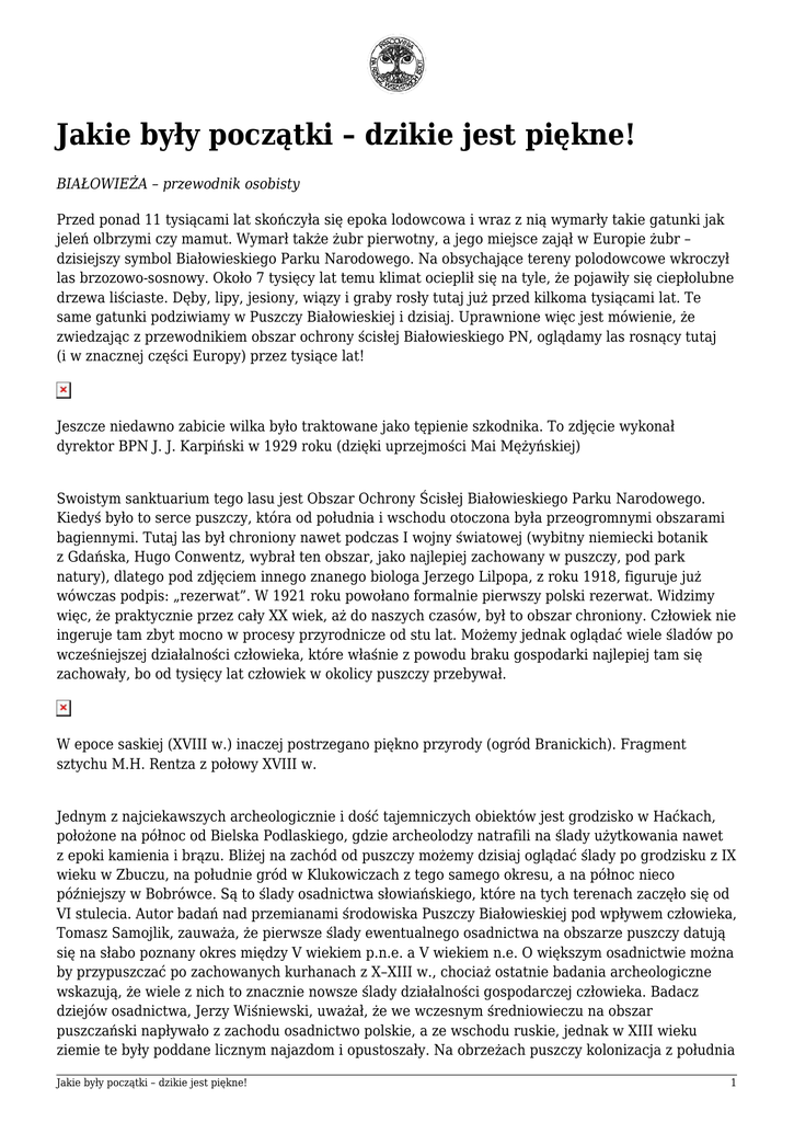 Jakie były początki – dzikie jest piękne! BIAŁOWIEŻA – przewodnik osobisty Przed ponad 11 tysiącami lat skończyła się epoka lodowcowa i wraz z nią wymarły takie gatunki jak jeleń olbrzymi czy mamut. Wymarł także żubr pierwotny, a jego miejsce zajął w Europie żubr – dzisiejszy symbol Białowieskiego Parku Narodowego. Na obsychające tereny polodowcowe wkroczył las brzozowo-sosnowy. Około 7 tysięcy lat temu klimat ocieplił się na tyle, że pojawiły się ciepłolubne drzewa liściaste. Dęby, lipy, jesiony, wiązy i graby rosły tutaj już przed kilkoma tysiącami lat. Te same gatunki podziwiamy w Puszczy Białowieskiej i dzisiaj. Uprawnione więc jest mówienie, że zwiedzając z przewodnikiem obszar ochrony ścisłej Białowieskiego PN, oglądamy las rosnący tutaj (i w znacznej części Europy) przez tysiące lat! Jeszcze niedawno zabicie wilka było traktowane jako tępienie szkodnika. To zdjęcie wykonał dyrektor BPN J. J. Karpiński w 1929 roku (dzięki uprzejmości Mai Mężyńskiej) Swoistym sanktuarium tego lasu jest Obszar Ochrony Ścisłej Białowieskiego Parku Narodowego. Kiedyś było to serce puszczy, która od południa i wschodu otoczona była przeogromnymi obszarami bagiennymi. Tutaj las był chroniony nawet podczas I wojny światowej (wybitny niemiecki botanik z Gdańska, Hugo Conwentz, wybrał ten obszar, jako najlepiej zachowany w puszczy, pod park natury), dlatego pod zdjęciem innego znanego biologa Jerzego Lilpopa, z roku 1918, figuruje już wówczas podpis: „rezerwat”. W 1921 roku powołano formalnie pierwszy polski rezerwat. Widzimy więc, że praktycznie przez cały XX wiek, aż do naszych czasów, był to obszar chroniony. Człowiek nie ingeruje tam zbyt mocno w procesy przyrodnicze od stu lat. Możemy jednak oglądać wiele śladów po wcześniejszej działalności człowieka, które właśnie z powodu braku gospodarki najlepiej tam się zachowały, bo od tysięcy lat człowiek w okolicy puszczy przebywał. W epoce saskiej (XVIII w.) inaczej postrzegano piękno przyrody (ogród Branickich). Fragment sztychu M.H. Rentza z połowy XVIII w. Jednym z najciekawszych archeologicznie i dość tajemniczych obiektów jest grodzisko w Haćkach, położone na północ od Bielska Podlaskiego, gdzie archeolodzy natrafili na ślady użytkowania nawet z epoki kamienia i brązu. Bliżej na zachód od puszczy możemy dzisiaj oglądać ślady po grodzisku z IX wieku w Zbuczu, na południe gród w Klukowiczach z tego samego okresu, a na północ nieco późniejszy w Bobrówce. Są to ślady osadnictwa słowiańskiego, które na tych terenach zaczęło się od VI stulecia. Autor badań nad przemianami środowiska Puszczy Białowieskiej pod wpływem człowieka, Tomasz Samojlik, zauważa, że pierwsze ślady ewentualnego osadnictwa na obszarze puszczy datują się na słabo poznany okres między V wiekiem p.n.e. a V wiekiem n.e. O większym osadnictwie można by przypuszczać po zachowanych kurhanach z X–XIII w., chociaż ostatnie badania archeologiczne wskazują, że wiele z nich to znacznie nowsze ślady działalności gospodarczej człowieka. Badacz dziejów osadnictwa, Jerzy Wiśniewski, uważał, że we wczesnym średniowieczu na obszar puszczański napływało z zachodu osadnictwo polskie, a ze wschodu ruskie, jednak w XIII wieku ziemie te były poddane licznym najazdom i opustoszały. Na obrzeżach puszczy kolonizacja z południa Jakie były początki – dzikie jest piękne! 1 i północnego wschodu przypada na wiek XV. W samej puszczy, jaką dzisiaj oglądamy, nie znaleziono jednak śladów osadnictwa na przestrzeni lat od wieku XIV do końca XIX, poza archeologicznym odkryciem z roku 2006 śladów dworu (?) w Starej Białowieży, datowanych na XV–XVI wiek, a także czasowych osad budników nad Orłówką i w uroczysku Podcerkwa z czasów podskarbiego litewskiego Antoniego Tyzenhauza (XVIII w.). Chodząc po Obszarze Ochrony Ścisłej BPN jesteśmy wyjątkowo uprzywilejowani. Nie tylko oglądamy las, jakiego nigdzie już w Europie, a i na świecie nie ma, choć niegdyś porastał tereny, na których teraz ciągną się aglomeracje Londynu, Berlina czy Paryża, ale także oglądamy ten las tak piękny i dziki, jakiego nie było tu przez ostatnie setki lat. Wcześniej człowiek nie wchodził do puszczy z nastawieniem takim, jak my dzisiaj. Chociaż od kilkuset lat puszcza była chroniona jako dobra królewskie, a później carskie, to jednak przez setki lat ochrona ta połączona była z różnymi formami użytkowania, choć bez większego wycinania lasu. W tym samym czasie, już od XVI wieku, intensywnie wycinano lasy okoliczne. Jeszcze w XIX wieku 39% powierzchni puszczy pokrywał tzw. bór lado (lado, lędo oznacza dosłownie oczyszczoną ogniem z roślinności i przygotowaną pod uprawę polanę leśną), czyli las wypalany przez bartników, ale jednak nieprzerwanie był to las. W pracach naukowych czytamy, że badania pyłków roślin wskazują, iż w okresie od 500 p.n.e. do początku XIX wieku 85–95% pyłków pochodzi z drzew i krzewów leśnych, co oznacza, że przez tak długi okres czasu niemal cały obszar Puszczy Białowieskiej był pokryty zwartym lasem! W miarę wycinania lasu, na peryferiach, a znacznie później również w środku puszczy, rozwijało się osadnictwo. Najlepiej poznany wpływ człowieka datuje się od XIV wieku, kiedy to Puszcza Białowieska staje się puszczą królewską. W pobliżu osad las się zmieniał, powiększały się polany, w dolinach rzek wycinano lasy łęgowe, bo potrzebne były pastwiska, coraz liczniejsza sieć dróg przecinała puszczę w różnych kierunkach. Okoliczna ludność potrzebowała łyka lipowego do wielu przedmiotów codziennego użytku, zbierano zioła, koszono łąki, powstawały kolejne drogi i ścieżki, którymi dojeżdżano do uroczysk i barci, czyli nadrzewnych uli, powodowano pożary itd. Zawsze duże wrażenie robi na mnie tajemniczy widok drogi wyłaniającej się n