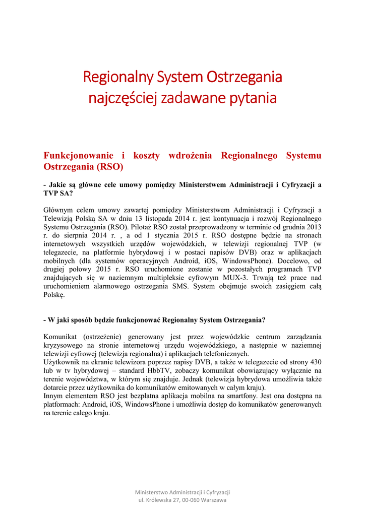 Regionalny System Ostrzegania najczęściej zadawane pytania Funkcjonowanie i koszty wdrożenia Regionalnego Systemu Ostrzegania (RSO) - Jakie są główne cele umowy pomiędzy Ministerstwem Administracji i Cyfryzacji a TVP SA? Głównym celem umowy zawartej pomiędzy Ministerstwem Administracji i Cyfryzacji a Telewizją Polską SA w dniu 13 listopada 2014 r. jest kontynuacja i rozwój Regionalnego Systemu Ostrzegania (RSO). Pilotaż RSO został przeprowadzony w terminie od grudnia 2013 r. do sierpnia 2014 r. , a od 1 stycznia 2015 r. RSO dostępne będzie na stronach internetowych wszystkich urzędów wojewódzkich, w telewizji regionalnej TVP (w telegazecie, na platformie hybrydowej i w postaci napisów DVB) oraz w aplikacjach mobilnych (dla systemów operacyjnych Android, iOS, WindowsPhone). Docelowo, od drugiej połowy 2015 r. RSO uruchomione zostanie w pozostałych programach TVP znajdujących się w naziemnym multipleksie cyfrowym MUX-3. Trwają też prace nad uruchomieniem alarmowego ostrzegania SMS. System obejmuje swoich zasięgiem całą Polskę. - W jaki sposób będzie funkcjonować Regionalny System Ostrzegania? Komunikat (ostrzeżenie) generowany jest przez wojewódzkie centrum zarządzania kryzysowego na stronie internetowej urzędu wojewódzkiego, a następnie w naziemnej telewizji cyfrowej (telewizja regionalna) i aplikacjach telefonicznych. Użytkownik na ekranie telewizora poprzez napisy DVB, a także w telegazecie od strony 430 lub w tv hybrydowej – standard HbbTV, zobaczy komunikat obowiązujący wyłącznie na terenie województwa, w którym się znajduje. Jednak (telewizja hybrydowa umożliwia także dotarcie przez użytkownika do komunikatów emitowanych w całym kraju). Innym elementem RSO jest bezpłatna aplikacja mobilna na smartfony. Jest ona dostępna na platformach: Android, iOS, WindowsPhone i umożliwia dostęp do komunikatów generowanych na terenie całego kraju. Ministerstwo Administracji i Cyfryzacji ul. Królewska 27, 00-060 Warszawa W celu zapoznania się z konkretnym komunikatem bądź informacją np. o aktualnym stanie wód wystarczy pobrać aplikację RSO, a następnie wybrać dowolne województwo. Aplikacja w telefonie zaopatrzona została również w część zawierającą poradniki postepowania w sytuacjach kryzysowych. Poradniki opracowane przez MAC i RCB pogrupowane zostały w kategorie: Poradnik obywatela; Alarmowanie i ostrzeganie; Ewakuacja; Pożary; Powodzie i podtopienia; Skażenia, epidemie, zatrucia; Pogodowe zjawiska ekstremalne; Terror; Bezpieczny wypoczynek; Zagrożenia naturalne i techniczne. - Jaka kwota została do tej pory przeznaczona na jego realizację? Czy całość kosztów została pokryta przez MAC? W 2014 r. na projekt usługi Regionalnego Systemu Ostrzegania wydatkowano 250 tys. zł (wszystkie podane wartości - brutto). Kwota ta została w całości pokryta przez Ministerstwo Administracji i Cyfryzacji i wydatkowana na przeprowadzenie pilotażu usługi RSO. - Jaki jest szacowany całościowy koszt wdrożenia projektu RSO? Z jakich środków zostanie sfinansowany? W roku 2015 na projekt Regionalnego Systemu Ostrzegania przewidziano kwotę 880 tys. zł, z czego z tyt. umowy z TVP S.A. 589,62 tys. zł. Projekt zostanie w całości sfinansowany ze środków będących w dyspozycji Ministerstwa Administracji i Cyfryzacji. - Jaki będzie roczny koszt utrzymania tego systemu? Roczny koszt utrzymania RSO, w zależności od przyjętych założeń dotyczących zakresu jego funkcjonalności, szacowany jest na 880 tys. – 1 mln zł. - Ile osób skorzystać może na wprowadzaniu RSO? RSO obejmuje swoim zasięgiem cały kraj. Im większa będzie świadomość społeczna tego projektu i wiedza na jego temat, tym większa będzie jego skuteczność. - Czy dane osobowe udostępnione wraz z numerem telefonu Wojewódzkim Centrom Zarządzania Kryzysowego, będą odpowiednio chronione? Wdrożenie RSO w postaci przekazywania krótkich wiadomości tekstowych (sms) na zgłoszone uprzednio numery telefonów komórkowych odbywać się będzie z zachowaniem odpowiednich procedur i poszanowaniem litery prawa. Tworzona baza nie będzie udostępniana innym podmiotom. Aktualnie w MAC i TVP trwają intensywne prace nad uruchomieniem sms jako kanału dystrybucji RSO; szczegółowe rozwiązania znane będą w niedalekiej przyszłości. Ministerstwo Administracji i Cyfryzacji ul. Królewska 27, 00-060 Warszawa - W jaki sposób będzie tworzona baza osób, które będą otrzymywały powiadomienia sms? Baza będzie tworzona na zasadzie dobrowolnego zgłoszenia swojego numeru telefonu do tej bazy. - Czym różni się RSO od informatycznego systemu informowania o zagrożeniach ISOK, który ma zostać wprowadzony do końca grudnia 2014 r. przez Krajowy Zarząd Gospodarki Wodnej? Wprowadzeniu projektu ISOK, w odróżnieniu od RSO, przyświecają nieco inne cele (więcej o projekcie ISOK pod linkiem: http://www.isok.gov.pl/pl/o-projekcie) - ISOK koncentruje się głównie na zagrożeniach powodziowych, podczas gdy RSO w sposób kompleksowy informuje obywateli o różnego rodzaju zagrożeniach. Ponadto Regionalny System Ostrzegania ma więcej kanałów dystrybucji , bo są to zarówno: strony internetowe urzędów wojewódzkich, telewizja, aplikacja mobilne na telefony komórkowe (smartfony). - Jak wygląda komunikat publikowany na ekranie telewizora? - Czy takie komunikaty znajdą się we wszystkich telewizjach np. w TVN czy Polsat? Nie, RSO jest oparte na regionalnych nadajnikach telewizji publicznej. Od 1 stycznia 2015 r. te komunikaty można zobaczyć w TVP Regionalnej, a od 1 lipca 2015 r. będzie można je Ministerstwo Administracji i Cyfryzacji ul. Królewska 27, 00-060 Warszawa zobaczyć we wszystkich programach Telewizji Polskiej SA obecnych na MUX3 tj.: Telewizji Polskiej: TVP1 HD, TVP2 HD, TVP Regionalna, TVP Info, TVP Kultura, TVP Polonia, TVP Historia, TVP Rozrywka. - W jaki sposób RSO wspomoże działanie służb, które zajmują się rozwiąz