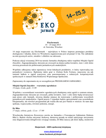 EkoJarmark 14 – 25 maja 2013 ul. Szewska, Wrocław 14 maja rozpocznie się EkoJarmark – największa w Polsce impreza promująca produkty ekologiczne i lokalne, która we Wrocławiu organizowana jest od ponad 12 lat. Nie zabraknie na nim pysznych serów, miodów i chlebów na zakwasie. Podczas edycji wiosennej 2014 na terenie Jarmarku zbudujemy także wspólnie Miejski Ogród Zmysłów. Zagospodarujemy skrzynie po owocach na donice pełne kwiatów, traw i ziół, które stworzą przestrzeń do próbowania jarmarkowych smakołyków. Wspólnie odkryjemy także tajemniczy świat lokalnych produktów, w który wprowadzą nas jarmarkowi wystawcy. Będziemy także grać w Zielone Koło Fortuny, nauczymy się jak zmienić balkon w ogród warzywny oraz porozmawiamy o rolniczych kooperatywach społecznych w ramach Dnia Rolnictwa Wspieranego Społecznie. Zapraszamy do zapoznania się ze szczegółowym PROGRAMEM JARMARKU. Miejski Ogród Zmysłów - warsztaty ogrodnicze 14 maja, środa, godz. 11.00 Wspólnie z uczestnikami warsztatów ogrodniczych zbudujemy mini ogród w centrum miasta. Zagospodarowane skrzynie po owocach, pełne kwiatów, traw i ziół, które będą towarzyszyć nam przez cały Jarmark, stworzą idealne miejsce do testowania i próbowania wszystkich jarmarkowych smakołyków. Ogród prawie 2 tygodnie będzie uprzyjemniał czas uczestnikom Ekojarmarku, ale również przypominał jak ważna dla nas jest Natura w mieście: ile nam daje spokoju, wypoczynku, również jedzenia, energii. Dr Bike 17 maja, sobota, godz. 12.oo - 17:00 Wrocławska Inicjatywa Rowerowa zawita na Jarmarku z Fruwającym Gabinetem Doktora Bike’a. Będzie można otrzymać fachową, darmową poradę na temat należytego utrzymania oraz diagnozowania dolegliwości swojego rumaka, Dr Bike nauczy jak kleić dętkę, montować Ekojarmark - 100% społecznej inicjatywy www.ekojarmark.pl www.facebook.pl/ekojarmark klocki hamulcowe i wymieniać łańcuch, a dodatkowo da szansę skorzystania z darmowych, podstawowych usług serwisowych. „Moje Miasto – Czyste Miasto” czyli Zielone Koło Fortuny 18 maja, niedziela, godz. 14.00 - 16.00 Sprawdź swoją wiedzę na temat ekologii, przyrody w mieście, a także sposobów dbania o czystość w mieście. Odpowiedzi mogą nie być tak oczywiste jak Ci się wydaje. Na śmiałków, którzy prawidłowo odpowiedzą na pytania czekać będą upominki – niespodzianki! Dzień Rolnictwa Wspieranego Społecznie 24 maja, sobota W tajemniczy świat swoich produktów wprowadzą Państwa wystawcy EkoJarmarku. W programie: Prezentacje: • • • • • Zioła - instrukcja obsługi - domowa uprawa, zastosowanie, właściwości Sery zagrodowe - na czym polega tajemnica ich wyrobu i jak rozpoznać dobry ser Sekrety pszczół - jak powstaje najlepszy miód i jakie ma właściwości Dobre jak chleb - tajemnice wypieku chleba: maki, zakwas, drożdze, woda... Sekrety dobrego wina na przykładzie win morawskich oraz lokalnych winnic Warsztaty z ogrodnictwa miejskiego - jak zamienić swój balkon w piękny ogród warzywny? Spotkanie i dyskusja „Kooperatywy konsumenckie” - spotkanie dla wszystkich chcących założyć własną grupę konsumencką, dowiedzieć się czym jest Rolnictwo Wspierane Społecznie i podzielić się własnymi doświadczeniami. Warsztaty filcowania 18 maja, 25 maja, niedziela, godz.12.00 - 15.00 Zapraszamy wszystkich chętnych na warsztaty z filcowania z Gałgankostwo Bogumiły. ORGANIZATOR: Fundacja EkoRozwoju FER Ul. św. Wincentego 25 A, C www.fer.org.pl email: [email protected] Ekojarmark - 100% społecznej inicjatywy www.ekojarmark.pl www.facebook.pl/ekojarmark