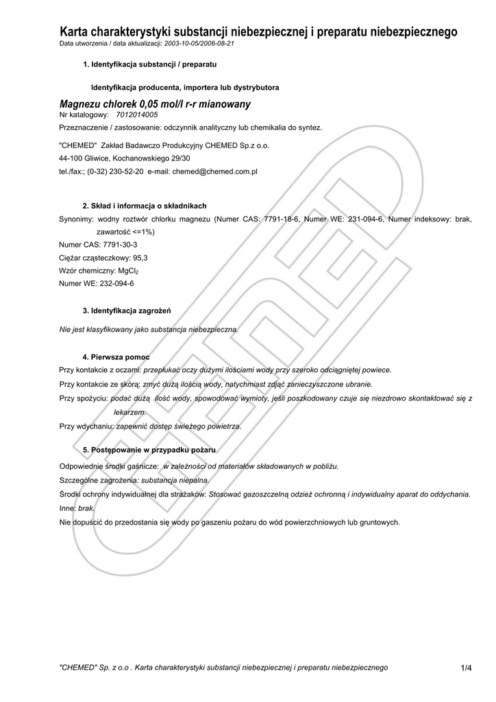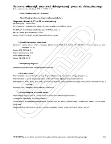 Karta charakterystyki substancji niebezpiecznej i preparatu niebezpiecznego Data utworzenia / data aktualizacji: 2003-10-05/2006-08-21 1. Identyfikacja substancji / preparatu Identyfikacja producenta, importera lub dystrybutora Magnezu chlorek 0,05 mol/l r-r mianowany Nr katalogowy: 7012014005 Przeznaczenie / zastosowanie: odczynnik analityczny lub chemikalia do syntez. "CHEMED" Zakład Badawczo Produkcyjny CHEMED Sp.z o.o. 44-100 Gliwice, Kochanowskiego 29/30 tel./fax:; (0-32) 230-52-20 e-mail: [email protected] 2. Skład i informacja o składnikach Synonimy: wodny roztwór chlorku magnezu (Numer CAS: 7791-18-6, Numer WE: 231-094-6, Numer indeksowy: brak, zawartość <=1%) Numer CAS: 7791-30-3 Ciężar cząsteczkowy: 95,3 Wzór chemiczny: MgCl2 Numer WE: 232-094-6 3. Identyfikacja zagrożeń Nie jest klasyfikowany jako substancja niebezpieczna. 4. Pierwsza pomoc Przy kontakcie z oczami: przepłukać oczy dużymi ilościami wody przy szeroko odciągniętej powiece. Przy kontakcie ze skórą: zmyć dużą ilością wody, natychmiast zdjąć zanieczyszczone ubranie. Przy spożyciu: podać dużą ilość wody, spowodować wymioty, jeśli poszkodowany czuje się niezdrowo skontaktować się z lekarzem. Przy wdychaniu: zapewnić dostęp świeżego powietrza. 5. Postępowanie w przypadku pożaru Odpowiednie środki gaśnicze: w zależności od materiałów składowanych w pobliżu. Szczególne zagrożenia: substancja niepalna. Środki ochrony indywidualnej dla strażaków: Stosować gazoszczelną odzież ochronną i indywidualny aparat do oddychania. Inne: brak. Nie dopuścić do przedostania się wody po gaszeniu pożaru do wód powierzchniowych lub gruntowych. "CHEMED" Sp. z o.o . Karta charakterystyki substancji niebezpiecznej i preparatu niebezpiecznego 1/4 Magnezu chlorek 0,05 mol/l r-r mianowany 6. Postępowanie w przypadku niezamierzonego uwolnienia do środowiska Zebrać przy pomocy substancji absorbującej ciecze, przekazać do likwidacji. Oczyścić zanieczyszczony teren. Nie dopuścić do dostania się do wód, ścieków i gleby. 7. Postępowanie z substancją / preparatem i jej / jego magazynowanie Obchodzenie się z substancją: Zapewnić skuteczną wymianę powietrza (wentylacja). Postępować zgodnie z zasadami dobrej praktyki przemysłowej oraz ogólnymi zasadami bezpieczeństwa i higieny pracy z substancjami chemicznymi. Stosować środki ochrony osobistej zgodnie z pkt.8. Nie opróżniać do kanalizacji. Magazynowanie: szczelne opakowania. Temperatura pokojowa (wskazane od+15 do +25 °C). 8. Kontrola narażenia i środki ochrony indywidualnej Parametry kontroli (NDS, NDSCh, NDSP): nie ustalone Stosować odpowiednią wentylację wywiewną, miejscową i ogólną zapewniającą utrzymanie stężenia produktu w powietrzu poniżej określonych limitów (minimum 10-krotna wymiana powietrza na godzinę). Zaleca się wyposażenie miejsca pracy w wodny natrysk do płukania oczu oraz prysznic. Środki ochrony indywidualnej powinny być tak zaprojektowane i wykonane aby wykluczały zagrożenie i inne niedogodności w przewidywanych warunkach użytkowania, chroniące przed chemikaliami. Dz. U. nr 217, Rozporządzenie z dnia 29 listopada 2002 (poz. 1833); Dz. U. nr 80, Rozporządzenie z dnia 31 marca 2003 (poz. 725), Dz. U. nr212(poz. 1769), Rozporządzenie Ministra Gospodarki i Pracy z dnia 10 października 2005 Środki ochrony indywidualnej: ochrona dróg oddechowych: konieczna – maska przeciwgazowa ochrona oczu: konieczna - okulary ochronne typu gogle ochrona rąk: konieczna – rękawice ochronne, chroniące przed chemikaliami (znak CE) ochrona ciała: niekonieczna środki ochronne i higieny: wymyć ręce po pracy z tą substancją. Stosować krem barierowo-ochronny. 9. Własności fizykochemiczne Forma: ciało stałe lepkość dynamiczna: Kolor: brak danych lepkość kinematyczna: Zapach: bez zapachu Ciśnienie par: nie dotyczy pH: brak danych Gęstość: około 1,003 g/cm3 (20°C) Temperatura topnienia: brak danych Ciężar nasypowy: brak danych Temperatura wrzenia: nie dotyczy Rozpuszczalność: Temperatura samozapłonu: nie dotyczy w wodzie: rozpuszczalny Temperatura zapłonu: nie dotyczy w rozpuszczalnikach organicznych: brak danych Granice wybuchowości: nie dotyczy log P(w/o): dolna: górna: "CHEMED" Sp. z o.o . Karta charakterystyki substancji niebezpiecznej i preparatu niebezpiecznego 2/4 Magnezu chlorek 0,05 mol/l r-r mianowany 10. Stabilność i reaktywność Warunki których należy unikać: brak Materiały których należy unikać: silne utleniacze, silne kwasy, silne zasady. Niebezpieczne produkty rozkładu: brak Następne dane: w warunkach normalnych substancja stabilna 11. Informacje toksykologiczne Informacje toksykologiczne: LD50 (doustnie, szczury): 8100 mg/kg Pozostałe dane: przy kontakcie z oczami: lekkie podrażnienie śluzówki; przy kontakcie ze skórą: lekkie podrażnienie; przy spożyciu dużych ilości: nudności, wymioty, biegunka.. 12. Informacje ekologiczne Brak danych. Nie dopuszczać do dostania się do wód, ścieków lub gleby. 13. Postępowanie z odpadami ZBP CHEMED przyjmuje do likwidacji substancje i opakowania po tych substancjach zakupione w ZBP CHEMED. Utylizacją odpadów powinny zająć się wyspecjalizowane firmy. Opakowanie jednorazowego ubytku traktować jak odpad i przekazać odbiorcy odpadów. Sposób likwidacji zebranych odpadów uzgodnić z właściwym terenowo wydziałem ochrony środowiska. Ustawy z dnia 27.04.2001 (Dz. U. nr 62, poz. 628), z dnia 11.05.2001 (Dz. U. nr 63 poz. 638)z poźn. zm. Rozporządzenie z dnia 27.09.2001 (Dz. U. nr 112, poz. 1206) 14. Informacje o transporcie Klasa ADR i grupa pakowania: nie jest przedmiotem przepisów transportowych Numer UN: nie dotyczy Nazwa materiału (wg UN): nie dotyczy "CHEMED" Sp. z o.o . Karta charakterystyki substancji niebezpiecznej i preparatu niebezpiecznego 3/4 Magnezu chlorek 0,05 mol/l r-r mianowany 15. Informacje dotyczące przepisów prawnych Symbol i oznaczenie zagrożenia