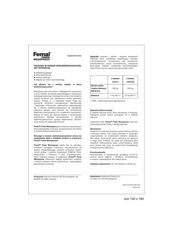 Suplement diety MENOPAUZA POLECANY W OKRESIE OKOŁOMENOPAUZALNYM, GDY WYSTĘPUJĄ: Składniki: ekstrakt z pyłków i słupków kwiatowych (PI82-GC Fem), substancja wypełniająca (celuloza mikrokrystaliczna), uwodorniony olej bawełniany, przeciwutleniacz (octan D-α-tokoferylu), substancja glazurująca (szelak), substancja przeciwzbrylająca (dwutlenek krzemu), substancja glazurująca (talk). ● uderzenia gorąca ● silne pocenie się ● zmiany nastroju ● kłopoty ze snem i koncentracją Jak objawia się u kobiety wejście w okres okołomenopauzalny? Menopauza jest naturalnym i fizjologicznym zjawiskiem w życiu kobiety. W okresie poprzedzającym menopauzę następują stopniowe i fizjologiczne zmiany hormonalne, których skutkiem jest zakończenie okresu płodności kobiety. Zmiany te u niektórych kobiet mogą być przyczyną obniżenia samopoczucia psychicznego i fizycznego. Przyczynami dyskomfortu pojawiającego się w okresie okołomenopauzalnym są najczęściej: uderzenia gorąca, silne pocenie się, zmniejszenie stabilności emocjonalnej (m.in. drażliwość, nerwowość), kłopoty ze snem, jak również kłopoty z koncentracją. Zachowaniu dobrego samopoczucia w okresie okołomenopauzalnym sprzyja odpowiednio zbilansowana dieta oraz aktywność fizyczna. Femal® Forte Menopauza jest preparatem opracowanym przez specjalistów w Szwecji, przeznaczonym dla kobiet w okresie okołomenopauzalnym. Dlaczego w okresie okołomenopauzalnym zaleca się uzupełnianie diety o składniki zawarte w preparacie Femal® Forte Menopauza? Femal® Forte Menopauza oparty jest na standaryzowanych wyciągach roślinnych, otrzymywanych na drodze wieloetapowego procesu ekstrakcji organicznych pyłków i słupków kwiatowych (PI82-GC Fem), połączonych z witaminą E jako antyutleniaczem. Pyłek kwiatowy zawarty w preparacie Femal® Forte Menopauza efektywnie łagodzi dyskomfort związany z różnymi etapami okresu przekwitania, wspomagając jego spokojny przebieg. Producent: Natumin Pharma AB, Snickaregatan 10, SE-566 33 Habo, Szwecja. Ekstrakt z pyłków i słupków kwiatowych PI82-GC Fem Witamina E 1 tabletka 2 tabletki zawiera zawierają 160 mg 320 mg 5 mg (42%*) 10 mg (84%*) *%RDA - zalecanego dziennego spożycia Zalecana dzienna porcja: 2 tabletki dziennie przez okres pierwszych 2 miesięcy, następnie porcję można zmniejszyć do 1 tabletki dziennie. Suplement diety Femal® Forte Menopauza może być przyjmowany przez osoby z alergią pyłkową. Ostrzeżenia: Preparat nie może być stosowany przez kobiety ciężarne i karmiące piersią. Nie należy stosować w przypadku nadwrażliwości na którykolwiek składnik preparatu. Nie należy przekraczać porcji zalecanej do spożycia w ciągu dnia. Produkt nie może być stosowany jako substytut zróżnicowanej diety. Zrównoważona dieta oraz zdrowy tryb życia są ważne dla prawidłowego funkcjonowania organizmu. Przechowywanie: Przechowywać w temperaturze pokojowej 15-25°C, chronić przed wilgocią i światłem. Przechowywać w miejscu niedostępnym dla małych dzieci. Dostępne opakowania: 20 i 40 tabletek x 364,8 mg Dystrybutor: Cederroth Polska S.A., ul. Polna 21, 05-250 Radzymin 260/4 53040-048-102 464370-3 size 140 x 180