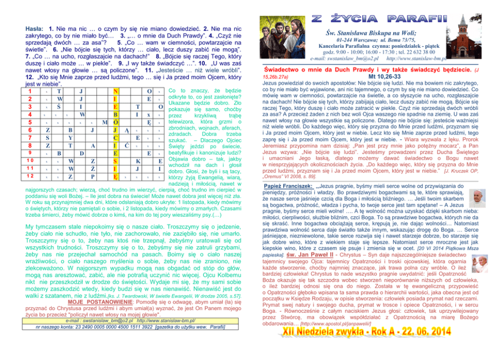 Hasła: 1. Nie ma nic … o czym by się nie miano dowiedzieć. 2. Nie ma nic zakrytego, co by nie miało być… 3. „… o mnie da Duch Prawdy”. 4. „Czyż nie sprzedają dwóch … za asa”? 5. „Co … wam w ciemności, powtarzajcie na świetle”. 6. „Nie bójcie się tych, którzy … ciało, lecz duszy zabić nie mogą”. 7. „Co … na ucho, rozgłaszajcie na dachach!” 8. „Bójcie się raczej Tego, który duszę i ciało może … w piekle”. 9. „I wy także świadczyć …”. 10. „U was zaś nawet włosy na głowie … są policzone”. 11. „Jesteście … niż wiele wróbli”. 12. „Kto się Mnie zaprze przed ludźmi, tego … się i Ja przed moim Ojcem, który jest w niebie”. x 1 T J N O x Co to znaczy, że będzie x 2 W J I E x odkryte to, co jest zasłonięte? Ukazane będzie dobro. Zło x 3 Ś I E T O pokazuje się samo, choćby x x x 4 W B I x x przez krzykliwą trąbę x x x x x 5 M Ó Ę x telewizora, która grzmi o zbrodniach, wojnach, aferach, x x 6 Z B J J Ą x zdradach. Dobra trzeba x 7 S Y C E x szukać. – Dlaczego Ojciec x x 8 Z T A I Ć x Święty jeździ po świecie, 9 x B D E E x beatyfikuje i kanonizuje ludzi? 10 x x W Z S K E Objawia dobro – tak, jakby wchodził na dach i głosił 11 x x W Ż I J I dobro. Głosi, że byli i są tacy, 12 x x x x x Z P Ę x którzy żyją Ewangelią, wiarą, nadzieją i miłością, nawet w najgorszych czasach; wierzą, choć trudno im wierzyć, cierpią, choć trudno im cierpieć w poddaniu się woli Bożej. – Ile jest dobra na świecie! Może nawet dobra jest więcej niż zła. W roku są przynajmniej dwa dni, które odsłaniają dobro ukryte: 1 listopada, kiedy mówimy o świętych, którzy nie pamiętali o sobie, i 2 listopada, kiedy mówimy o zmarłych. Czasami trzeba śmierci, żeby mówić dobrze o kimś, na kim do tej pory wieszaliśmy psy.(…) My tymczasem stale niepokoimy się o nasze ciało. Troszczymy się o jedzenie, żeby ciało nie schudło, nie tyło, nie zachorowało, nie zaziębiło się, nie umarło. Troszczymy się o to, żeby nas ktoś nie trzepnął, żebyśmy uratowali się od wszystkich trudności. Troszczymy się o to, żebyśmy się nie zatruli grzybami, żeby nas nie przejechał samochód na pasach. Boimy się o ciało naszej wrażliwości, o ciało naszego myślenia o sobie, żeby nas nie zraniono, nie zlekceważono. W najgorszym wypadku mogą nas obgadać od stóp do głów, mogą nas aresztować, zabić, ale nie potrafią uczynić nic więcej. Ojcu Kolbemu nikt nie przeszkodził w drodze do świętości. Wydaje mi się, że my sami sobie możemy zaszkodzić wtedy, kiedy budzi się w nas nienawiść. Nienawiść jest do walki z szatanem, nie z ludźmi.[ks. J. Twardowski, W świetle Ewangelii, W drodze 2005, s.57]. MOJE POSTANOWIENIE: Pomodlę się o odwagę, abym umiał (ła) się przyznać do Chrystusa przed ludźmi i abym umiał(a) wyznać, że jest On Panem mojego życia bo przecież "policzył nawet włosy na mojej głowie". e-mail : [email protected] http://www.stanislaw-bm.pl/ nr naszego konta: 23 2490 0005 0000 4500 1511 3922 [gazetka do użytku wew. Parafii] Św. Stanisława Biskupa na Woli; 01-244 Warszawa; ul. Bema 73/75, Kancelaria Parafialna czynna: poniedziałek - piątek godz. 9:00 - 10:00; 16:00 - 17:30 ; tel. 22 632 38 00 e-mail: [email protected] http://www.stanislaw-bm.pl/ Świadectwo o mnie da Duch Prawdy i wy także świadczyć będziecie. (J Mt 10,26-33 15,26b.27a) Jezus powiedział do swoich apostołów: Nie bójcie się ludzi. Nie ma bowiem nic zakrytego, co by nie miało być wyjawione, ani nic tajemnego, o czym by się nie miano dowiedzieć. Co mówię wam w ciemności, powtarzajcie na świetle, a co słyszycie na ucho, rozgłaszajcie na dachach! Nie bójcie się tych, którzy zabijają ciało, lecz duszy zabić nie mogą. Bójcie się raczej Tego, który duszę i ciało może zatracić w piekle. Czyż nie sprzedają dwóch wróbli za asa? A przecież żaden z nich bez woli Ojca waszego nie spadnie na ziemię. U was zaś nawet włosy na głowie wszystkie są policzone. Dlatego nie bójcie się: jesteście ważniejsi niż wiele wróbli. Do każdego więc, który się przyzna do Mnie przed ludźmi, przyznam się i Ja przed moim Ojcem, który jest w niebie. Lecz kto się Mnie zaprze przed ludźmi, tego zaprę się i Ja przed moim Ojcem, który jest w niebie. - Wiara wyzwala z lęku. Prorok Jeremiasz przypomina nam dzisiaj: „Pan jest przy mnie jako potężny mocarz”, a Pan Jezus wzywa: „Nie bójcie się ludzi”. Jesteśmy prowadzeni przez Ducha Świętego i umacniani Jego łaską, dlatego możemy dawać świadectwo o Bogu nawet w niesprzyjających okolicznościach życia. „Do każdego więc, który się przyzna do Mnie przed ludźmi, przyznam się i Ja przed moim Ojcem, który jest w niebie.” [J. Kruczek OP, „Oremus” VI 2008, s. 89]. Papież Franciszek: „„Jezus pragnie, byśmy mieli serce wolne od przywiązania do pieniędzy, próżności i władzy. Bo prawdziwymi bogactwami są te, które sprawiają, że nasze serce jaśnieje czcią dla Boga i miłością bliźniego. … Jeśli twoim skarbem są bogactwa, próżność, władza i pycha, to twoje serce jest tam spętane! – A Jezus pragnie, byśmy serce mieli wolne! …. A tę wolność można uzyskać dzięki skarbom nieba: miłości, cierpliwości, służbie bliźnim, czci Boga. To są prawdziwe bogactwa, których nie da się skraść. Inne bogactwa obciążają serce, krępują je, nie dając wolności… Natomiast prawdziwa wolność serca daje światło także innym, wskazując drogę do Boga. … Serce jaśniejące, niezniewolone, takie serce rozwija się i nawet starzeje dobrze, bo starzeje się jak dobre wino, które z wiekiem staje się lepsze. Natomiast serce mroczne jest jak kiepskie wino, które z czasem się psuje i zmienia się w ocet. [20 VI 2014 Piątkowa Msza papieska]. św. Jan Paweł II - Chrystus – Syn daje najszczególniejsze świadectwo tajemnicy swojego 