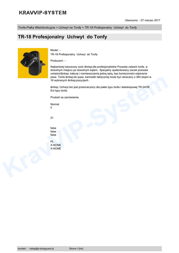 Utworzono : 07 marzec 2017 Tonfa-Pałka Wielofunkcyjna > Uchwyt na Tonfę > TR-18 Profesjonalny Uchwyt do Tonfy TR-18 Profesjonalny Uchwyt do Tonfy Model : TR-18 Profesjonalny Uchwyt do Tonfy Producent : Najbardziej luksusowy wzór dla profesjonalistów Pozwala ustawić tonfa, w dowolnym miejscu po dowolnym kątem.. Specjalny opatentowany zacisk pozwala umieścić kaburę i rozmieszczenia jedną ręką, bez konieczności odpinania pasa. Tonfa do pasa, kamizelki taktycznej może być obracany o 360 stopni w 16 wybranych pozycjach . m te Uchwyt ten jest przeznaczony dla pałek typu tonfa i teleskopowej TR-24/59 Ext typu tonfa. s y Produkt na zamówienie. Normal 0 21 false false false V v a r PL X-NONE X-NONE S IP K kontakt : - [email protected] Strona 1/{nb} Utworzono : 07 marzec 2017 Tonfa-Pałka Wielofunkcyjna > Uchwyt na Tonfę > TR-18 Profesjonalny Uchwyt do Tonfy TR-18 Profesjonalny Uchwyt do Tonfy DefSemiHidden="true" DefQFormat="false" DefPriority="99" LatentStyleCount="267"> UnhideWhenUsed="false" QFormat="true" Name="Normal" /> m te UnhideWhenUsed="false" QFormat="true" Name="heading 1" /> s y V v a r S IP UnhideWhenUsed="false" QFormat="true" Name="Title" /> UnhideWhenUsed="false" QFormat="true" Name="Subtitle" /> K UnhideWhenUsed="false" QFormat="true" Name="Strong" /> UnhideWhenUsed="false" QFormat="true" Name="Emphasis" /> UnhideWhenUsed="false" Name="Table Grid" /> UnhideWhenUsed="false" QFormat="true" Name="No Spacing" /> UnhideWhenUsed="false" Name="Light Shading" /> UnhideWhenUsed="false" Name="Light List" /> UnhideWhenUsed="false" Name="Light Grid" /> UnhideWhenUsed="false" Name="Medium Shading 1" /> UnhideWhenUsed="false" Name="Medium Shading 2" /> UnhideWhenUsed="false" Name="Medium List 1" /> UnhideWhenUsed="false" Name="Medium List 2" /> kontakt : - [email protected] Strona 2/{nb} Utworzono : 07 marzec 2017 Tonfa-Pałka Wielofunkcyjna > Uchwyt na Tonfę > TR-18 Profesjonalny Uchwyt do Tonfy TR-18 Profesjonalny Uchwyt do Tonfy UnhideWhenUsed="false" Name="Medium Grid 1" /> UnhideWhenUsed="false" Name="Medium Grid 2" /> UnhideWhenUsed="false" Name="Medium Grid 3" /> UnhideWhenUsed="false" Name="Dark List" /> m te UnhideWhenUsed="false" Name="Colorful Shading" /> UnhideWhenUsed="false" Name="Colorful List" /> s y UnhideWhenUsed="false" Name="Colorful Grid" /> UnhideWhenUsed="false" Name="Light Shading Accent 1" /> UnhideWhenUsed="false" Name="Light List Accent 1" /> S IP UnhideWhenUsed="false" Name="Light Grid Accent 1" /> UnhideWhenUsed="false" Name="Medium Shading 1 Accent 1" /> UnhideWhenUsed="false" Name="Medium Shading 2 Accent 1" /> V v a r UnhideWhenUsed="false" Name="Medium List 1 Accent 1" /> UnhideWhenUsed="false" QFormat="true" Name="List Paragraph" /> UnhideWhenUsed="false" QFormat="true" Name="Quote" /> K UnhideWhenUsed="false" QFormat="true" Name="Intense Quote" /> UnhideWhenUsed="false" Name="Medium List 2 Accent 1" /> UnhideWhenUsed="false" Name="Medium Grid 1 Accent 1" /> UnhideWhenUsed="false" Name="Medium Grid 2 Accent 1" /> UnhideWhenUsed="false" Name="Medium Grid 3 Accent 1" /> UnhideWhenUsed="false" Name="Dark List Accent 1" /> UnhideWhenUsed="false" Name="Colorful Shading Accent 1" /> UnhideWhenUsed="false" Name="Colorful List Accent 1" /> UnhideWhenUsed="false" Name="Colorful Grid Accent 1" /> UnhideWhenUsed="false" Name="Light Shading Accent 2" /> UnhideWhenUsed="false" Name="Light List Accent 2" /> UnhideWhenUsed="false" Name="Light Grid Accent 2" /> kontakt : - [email protected] Strona 3/{nb} Utworzono : 07 marzec 2017 Tonfa-Pałka Wielofunkcyjna > Uchwyt na Tonfę > TR-18 Profesjonalny Uchwyt do Tonfy TR-18 Profesjonalny Uchwyt do Tonfy UnhideWhenUsed="false" Name="Medium Shading 1 Accent 2" /> UnhideWhenUsed="false" Name="Medium Shading 2 Accent 2" /> UnhideWhenUsed="false" Name="Medium List 1 Accent 2" /> UnhideWhenUsed="false" Name="Medium List 2 Accent 2" /> m te UnhideWhenUsed="false" Name="Medium Grid 1 Accent 2" /> UnhideWhenUsed="false" Name="Medium Grid 2 Accent 2" /> s y UnhideWhenUsed="false" Name="Medium Grid 3 Accent 2" /> UnhideWhenUsed="false" Name="Dark List Accent 2" /> UnhideWhenUsed="false" Name="Colorful Shading Accent 2" /> S IP UnhideWhenUsed="false" Name="Colorful List Accent 2" /> UnhideWhenUsed="false" Name="Colorful Grid Accent 2" /> UnhideWhenUsed="false" Name="Light Shading Accent 3" /> V v a r UnhideWhenUsed="false" Name="Light List Accent 3" /> UnhideWhenUsed="false" Name="Light Grid Accent 3" /> UnhideWhenUsed="false" Name="Medium Shading 1 Accent 3" /> UnhideWhenUsed="false" Name="Medium Shading 2 Accent 3" /> K UnhideWhenUsed="false" Name="Medium List 1 Accent 3" /> UnhideWhenUsed="false" Name="Medium List 2 Accent 3" /> UnhideWhenUsed="false" Name="Medium Grid 1 Accent 3" /> UnhideWhenUsed="false" Name="Medium Grid 2 Accent 3" /> UnhideWhenUsed="false" Name="Medium Grid 3 Accent 3" /> UnhideWhenUsed="false" Name="Dark List Accent 3" /> UnhideWhenUsed="false" Name="Colorful Shading Accent 3" /> UnhideWhenUsed="false" Name="Colorful List Accent 3" /> UnhideWhenUsed="false" Name="Colorful Grid Accent 3" /> UnhideWhenUsed="false" Name="Light Shading Accent 4" /> UnhideWhenUsed="false" Name="Light List Accent 4" /> kontakt : - [email protected] Strona 4/{nb} Utworzono : 07 marzec 2017 Tonfa-Pałka Wielofunkcyjna > Uchwyt na Tonfę > TR-18 Profesjonalny Uchwyt do Tonfy TR-18 Profesjonalny Uchwyt do Tonfy UnhideWhenUsed="false" Name="Light Grid Accent 4" /> UnhideWhenUsed="false" Name="Medium Shading 1 Accent 4" /> UnhideWhenUsed="false" Name="Medium Shading 2 Accent 4" /> UnhideWhenUsed="false" Name="Medium List 1 Accent 4" /> m te UnhideWhenUsed="false" Name="Medium List 2 Accent 4" /> UnhideWhenUsed="false" Name="Medium Grid 1 Accent 4" /> UnhideWhenUsed="false" Name="Medium Grid 2 Accent 4" /> s y UnhideWhenUsed="false" Name="Medium Grid 3 Accent 4" /> UnhideWhenUsed="false" Name="Dark List Accent 4" /> S IP UnhideWhenUsed="false" Name="Colorful Shading Accent 4" /> UnhideWhenUsed="false" Name="Colorful List Acce