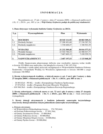 INFORMACJA Na podstawie art. 37 pkt. 2 ustawy z dnia 27 sierpnia 2009r. o finansach publicznych ( Dz. U. z 2013r., poz. 885 ze zm. ) Wójt Gminy Grębocice podaje do publicznej wiadomości: 1. Dane dotyczące wykonania budżetu Gminy Grębocice za 2013r. L.p. Wyszczególnienie Plan Wykonanie 1. 1.1 1.2. DOCHODY Dochody bieżące Dochody majątkowe 28 545 111,95 27 208 491,68 1 336 620,27 28 883 509,31 27 536 587,76 1 346 921,55 2. 2.1. 2.2. WYDATKI Wydatki bieżące Wydatki majątkowe 31 232 309,48 23 544 740,33 7 687 605,15 30 016 577,51 22 586 017,77 7 430 559,74 3. NADWYŻKA/DEFICYT - 2 687 197,53 - 1 133 068,20 Źródło finansowania planowanego deficytu oraz rozchodów stanową wolne środki w kwocie 552 000zł oraz nadwyżka z lat ubiegłych w kwocie 2 301 197,53zł. Rozchody z tytułu spłaty pożyczek zaciągniętych w Wojewódzkim Funduszu Ochrony Środowiska i Gospodarki Wodnej we Wrocławiu zaplanowano w kwocie 166 000 z czego wykonano 166 000zł. 2. Kwotę wykorzystanych środków, o których mowa w art. 5 ust.1 pkt 2 ustawy z dnia 27 sierpnia 2009r. o finansach publicznych ( Dz. U. z 2013r., poz. 885 ze zm. ): - 26 803,82zł – PO KL – środki z Europejskiego Funduszu Społecznego, - 47 074,95zł - środki z Programu Rozwoju Obszarów Wiejskich, - 630 560,38zł – środki z Europejskiego Funduszu Rozwoju Regionalnego. 3. Kwotę zobowiązań, o których mowa w art. 72 ust.1 pkt 4 ustawy z dnia 27 sierpnia 2009r. o finansach publicznych ( Dz. U. z 2013r., poz. 885 ze zm. ) – brak zobowiązań wymagalnych. 3. Kwoty dotacji otrzymanych z budżetu jednostek samorządu terytorialnego oraz kwoty dotacji udzielone innym jednostkom samorządu terytorialnego: a. Dotacje otrzymane: - od Województwa Dolnośląskiego kwota – 574 782,64zł, - od Powiatu Polkowickiego kwota - 57 991,39zł, - od Gminy Jerzmanowa kwota - 15 000,00zł, - od Gminy Polkowice kwota – 30 000,00zł, - od Gminy Miejskiej Głogów kwota – 10 000,00zł, - od Gminy Pęcław kwota – 50 000,00zł. 1 b. Dotacje udzielone: - dla Województwa Dolnośląskiego kwota – 103 084,50zł, - dla Gminy Miejskiej Głogów kwota - 17 886,19zł, - dla Powiatu Polkowickiego kwota – 500 000,00zł. 4. Wykaz udzielonych poręczeń i gwarancji, z wymienieniem podmiotów, których gwarancje i poręczenia dotyczą - nie udzielono żadnych poręczeń i gwarancji. 5. Wykaz osób prawnych i fizycznych oraz jednostek organizacyjnych nieposiadających osobowości prawnej, którym w zakresie podatków lub opłat udzielono ulg, odroczeń, umorzeń lub rozłożono spłatę na raty w kwocie przewyższającej 500 zł w 2013 roku. Ulgi w podatku rolnym z tytułu nabycia gruntów na utworzenie lub powiększenie gospodarstwa rolnego: 1. Dobrowolski Roman 2. Dobrowolski Zbigniew 3. Faryna Waldemar 4. Frątczak Paweł 5. Gierlak Wiesław 6. Grębski Zdzisław 7. Jacuś Barbara 8. Kacała Zbigniew 9. Kamiński Zbigniew 10. Papiernik Marian 11. Puzio Krzysztof 12. Ratajczyk Tomasz 13. Rokaszewicz Dariusz 14. Różański Mariusz 15. Segień Piotr 16. Stankiewicz Tomasz 17. Stankiewicz Wojciech 18. Sypniewski Lech 19. Szocik Andrzej 20. Szocik Zbigniew 21. Ślufarski Krzysztof 22. Tesarski Łukasz 23. „JAN-SPED” sp. z o.o. 2 Ulgi inwestycyjne w podatku rolnym: 1. Wróblewski Maciej Umorzenia: Lp. 1 2 3 Nazwisko i imię Ławniczak Teresa i Zygmunt Dobrowolski Roman Skibińska Irena Kwota 768,00 652,00 958,00 Przyczyna umorzenia ważny interes podatnika ważny interes podatnika ważny interes podatnika Kwota 637,00 762,00 10.843,00 26.614,00 Przyczyna odroczenia ważny interes podatnika ważny interes podatnika ważny interes podatnika ważny interes podatnika Odroczenia: Lp. 1 2 3 4 Nazwisko i imię Głąb Małgorzata i Jacek Chodorowski Bogusław Fartuszyński Przemysław Gminna Spółdzielnia „Samopomoc Chłopska” 6. Wykaz osób prawnych i fizycznych oraz jednostek organizacyjnych nieposiadających osobowości prawnej, którym udzielono pomocy publicznej w 2013 r. 1 Andrzejewska Urszula 2 Antoszewska Agata 3 Atamaniec Jan 4 Bałdys Karol 5 Bańka Adam 6 Barnaś Bogusław 7 Barnaś Ryszard 8 Baruch Piotr 9 Belka Józef 10 Bilski Janusz 11 Błażewicz Józef 12 Bojanowski Piotr 13 Bolińska Agnieszka 14 Boliński Piotr 15 Borek Renata 3 16 Borkowski Mariusz 17 Bubak Łukasz 18 Buczyńska Agnieszka 19 Buszta Piotr 20 Chmurak Marian 21 Chodorowski Bogusław 22 Chojnacki Wojciech 23 Chrzan Józef 24 Chrzuszcz Robert 25 Cirko Paweł 26 Cirko Robert 27 Ciura Stanisław 28 Curkan Michał 29 Czarna Grażyna 30 Czech Andrzej 31 Czerniak Henryk 32 Czuba Jarosław 33 Czuba Kazimierz 34 Ćwik Jacek 35 Dobrowolski Roman 36 Dobrowolski Stanisław 37 Dobrowolski Zbigniew 38 Dryja Czesław 39 Drzewiecki Zbigniew 40 Działo Czesław 41 Dzwończyk Jan 42 Fartuszyński Przemysław 43 Faryna Waldemar 44 Fiedorek Piotr 45 Frątczak Ireneusz 4 46 Frątczak Paweł 47 Gawron Henryk 48 Gierlak Wiesław 49 Gierlak Wiktor 50 Gil Stanisław 51 Glapiński Zdzisław 52 Głowacki Paweł 53 Gola Sławomir 54 Góralczyk Grzegorz 55 Grębski Paweł 56 Grębski Zdziaław 57 Gruchała Krystyna 58 Guzera Bogusław 59 Guzera Marek 60 Gwazdacz Ryszard 61 Gwóźdź Henryk 62 Hajduk-Baruch Anna 63 Ilnicki Jan 64 Jachim Tadeusz 65 Jachowicz Ryszard 66 Jacuś Barbara 67 Jania Marek 68 Janus Paweł 69 Jaskółka Elżbieta 70 Jaskuła Sylwia 71 Jaworowski Marian 72 Jaworski Tadeusz 73 Jemioła Edward 74 Jemioło Justyna 75 Jóźwiak Robert 5 76 Jóźwiak Urszula 77 Kacała Beata 78 Kacała Grzegorz 79 Kacała Zbigniew 80 Kaczmarek Jerzy 81 Kaczorek Stefan 82 Kalota Piotr 83 Kamiński Zbigniew 84 Kapuściński Bolesław 85 Kaśków Krystyna 86 Kazimierowicz Beata 87 Kazimierowicz Olga 88 Kiczak Grzegorz 89 Kiczak Kazimiera 90 Kląskała Eugeniusz 91 Kochany Andrzej 92 Koliński Jarosław 93 Konarski Leszek 94 Konieczna Magdalena 95 Konopacki Tomasz 96 Kotkiewicz Elżbieta 97 Kowalczyk Zenon 98 Kowalski Józef 99 Kozak Wiesław 100 Kozal Edmund 101 Kozłowski Zbigniew 102 Kożusz