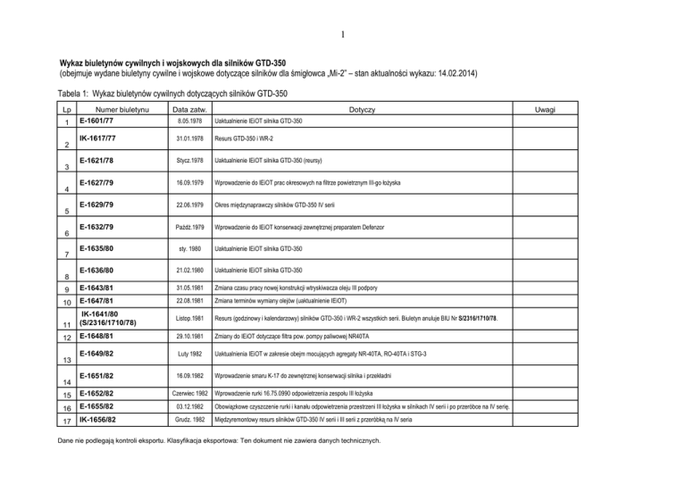 1 Wykaz biuletynów cywilnych i wojskowych dla silników GTD-350 (obejmuje wydane biuletyny cywilne i wojskowe dotyczące silników dla śmigłowca „Mi-2” – stan aktualności wykazu: 14.02.2014) Tabela 1: Wykaz biuletynów cywilnych dotyczących silników GTD-350 Lp Numer biuletynu E-1601/77 Data zatw. Dotyczy 8.05.1978 Uaktualnienie IEiOT silnika GTD-350 IK-1617/77 31.01.1978 Resurs GTD-350 i WR-2 E-1621/78 Stycz.1978 Uaktualnienie IEiOT silnika GTD-350 (reursy) E-1627/79 16.09.1979 Wprowadzenie do IEiOT prac okresowych na filtrze powietrznym III-go łożyska E-1629/79 22.06.1979 Okres międzynaprawczy silników GTD-350 IV serii E-1632/79 Paźdż.1979 Wprowadzenie do IEiOT konserwacji zewnętrznej preparatem Defenzor E-1635/80 sty. 1980 Uaktualnienie IEiOT silnika GTD-350 E-1636/80 21.02.1980 Uaktualnienie IEiOT silnika GTD-350 9 E-1643/81 31.05.1981 Zmiana czasu pracy nowej konstrukcji wtryskiwacza oleju III podpory 10 E-1647/81 22.08.1981 Zmiana terminów wymiany olejów (uaktualnienie IEiOT) IK-1641/80 (S/2316/1710/78) Listop.1981 Resurs (godzinowy i kalendarzowy) silników GTD-350 i WR-2 wszystkich serii. Biuletyn anuluje BIU Nr S/2316/1710/78. 11 12 E-1648/81 29.10.1981 Zmiany do IEiOT dotyczące filtra pow. pompy paliwowej NR40TA E-1649/82 Luty 1982 Uaktualnienia IEiOT w zakresie obejm mocujących agregaty NR-40TA, RO-40TA i STG-3 E-1651/82 16.09.1982 Wprowadzenie smaru K-17 do zewnętrznej konserwacji silnika i przekładni 15 E-1652/82 Czerwiec 1982 16 E-1655/82 03.12.1982 Obowiązkowe czyszczenie rurki i kanału odpowietrzenia przestrzeni III łożyska w silnikach IV serii i po przeróbce na IV serię. 17 IK-1656/82 Grudz. 1982 Międzyremontowy resurs silników GTD-350 IV serii i III serii z przeróbką na IV seria 1 2 3 4 5 6 7 8 13 14 Wprowadzenie rurki 16.75.0990 odpowietrzenia zespołu III łożyska Dane nie podlegają kontroli eksportu. Klasyfikacja eksportowa: Ten dokument nie zawiera danych technicznych. Uwagi 2 E-1661/83 Lipiec 1983 Zmiana czasu pracy wtryskiwacza oleju do III łożyska z 500 na 1000 godzin E-1662/85 25.04.1986 Resurs silników GTD-350 i przekładni głównej WR-2 (Anuluje BIU Nr S/2793/1972/81 i S/2880/E/1656/83) E-1663/84 17.011984 Mycie dyszki i filtru powietrznego automatu rozruchu pompy paliwowej po burzach piaskowych E-1664/84 7.02.1984 Minimalna temperatura oleju w silniku GTD-350 E-1679/86 12.08.1986 Wprowadzenie do IEiOT olejów Asto 500, Castrol 5000, oraz paliw PL-6 i JET A-1 23 IK-1680/88 13.02.1989 Metodyka postępowania w przypadku dużego zużycia oleju 24 E-1681/86 gru. 1986 Wprowadzenie wskaźnika ITG-1M z resursem 1000 godzin do IEiOT E-1682/87 sty. 1987 Wprowadzenie oleju Castrol-98 do IEiOT E/1684/87 05.10.1987 Wymiana śrub 89.00.0053, 89.00.0096 i 89.00.0054 na odp.: 89.00.1575, 89.00.1036 i 89.00.1035 E-1692/89; ДА-1684/87 E-1687/87 26.11.1987 Wprowadzenie olju Elf Turbojet II do IEiOT E-1688/88 05.05.1988 Poprawa warunków pracy sprzęgieł jednokierunkowych IK-1689/88 Sier. 1988 16.0.381 Opis Techniczny. Uaktualnienie opisu technicznego silnika GTD-350. E-1690/89 List. 1988 IEiOT Nr 16.0.373; Wpr. mniejszej ilości spr. zadz. awaryjnego wył. OOWT-3; Zm. sposób mycia filtra pow. PNRP-3; Norma na TS-1G (T-7) IK-1691/88 Gru. 1988 Mycie sprężarki GTD-350 w eksploatacji. 16-0091-БЭ-89 K-1695/89 1990 33 E-1696/92 List. 1992 Eksploatacja silników GTD-350 o zwiększonej mocy startowej. (wersja „W”) 34 E-1697/93 16.03.1993 Zmiany do IEiOT dotyczące warunków użytkowania silników GTD-350 wersji „W” E-1698/93 13.02.1993 Zwiększenie resursu silników GTD-350 powyżej 1000 godzin (do 1250h; Dot: GTD-350 IV lub III serii z przeróbką na IV) E-1699/93 25.08.1993 Wydłużenie okresu do wymiany olejów stosowanych do smarowania silnika GTD-350, WR-2, PP i PT 18 19 20 21 22 25 26 27 28 29 Anulowany BIU Nr 30 31 32 35 36 Zmiany konstrukcyjne wprowadzone w silnikach GTD-350 IV serii w okresie 01.09.1987 do 30.09.1990. 16-0095-БД/90 Dane nie podlegają kontroli eksportu. Klasyfikacja eksportowa: Ten dokument nie zawiera danych technicznych. 3 E-16100/94 3.09.1994 HELISECO-Świdnik. Eksploatacja GTD-350 i WR-2 na oleju „konserwacyjnym”. Alternatywna metoda zamiany oleju na inny gatunek w silniku GTD-350 w eksploatacji. Wprowadzenie w eksploatacji GTD-350 oleju CASTROL 599 wg DERD 2497 38 I-16101/94 22.06.1994 Zakres prac do wykonania u użytkowników zagranicznych dla przedłużenia kalendarzowego okresu eksploatacji do jak w BIU Nr E-1662/85 (8 lat) 39 E-16102/94 31.10.1995 Przedłużenie okresu kalendarzowej eksploatacji GTD-350, WR-2, PP i PT do 10 lat przechowywania i eksploatacji 40 I-16103/95 Luty. 1995 Eksploatacja silników GTD-350W .Resurs silników GTD-350 i przekładni WR-2. Nie stosowany – utracił aktualność E-16104/95 Kw. 1995 Mycie sprężarki GTD-350 w eksploatacji. (zastępuje BIU Nr IK-1691/88) 42 E-16105/95 19.02.1996 IEiOT Nr 16.0.373; Wprowadzenie oleju CASTROL AERO 599 wg DERD 2497, Wymiana oleju, Dodatkowe wymagania dot. rozruchu silnika 43 E-16106/98 10.12.1998 IEiOT Nr 16.0.373; Zmiany wynikające z użytkowania silnków GTD-350 wersji „W”. (anuluje BIU Nr E-1696/92) 44 E-16107/96 05.08.1996 IEiOT Nr 16.0.373; Wprowadzenie oleju AeroShell Turbine Oil 555 wg DERD 2497 lub DOD-L-85734 45 E-16108/98 17.03.1999 GTD-350 wzmocnione, dla LPU „HELISECO” - Świdnik. 10 szt. Po remoncie w kwietniu 1992r. o podwyższonej mocy o 25KM i T3 o 46 E-016110/99 24.02.2000 IEiOT Nr 16.0.373; Zmiany wynikające z wydłużenia czasu pracy silników GTD-350 do wymiany oleju Castrol Aero 599 47 E-016111/2000 17.08.2000 Resurs (godzinowy i kalendarzowy) (silnik GTD-350 i przekładnie WR-2, PP i PT) (Anuluje BIU Nr E-1662/85, E-4208/81, E4249/95) 48 E-016112/2000 28.06.2000 Silniki dla Służb Porządku Publicznego. Wymiana tabliczek znamionowych. 49 E-016113/2001 Mar. 2001 Silników GTD-350 eksploatowanych na Mi-2 wyposażonych w sygnalizator opiłkowania Nr 19.73.2010 w instalacji olejowej płatowca 50 0