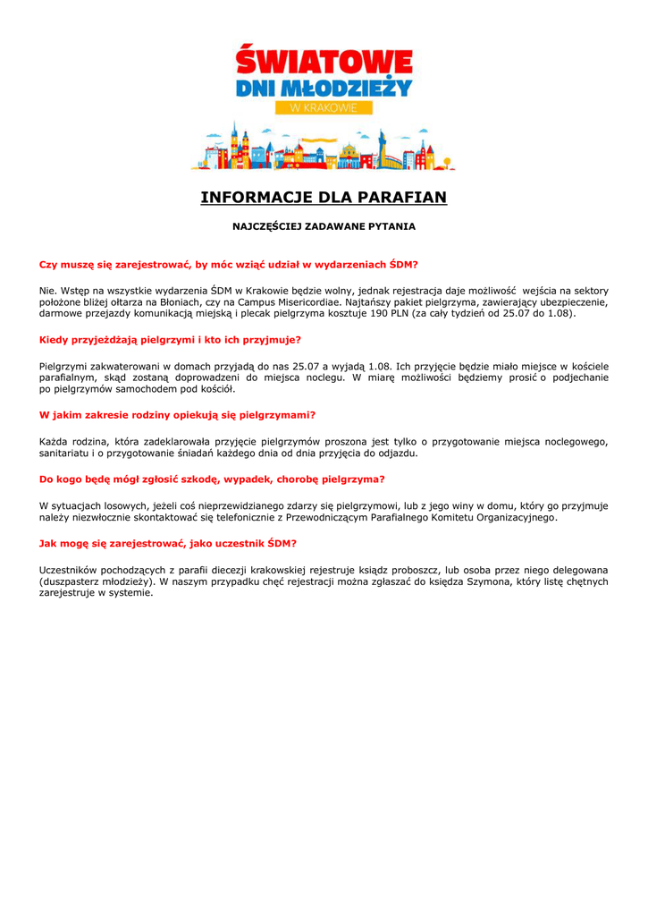 INFORMACJE DLA PARAFIAN NAJCZĘŚCIEJ ZADAWANE PYTANIA Czy muszę się zarejestrować, by móc wziąć udział w wydarzeniach ŚDM? Nie. Wstęp na wszystkie wydarzenia ŚDM w Krakowie będzie wolny, jednak rejestracja daje możliwość wejścia na sektory położone bliżej ołtarza na Błoniach, czy na Campus Misericordiae. Najtańszy pakiet pielgrzyma, zawierający ubezpieczenie, darmowe przejazdy komunikacją miejską i plecak pielgrzyma kosztuje 190 PLN (za cały tydzień od 25.07 do 1.08). Kiedy przyjeżdżają pielgrzymi i kto ich przyjmuje? Pielgrzymi zakwaterowani w domach przyjadą do nas 25.07 a wyjadą 1.08. Ich przyjęcie będzie miało miejsce w kościele parafialnym, skąd zostaną doprowadzeni do miejsca noclegu. W miarę możliwości będziemy prosić o podjechanie po pielgrzymów samochodem pod kościół. W jakim zakresie rodziny opiekują się pielgrzymami? Każda rodzina, która zadeklarowała przyjęcie pielgrzymów proszona jest tylko o przygotowanie miejsca noclegowego, sanitariatu i o przygotowanie śniadań każdego dnia od dnia przyjęcia do odjazdu. Do kogo będę mógł zgłosić szkodę, wypadek, chorobę pielgrzyma? W sytuacjach losowych, jeżeli coś nieprzewidzianego zdarzy się pielgrzymowi, lub z jego winy w domu, który go przyjmuje należy niezwłocznie skontaktować się telefonicznie z Przewodniczącym Parafialnego Komitetu Organizacyjnego. Jak mogę się zarejestrować, jako uczestnik ŚDM? Uczestników pochodzących z parafii diecezji krakowskiej rejestruje ksiądz proboszcz, lub osoba przez niego delegowana (duszpasterz młodzieży). W naszym przypadku chęć rejestracji można zgłaszać do księdza Szymona, który listę chętnych zarejestruje w systemie.