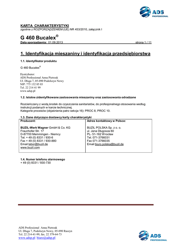 KARTA CHARAKTERYSTYKI zgodnie z ROZPORZĄDZENIEM (UE) NR 453/2010, załącznik I G 460 Bucalex® Data sporządzenia: 01.09.2013 strona 1 / 11 1. Identyfikacja mieszaniny i identyfikacja przedsiębiorstwa 1.1. Identyfikator produktu G 460 Bucalex ® Dystrybutor: ADS Professional Anna Pietrzak Ul. Długa 7, 05-090 Podolszyn Nowy NIP: 775 132 85 03 Tel. 22 214 41 99 www.adsp.pl 1.2. Istotne zidentyfikowane zastosowania mieszaniny oraz zastosowania odradzane Rozcieńczany z wodą środek do czyszczenia sanitariatów, do profesjonalnego stosowania według instrukcji podanych w karcie technicznej. Kategorie procesów (objaśnienia patrz sekcja 16): PROC 8, PROC 10. 1.3. Dane dotyczące dostawcy karty charakterystyki Producent: Adres kontaktowy w Polsce: BUZIL-Werk Wagner GmbH & Co. KG Fraunhofer Str. 17 D-87700 Memmingen - Niemcy Tel. + 49 (0) 8331 / 930-6 Fax + 49 (0) 8331 / 930-880 Email [email protected] www.buzil.com BUZIL POLSKA Sp. z o. o. ul. Jana Długosza 60 PL- 51-162 Wrocław Tel. 071-3766031 Fax 071-3766035 Email [email protected] 1.4. Numer telefonu alarmowego + 49 (0) 8331 / 930-730 ADS Professional Anna Pietrzak Ul. Długa 7, Podolszyn Nowy, 05-090 Raszyn Tel. 22 214-41-99, fax. 22 379-64-73 www.adsp.pl [email protected] Strona 1 KARTA CHARAKTERYSTYKI zgodnie z ROZPORZĄDZENIEM (UE) NR 453/2010, załącznik I G 460 Bucalex® Data sporządzenia: 01.09.2013 strona 2 / 11 2. Identyfikacja zagrożeń 2.1. Klasyfikacja mieszaniny R 34 Powoduje oparzenia. 2.2. Elementy oznakowania (według 1999/45/WE) Produkt żrący. R 34 Powoduje oparzenia. S 2 Chronić przed dziećmi. S 26 Zanieczyszczone oczy przemyć natychmiast dużą ilością wody i zasięgnąć porady lekarza. S 28 Zanieczyszczoną skórę natychmiast przemyć dużą ilością wodą i mydłem. S 36/37/39 Nosić odpowiednią odzież ochronną, odpowiednie rękawice ochronne i okulary lub ochronę twarzy. S 45 W przypadku awarii lub jeżeli źle się poczujesz, niezwłocznie zasięgnij porady lekarza - jeżeli to możliwe, pokaż etykietę. Zawiera kwas fosforowy. 2.3. Inne zagrożenia Produkt nie zawiera substancji zidentyfikowanych według 1907/2006/W E załącznik XIII jako trwałe, wykazujące zdolność do bioakumulacji i toksyczne (PBT) lub bardzo trwałe i wykazujące bardzo dużą zdolność do bioakumulacji (vPvB). Po wymiotach niebezpieczeństwo uduszenia się w wyniku tworzenia się piany. ADS Professional Anna Pietrzak Ul. Długa 7, Podolszyn Nowy, 05-090 Raszyn Tel. 22 214-41-99, fax. 22 379-64-73 www.adsp.pl [email protected] Strona 2 KARTA CHARAKTERYSTYKI zgodnie z ROZPORZĄDZENIEM (UE) NR 453/2010, załącznik I G 460 Bucalex® Data sporządzenia: 01.09.2013 strona 3 / 11 3. Skład / informacja o składnikach Skład (zgodnie z 648/2004/WE): <5% niejonowych środków powierzchniowo czynnych, zawiera substancje zapachowe (Hexyl Cinnamal, Benzyl Salicylate). Inne składniki: kwasy nieorganiczne, substancje pomocnicze, barwniki. Składniki niebezpieczne: 15-30% kwasu fosforowego, CAS 7664-38-2, EINECS/ELINCS 231-633-2 C - Produkt żrący; R 34 Skin Corr. 1B; H 314 3 Najwyższe dopuszczalne stężenie (8 godzin): 1 mg / m Toksyczność ostra: DL50 (skóra, szczur) > 2000 mg / kg DL50 (droga pokarmowa, szczur) > 2000 mg / kg DL50 (wdychanie pyłu/mgły, szczur) > 5 mg/l/4h 1-5% niejonowych środków powierzchniowo czynnych, CAS 13127-82-7, EINECS/ELINCS 236-062-2 C - Produkt żrący; N - Produkt niebezpieczny dla środowiska; R 22, R 34, R 50 Acute Tox. 4; Skin Corr. 1B; Aquatic Acute 1; H 302, H 314, H 400 Toksyczność ostra: DL50 (skóra, szczur) > 2000 mg / kg DL50 (droga pokarmowa, szczur) > 200 mg / kg DL50 (wdychanie pyłu/mgły, szczur) > 5 mg/l/4h Brzmienia wymienionych zwrotów R oraz zwrotów określających rodzaj zagrożenia (H) znajdują się w sekcji 16. ADS Professional Anna Pietrzak Ul. Długa 7, Podolszyn Nowy, 05-090 Raszyn Tel. 22 214-41-99, fax. 22 379-64-73 www.adsp.pl [email protected] Strona 3 KARTA CHARAKTERYSTYKI zgodnie z ROZPORZĄDZENIEM (UE) NR 453/2010, załącznik I G 460 Bucalex® Data sporządzenia: 01.09.2013 strona 4 / 11 4. Środki pierwszej pomocy 4.1. Opis środków pierwszej pomocy Po wdychaniu: Przy użyciu zgodnym z instrukcją nie przewiduje się narażenia poprzez inhalację. Po kontakcie z skórą: Zdjąć zanieczyszczoną odzież, przemyć skórę wodą i mydłem i spłukać dużą ilością wody. Po kontakcie z oczami: Zanieczyszczone oczy przemyć natychmiast dużą ilością wody. Kontynuować przemywanie przez kilka minut i zasięgnąć porady lekarskiej. Po połknięciu: W ypłukać usta wodą i podać do wypicia jak największe ilości wody. Nie wywoływać wymiotów, skontaktować się z lekarzem. 4.2. Najważniejsze ostre i opóźnione objawy oraz skutki narażenia Patrz sekcja 11. 4.3. Wskazania dotyczące wszelkiej natychmiastowej pomocy lekarskiej i szczególnego postępowania z poszkodowanym Stosować leczenie objawowe. W przypadku połknięcia większych ilości podać środek przeciwdziałający pienieniu (Dimetikon). 5. Postępowanie w przypadku pożaru 5.1. Środki gaśnicze Odpowiednie: woda, odporna na alkohole piana, dwutlenek węgla, proszek gaśniczy. Niewłaściwe: W oda pełnym strumieniem. 5.2. Szczególne zagrożenia związane z mieszaniną Możliwe produkty spalenia: tlenek węgla, dwutlenek węgla. 5.3. Informacje dla straży pożarnej Sam produkt nie pali się; pożar w otoczeniu gasić środkami odpowiednimi dla przyczyny pożaru. ADS Professional Anna Pietrzak Ul. Długa 7, Podolszyn Nowy, 05-090 Raszyn Tel. 22 214-41-99, fax. 22 379-64-73 www.adsp.pl [email protected] Strona 4 KARTA CHARAKTERYSTYKI zgodnie z ROZPORZĄDZENIEM (UE) NR 453/2010, załącznik I G 460 Bucalex® Data sporządzenia: 01.09.2013 strona 5 / 11 6. Postępowanie w przypadku niezamierzonego uwolnienia do środowiska 6.1. Indywidualne środki ostrożności, wyposażenie ochronne i procedury w sytuacjach awaryjnych Zapobiegać kontaktowi ze skórą i oczami. Nosić odpowiedni