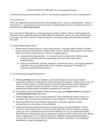 UWAGI OGÓLNE O PRAWIE. Po co są przepisy prawne? Człowiek rozumny powinien działać celowo, więc przytoczę argumenty na rzecz istnienia prawa. Co to jest prawo? Prawo jest organizacją społeczną (zestaw norm postępowania - ustawy, rozporządzenia + policja + sadownictwo + więziennictwo) ustanowioną przez władze państwa i przez te władze stosowane za pośrednictwem aparatu przymusu. Po co jest prawo? Dla państwa i osób sprawujących władzę. Gdyby władza w pełni należała do obywateli, prawo dobre dla państwa byłoby dobre dla obywateli. Tak nie jest, gdyż każda władza się alienuje, ale i tak w interesie władzy jest prawo w pewnym stopniu korzystne dla zwykłych obywateli. I. Czynniki degenerujące prawo: 1. Władza chroni własne interesy (a więc osób bogatych – pieniądz rządzi światem). Władza nie pozwala aby ją kontrolować, władzę trudno zmienić. Każda władza dąży do umocnienia siebie i do kontroli społeczeństwa. Może to osiągnąć poprzez: a) Jawną kontrolę bezpośrednią – w systemach jawnie totalitarnych. Każdy system totalitarny uzasadnia istnienie represyjnego prawa potrzebą zapewnienia bezpieczeństwa. b) Poprzez rozbudowane, niejasne, niespójne i restrykcyjne prawo. Zawierające klauzule generalne. Na niewygodną osobę zawsze znajdzie się paragraf i wykładnia. W systemach pseudodemokratycznych. II. Czynniki hamujące degenerację prawa. a) Władzy powinno zależeć na stabilnym, sprawnie działającym i tym samym silnym gospodarczo państwie. Słabe państwo ginie pod naporem sąsiadów i władza wraz z nim. Ale może to trwać to długo, a władza tego nie zauważać, zajęta ochroną swoich doraźnych interesów. Przykład: wolność szlachecka w Polsce i brak oczynszowania w miejsce pańszczyzny doprowadziły do słabości gospodarczej i rozbiorów. b) Aby państwo sprawnie działało, władza powinna zapewnić bezpieczeństwo wewnętrzne i wysoką produktywność obywateli. c) Władza musi zapłacić cenę za spokój społeczny: albo rozbudowany aparat ucisku (a to kosztuje), albo chociaż pozory demokracji, praworządności i wolności obywatelskich d) Wysoka produktywność jest możliwa jedynie przy znacznym zakresie swobód obywatelskich (z niewolnika nie ma robotnika). e) Celem zapewnienia bezpieczeństwa prawo wprowadza pewną redystrybucję, również wolności: chroni jedne prawa i wolności ograniczając inne. Chroni wartości wyższego rzędu, np. życie i własność kosztem wolności złodzieja. Lecz tu jest niebezpieczeństwo. Rozbudowana redystrybucja staje się niesprawna i przynosi straty większe niż zyski. Mamy jeden z najgorszych w UE systemów prawnych. Złodziej i oszust pozostają bezkarni, a uczciwy obywatel nie jest w stanie wypełnić obowiązków formalnych i nie podejmuje działalności, zostaje nieproduktywny. 1. Pozytywne strony uregulowań prawnych. Prawo: a) Stosowane z umiarem usprawnia funkcjonowanie państwa. Stabilizuje życie społeczne. b) Zmniejsza koszty społeczne walki o władze, np. utrudniając szybkie zmiany ludzi lub grup społecznych sprawujących władzę. c) Umożliwia sprawowanie władzy osobom sprytnym, umiejącym manipulować ludźmi i budować koalicje w miejsce osób bezwzględnie terroryzujących innych. d) Spłaszcza nierówności społeczne, zarówno w sferze niematerialnej (wolności), jak i materialnej (ekonomicznej), zwiększając efektywność funkcjonowania państwa. e) Porządkuje życie społeczne pełniąc funkcję wychowawczą i informacyjną, np. ruch prawostronny. 2. Negatywne strony uregulowań prawnych: a) Ograniczają wolność obywateli. Czasem jedynie dla wygody urzędników. b) Pochłaniają koszty ich tworzenia i egzekwowania. c) Powodują inflację prawa (http://pl.wikipedia.org/wiki/Inflacja_prawa) - jeżeli jest dużo przepisów, są niezrozumiałe, niecelowe, zbyt szczegółowe to powodują brak poszanowania całego prawa, dławią aktywność i destabilizują życie społeczne. Rozdęte prawo daje gorsze efekty niż prawo umiarkowane, podobnie jak fiskalizm. (krzywa Laffera). 3. Nie akceptowalne powody tworzenia przepisów prawnych: a. tworzenie dochodu dla pewnych grup społecznych kosztem reszty społeczeństwa (urzędnicze miejsca pracy, korupcja, ochrona korporacji przed konkurencją) b. radość sprawowania władzy c. ograniczanie komuś wolności dla jego dobra (dobra w rozumieniu osoby tworzącej prawo), zakazywanie czynności niebezpiecznych wyłącznie dla sprawcy. W systemach totalitarnych niewolnik lub chłop był własnością pana (w komunizmie obywatel własnością państwa) i to właściciel decydował co jest dobre, bezpieczne dla poddanego. Tak jak decydujemy o sposobie użytkowania narzędzia. Obecnie dopuszczalne w stosunku do dzieci. Nie traktujmy dorosłych obywateli jak dzieci lub idiotów. Zdecydowana większość ludzi ma dobrze rozwinięty instynkt samozachowawczy, a samobójców i tak prawo nie powstrzyma. Argumenty na rzecz regulacji pozaprawnych. Chcąc osiągnąć jakiś cel społeczny należy zawsze w pierwszej kolejności rozpatrzeć pozaprawne sposoby jego uzyskania, a metody prawne stosować, ze względu na ich koszty dopiero gdy są one skuteczniejsze i tańsze od innych. 1. Np. aby ograniczyć ilość utonięć należy prowadzić naukę pływania w szkołach, a nie zakazy kąpieli i karty pływackie. Przez 10 lat po zniesieniu kart pływackich nie wzrosła ilość utonięć! 2. Przez 10 lat od zniesienia kart rowerowych nie wzrosła ilość wypadków spowodowanych przez rowerzystów! 3. Przez ponad 5 lat od zniesienia wymogu uprawnień na prowadzenie jachtów do 7,5 m długości na śródlądziu spadła ilość wypadków żeglarskich! 4. W Polsce w wielu sportach podwyższonego ryzyka nie ma obowiązkowych uprawnień państwowych (nurkowanie, kajakarstwo górskie, kolarstwo górskie, wspinaczka, narciarstwo, jazda konna) 5. W wielu przypadkach rozwiązania pozaprawne (np. nieobowiązkowe szkolenia, nadzó