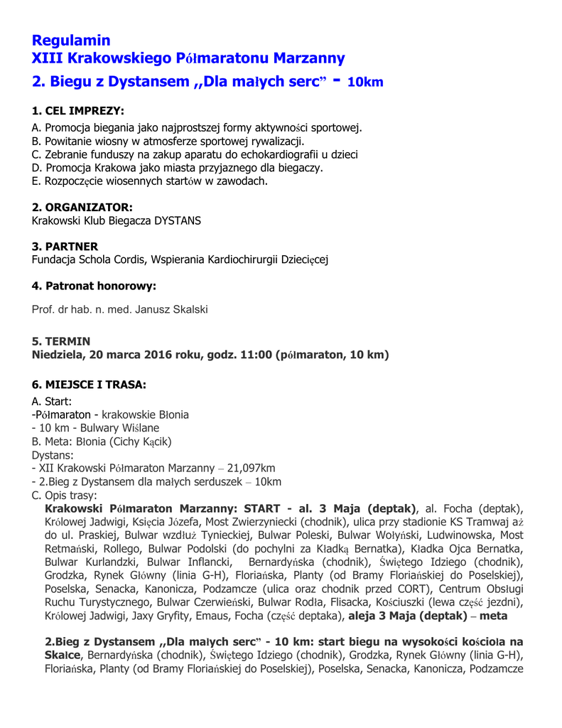 Regulamin XIII Krakowskiego Półmaratonu Marzanny 2. Biegu z Dystansem ,,Dla małych serc” - 10km 1. CEL IMPREZY: A. Promocja biegania jako najprostszej formy aktywności sportowej. B. Powitanie wiosny w atmosferze sportowej rywalizacji. C. Zebranie funduszy na zakup aparatu do echokardiografii u dzieci D. Promocja Krakowa jako miasta przyjaznego dla biegaczy. E. Rozpoczęcie wiosennych startów w zawodach. 2. ORGANIZATOR: Krakowski Klub Biegacza DYSTANS 3. PARTNER Fundacja Schola Cordis, Wspierania Kardiochirurgii Dziecięcej 4. Patronat honorowy: Prof. dr hab. n. med. Janusz Skalski 5. TERMIN Niedziela, 20 marca 2016 roku, godz. 11:00 (półmaraton, 10 km) 6. MIEJSCE I TRASA: A. Start: -Półmaraton - krakowskie Błonia - 10 km - Bulwary Wiślane B. Meta: Błonia (Cichy Kącik) Dystans: - XII Krakowski Półmaraton Marzanny – 21,097km - 2.Bieg z Dystansem dla małych serduszek – 10km C. Opis trasy: Krakowski Półmaraton Marzanny: START - al. 3 Maja (deptak), al. Focha (deptak), Królowej Jadwigi, Księcia Józefa, Most Zwierzyniecki (chodnik), ulica przy stadionie KS Tramwaj aż do ul. Praskiej, Bulwar wzdłuż Tynieckiej, Bulwar Poleski, Bulwar Wołyński, Ludwinowska, Most Retmański, Rollego, Bulwar Podolski (do pochylni za Kładką Bernatka), Kładka Ojca Bernatka, Bulwar Kurlandzki, Bulwar Inflancki, Bernardyńska (chodnik), Świętego Idziego (chodnik), Grodzka, Rynek Główny (linia G-H), Floriańska, Planty (od Bramy Floriańskiej do Poselskiej), Poselska, Senacka, Kanonicza, Podzamcze (ulica oraz chodnik przed CORT), Centrum Obsługi Ruchu Turystycznego, Bulwar Czerwieński, Bulwar Rodła, Flisacka, Kościuszki (lewa część jezdni), Królowej Jadwigi, Jaxy Gryfity, Emaus, Focha (część deptaka), aleja 3 Maja (deptak) – meta 2.Bieg z Dystansem ,,Dla małych serc” - 10 km: start biegu na wysokości kościoła na Skałce, Bernardyńska (chodnik), Świętego Idziego (chodnik), Grodzka, Rynek Główny (linia G-H), Floriańska, Planty (od Bramy Floriańskiej do Poselskiej), Poselska, Senacka, Kanonicza, Podzamcze (ulica oraz chodnik przed CORT), Centrum Obsługi Ruchu Turystycznego, Bulwar Czerwieński, Bulwar Rodła, Flisacka, Kościuszki (lewa część jezdni), Królowej Jadwigi, Jaxy Gryfity, Emaus, Focha (część deptaka), aleja 3 Maja (deptak) – meta. D. Trasy posiadają atest PZLA 7. WARUNKI UCZESTNICTWA: A. Do startu w półmaratonie oraz biegu na 10 km zostaną dopuszczeni zawodniczki i zawodnicy, którzy: B. Do dnia 20.03.2016 roku ukończą 18 rok życia; C. Dokonają zgłoszenia za pośrednictwem formularza dostępnego na stronie internetowej lub zapiszą się bezpośrednio w Biurze Zawodów (pod warunkiem nie wyczerpania limitu uczestników); D. Uiszczą opłatę startową; E. Okażą dokument tożsamości i podpiszą oświadczenie o braku przeciwwskazań zdrowotnych do startu w biegu oraz znajomości niniejszego regulaminu i jego akceptacji, oświadczenie o zgodzie na wykorzystanie swojego wizerunku do celów promocyjnych biegów organizowanych przez KKB Dystans oraz przetwarzanie danych osobowych na potrzeby przeprowadzenia imprezy. F. Zawodnicy przed startem mają obowiązek ustawić się w strefie zgodnie z zadeklarowanym przez siebie planowanym czasem ukończenia biegu. G. Limit czasu na pokonanie trasy: półmaratonu 3 godziny 15 minut, biegu na 10 km 1 godzina 30 minut. H. Biegacze, którzy nie dobiegną do linii mety w podanych powyżej czasach są zobowiązani do przerwania biegu. Osoby znajdujące się na trasie po zakończeniu limitu czasu mają obowiązek stosowania się do przepisów ruchu drogowego. Uwaga! Powyższe zastrzeżenia odnoszą się także do zawodników, którzy na 16km trasy znajdą się po upływie 2 godzin i 40 minut. I. Organizator ustala limit startujących zawodników na : XII Krakowskiego Półmaratonu Marzanny – 4000 osób 2. Biegu z Dystansem dla małych serduszek (10 km) – 1500 osób J. Pomiar czasu: elektroniczny za pomocą chipów. K. Pomiar czasu netto. Dla 50 pierwszych zawodników pomiar czasu brutto. 8. PROGRAM ZAWODÓW: Sobota 19 III 2016 godz. 12:00 - otwarcie Biura Zawodów, godz. 21:00 - zamknięcie Biura Zawodów. Niedziela 20 III 2016 godz. 7:00 - otwarcie Biura Zawodów, godz.10:15 - zakończenie przyjmowania zgłoszeń (półmaraton oraz bieg na 10km), godz.10:40 - symboliczne pożegnanie zimy – topienie Marzanny, godz.11:00 - start Półmaratonu oraz biegu na 10km, godz.14:30 - oficjalne zakończenie zawodów. 9. BIURO ZAWODÓW I ZAPLECZE BIEGU: A. Biuro zawodów (adres zostanie podany w aneksie do Regulaminu) B. Biuro Zawodów czynne: - w dniu 19.03.2016 r. w godzinach 12.00-21.00, - w dniu 20.03.2016 r. w godzinach 7.00-10.15. C. Depozyt odzieży czynny w godz. 8:30-14:30 (worki na odzież będą do pobrania przy depozycie). D. Organizator nie odpowiada za rzeczy wartościowe zdeponowane w przechowalni. E. Organizator zapewnia podręczny depozyt w okolicy startu biegu na 10km; który zostanie dostarczony do depozytu głównego (w okolicy mety). F. Depozyt Główny, będzie znajdował się na krakowskich Błoniach w namiocie 10. ZGŁOSZENIA I OPŁATA STARTOWA: A. Zgłoszenia: - elektroniczne: przez formularz zgłoszeniowy na stronie internetowej biegu do dnia 13 marca 2016 roku; - w Biurze Zawodów w dniach 19-20 marca 2016r. B. Opłata startowa wynosi odpowiednio: Termin 21km 10km do dnia 31.12.2015 (czwartek) 55 zł 40 zł do dnia 13.03.2016 (niedziela) 90 zł 50 zł Forma wpłaty Przelew Przelew gotówka w Biurze Zawodów (pod warunkiem w dniach 19-20.03.2016 niewyczerpania limitu 4000 osób – Półmaraton i (sobota, niedziela) 1500 osób bieg 10km) 120,00 zł 70,00 zł C. Opłatę startowa należy wpłacać na konto: KKB Dystans, ul. Glinik 108 a, 31-990 Kraków, UWAGA ZMIANA KONTA BANKOWEGO! Alior Bank 12 2490 0005 0000 4600 9939 5237 Tytuł przelewu: Półmaraton Marzanny 2016 lub 2. Bieg z Dystansem "Dla małych serc", imię i nazwisko, miejsce zamieszkania oraz data urodzenia zawodnika