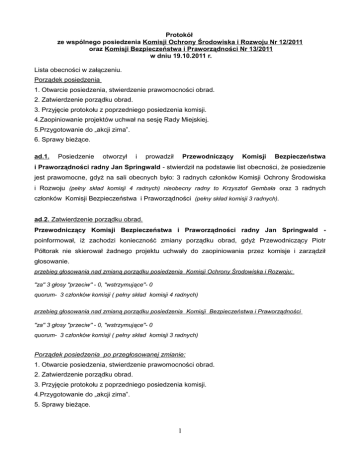 Protokół ze wspólnego posiedzenia Komisji Ochrony Środowiska i Rozwoju Nr 12/2011 oraz Komisji Bezpieczeństwa i Praworządności Nr 13/2011 w dniu 19.10.2011 r. Lista obecności w załączeniu. Porządek posiedzenia 1. Otwarcie posiedzenia, stwierdzenie prawomocności obrad. 2. Zatwierdzenie porządku obrad. 3. Przyjęcie protokołu z poprzedniego posiedzenia komisji. 4.Zaopiniowanie projektów uchwał na sesję Rady Miejskiej. 5.Przygotowanie do „akcji zima”. 6. Sprawy bieżące. ad.1. Posiedzenie otworzył i prowadził Przewodniczący Komisji Bezpieczeństwa i Praworządności radny Jan Springwald - stwierdził na podstawie list obecności, że posiedzenie jest prawomocne, gdyż na sali obecnych było: 3 radnych członków Komisji Ochrony Środowiska i Rozwoju (pełny skład komisji 4 radnych) nieobecny radny to Krzysztof Gembała oraz 3 radnych członków Komisji Bezpieczeństwa i Praworządności (pełny skład komisji 3 radnych). ad.2. Zatwierdzenie porządku obrad. Przewodniczący Komisji Bezpieczeństwa i Praworządności radny Jan Springwald poinformował, iż zachodzi konieczność zmiany porządku obrad, gdyż Przewodniczący Piotr Półtorak nie skierował żadnego projektu uchwały do zaopiniowania przez komisje i zarządził głosowanie. przebieg głosowania nad zmianą porządku posiedzenia Komisji Ochrony Środowiska i Rozwoju: "za" 3 głosy "przeciw" - 0, "wstrzymujące"- 0 quorum- 3 członków komisji ( pełny skład komisji 4 radnych) przebieg głosowania nad zmianą porządku posiedzenia Komisji Bezpieczeństwa i Praworządności "za" 3 głosy "przeciw" - 0, "wstrzymujące"- 0 quorum- 3 członków komisji ( pełny skład komisji 3 radnych) Porządek posiedzenia po przegłosowanej zmianie: 1. Otwarcie posiedzenia, stwierdzenie prawomocności obrad. 2. Zatwierdzenie porządku obrad. 3. Przyjęcie protokołu z poprzedniego posiedzenia komisji. 4.Przygotowanie do „akcji zima”. 5. Sprawy bieżące. 1 ad.3.Przyjęcie protokołu z poprzedniego posiedzenia komisji. Komisje nie wniosły uwag do protokołu z poprzedniego posiedzenia komisji. Protokół nr 12/2011 z posiedzenia Komisji Bezpieczeństwa i Praworządności z dnia 26.09.2011 r. został przyjęty w następującym głosowaniu: "za" 3 głosy "przeciw" - 0, "wstrzymujące"- 0 quorum- 3 członków komisji ( pełny skład 3 radnych). Protokół nr 11/2011 z posiedzenia Komisji Ochrony Środowiska i Rozwoju z dnia 26.09.2011 r. został przyjęty w następującym głosowaniu: "za" 3 głosy "przeciw" - 0, "wstrzymujące"- 0 quorum- 3 członków komisji ( pełny skład 4 radnych). ad.4. Przygotowanie do „akcji zima”. Przewodniczący Komisji Bezpieczeństwa i Praworządności radny Jan Springwald - poprosił Pana Cezarego Sękowskiego Naczelnika Wydziału Inwestycji i Rozwoju o krótką informację dotyczącą najbliższej „akcji zima” w Lublińcu. Naczelnik Wydziału Inwestycji i Rozwoju Cezary Sękowski - poinformował zebranych, że w dniu 11.10.2011 r. zostały podpisane umowy z dwoma firmami na odśnieżanie miasta podczas zimy przełomu 2011/2012, w tym celu został wcześniej przeprowadzony przetarg nieograniczony do którego przystąpiły 4 firmy, z których wybrano Spółkę z o. o. „A.S.A” oraz przedsiębiorstwo „Larix”. Kontynuując wskazał, że miasto zostało podzielone na dwa rejony, tak jak poprzednio, za rejon I będzie odpowiadać spółka „ASA”, natomiast odśnieżanie drugiego rejonu to zadanie firmy „Larix”. Przewodniczący Komisji Bezpieczeństwa i Praworządności radny Jan Springwald - zapytał, na jakie kwoty opiewają umowy ? Naczelnik Wydziału Inwestycji i Rozwoju Cezary Sękowski – odpowiedział, że rejon I to kwota około 300 tysięcy zł, natomiast rejon II to około 340 tysięcy zł. Radny Ryszard Kozok – wskazał, że jest to znacznie więcej, niż podczas akcji zima 2010/2011. Naczelnik Wydziału Inwestycji i Rozwoju Cezary Sękowski – stwierdził, że to prawda, jednakże w przeciągu roku sól do posypywania dróg i chodników podrożała ponad 100%, ceny paliwa także znacznie wzrosły, do tego należy doliczyć koszty ekstrapolacji, a w wyniku zmiany kategorii dróg 2 drogami miejskimi stały się np. ul. Mickiewicza, Piłsudskiego, Lisowicka, Częstochowska, Kilińskiego oraz trasa śródmiejska. Reasumując stwierdził, że przystępując do przetargu Miasto liczyło się z tym, że wartość umów może osiągnąć kwotę 800 tysięcy zł. Przewodniczący Komisji Ochrony Środowiska i Rozwoju radny Janusz Kopyciok – wskazał, że należałoby umieścić w „Nowinach Lublinieckich”, krótką informację kto odpowiada za odśnieżanie miasta oraz podać numery telefonów alarmowych do tych firm. Naczelnik Wydziału Inwestycji i Rozwoju Cezary Sękowski – stwierdził, że co roku taka informacja ukazuje się w „Nowinach Lublinieckich” oraz na stronach internetowych miasta Lublińca. Radny Marcin Małek - zapytał, z jakiej części miasta będzie wywożony śnieg? Naczelnik Wydziału Inwestycji i Rozwoju Cezary Sękowski – odpowiedział, że w ciągu 1h po ustaniu opadów śnieg będzie wywożony z centrum miasta tj. z Rynku i okolic oraz z ul. Paderewskiego. Przewodniczący Komisji Bezpieczeństwa i Praworządności radny Jan Springwald - wskazał, że ulica Mickiewicza oraz Kilińskiego są bardzo wąskie i według Przewodniczącego śnieg powinien być także wywożony z tych ulic. Naczelnik Wydziału Inwestycji i Rozwoju Cezary Sękowski – stwierdził, że ul. Mickiewicza posiada dwa pasy ruchu, a podczas ostatniej akcji zima 2010/2011 wywieziono aż 3 tysiące metrów sześciennych śniegi. Kontynuując wskazał, że planując akcję należy mieć na uwadze środki finansowe, którymi dysponuje Miasto, dlatego też jeśli będą utrudnienia na ul. Mickiewicza lub ul. Kilińskiego, a także na każdej innej ulicy miejskiej to śnieg zostanie wywieziony. Przewodniczący Komisji Ochrony Środowiska i Rozwoju radny Janusz Kopyciok