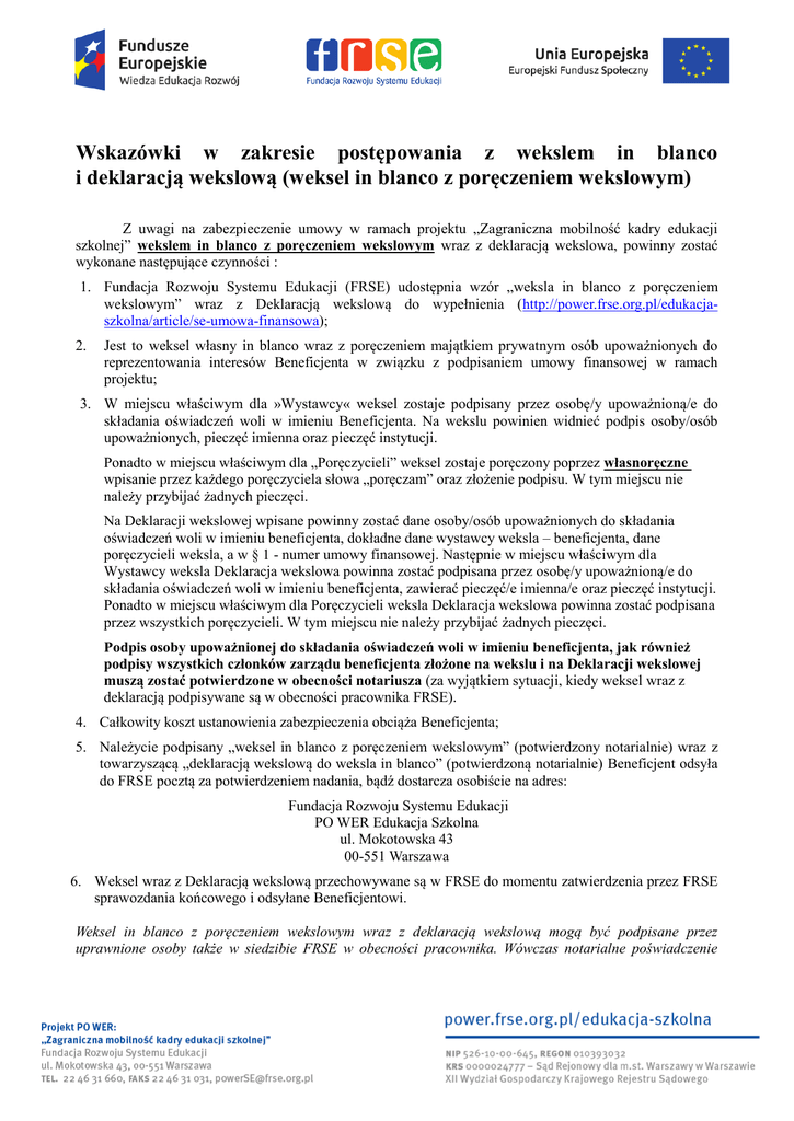 Wskazówki w zakresie postępowania z wekslem in blanco i deklaracją wekslową (weksel in blanco z poręczeniem wekslowym) Z uwagi na zabezpieczenie umowy w ramach projektu „Zagraniczna mobilność kadry edukacji szkolnej” wekslem in blanco z poręczeniem wekslowym wraz z deklaracją wekslowa, powinny zostać wykonane następujące czynności : 1. Fundacja Rozwoju Systemu Edukacji (FRSE) udostępnia wzór „weksla in blanco z poręczeniem wekslowym” wraz z Deklaracją wekslową do wypełnienia (http://power.frse.org.pl/edukacjaszkolna/article/se-umowa-finansowa); 2. Jest to weksel własny in blanco wraz z poręczeniem majątkiem prywatnym osób upoważnionych do reprezentowania interesów Beneficjenta w związku z podpisaniem umowy finansowej w ramach projektu; 3. W miejscu właściwym dla »Wystawcy« weksel zostaje podpisany przez osobę/y upoważnioną/e do składania oświadczeń woli w imieniu Beneficjenta. Na wekslu powinien widnieć podpis osoby/osób upoważnionych, pieczęć imienna oraz pieczęć instytucji. Ponadto w miejscu właściwym dla „Poręczycieli” weksel zostaje poręczony poprzez własnoręczne wpisanie przez każdego poręczyciela słowa „poręczam” oraz złożenie podpisu. W tym miejscu nie należy przybijać żadnych pieczęci. Na Deklaracji wekslowej wpisane powinny zostać dane osoby/osób upoważnionych do składania oświadczeń woli w imieniu beneficjenta, dokładne dane wystawcy weksla – beneficjenta, dane poręczycieli weksla, a w § 1 - numer umowy finansowej. Następnie w miejscu właściwym dla Wystawcy weksla Deklaracja wekslowa powinna zostać podpisana przez osobę/y upoważnioną/e do składania oświadczeń woli w imieniu beneficjenta, zawierać pieczęć/e imienna/e oraz pieczęć instytucji. Ponadto w miejscu właściwym dla Poręczycieli weksla Deklaracja wekslowa powinna zostać podpisana przez wszystkich poręczycieli. W tym miejscu nie należy przybijać żadnych pieczęci. Podpis osoby upoważnionej do składania oświadczeń woli w imieniu beneficjenta, jak również podpisy wszystkich członków zarządu beneficjenta złożone na wekslu i na Deklaracji wekslowej muszą zostać potwierdzone w obecności notariusza (za wyjątkiem sytuacji, kiedy weksel wraz z deklaracją podpisywane są w obecności pracownika FRSE). 4. Całkowity koszt ustanowienia zabezpieczenia obciąża Beneficjenta; 5. Należycie podpisany „weksel in blanco z poręczeniem wekslowym” (potwierdzony notarialnie) wraz z towarzyszącą „deklaracją wekslową do weksla in blanco” (potwierdzoną notarialnie) Beneficjent odsyła do FRSE pocztą za potwierdzeniem nadania, bądź dostarcza osobiście na adres: Fundacja Rozwoju Systemu Edukacji PO WER Edukacja Szkolna ul. Mokotowska 43 00-551 Warszawa 6. Weksel wraz z Deklaracją wekslową przechowywane są w FRSE do momentu zatwierdzenia przez FRSE sprawozdania końcowego i odsyłane Beneficjentowi. Weksel in blanco z poręczeniem wekslowym wraz z deklaracją wekslową mogą być podpisane przez uprawnione osoby także w siedzibie FRSE w obecności pracownika. Wówczas notarialne poświadczenie podpisów na tych dokumentach nie jest wymagane. Weksel wraz z deklaracją wekslową przechowywane są w Fundacji Rozwoju Systemu Edukacji do momentu ostatecznego rozliczenia projektu i odsyłane Beneficjentowi wraz z pismem zamykającym projekt i informującym o płatności końcowej albo niszczone, po wyrażeniu zgody Beneficjenta.