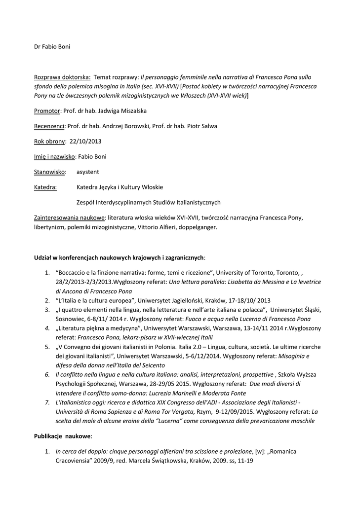 Dr Fabio Boni Rozprawa doktorska: Temat rozprawy: Il personaggio