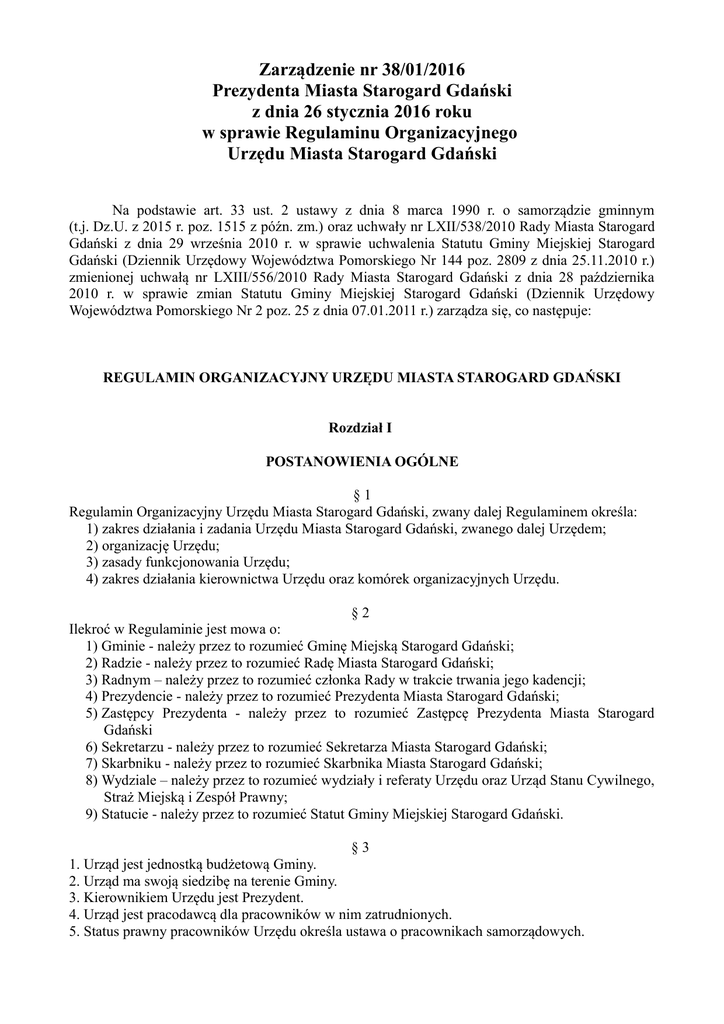 Zarządzenie nr 38/01/2016 Prezydenta Miasta Starogard Gdański z dnia 26 stycznia 2016 roku w sprawie Regulaminu Organizacyjnego Urzędu Miasta Starogard Gdański Na podstawie art. 33 ust. 2 ustawy z dnia 8 marca 1990 r. o samorządzie gminnym (t.j. Dz.U. z 2015 r. poz. 1515 z późn. zm.) oraz uchwały nr LXII/538/2010 Rady Miasta Starogard Gdański z dnia 29 września 2010 r. w sprawie uchwalenia Statutu Gminy Miejskiej Starogard Gdański (Dziennik Urzędowy Województwa Pomorskiego Nr 144 poz. 2809 z dnia 25.11.2010 r.) zmienionej uchwałą nr LXIII/556/2010 Rady Miasta Starogard Gdański z dnia 28 października 2010 r. w sprawie zmian Statutu Gminy Miejskiej Starogard Gdański (Dziennik Urzędowy Województwa Pomorskiego Nr 2 poz. 25 z dnia 07.01.2011 r.) zarządza się, co następuje: REGULAMIN ORGANIZACYJNY URZĘDU MIASTA STAROGARD GDAŃSKI Rozdział I POSTANOWIENIA OGÓLNE §1 Regulamin Organizacyjny Urzędu Miasta Starogard Gdański, zwany dalej Regulaminem określa: 1) zakres działania i zadania Urzędu Miasta Starogard Gdański, zwanego dalej Urzędem; 2) organizację Urzędu; 3) zasady funkcjonowania Urzędu; 4) zakres działania kierownictwa Urzędu oraz komórek organizacyjnych Urzędu. §2 Ilekroć w Regulaminie jest mowa o: 1) Gminie - należy przez to rozumieć Gminę Miejską Starogard Gdański; 2) Radzie - należy przez to rozumieć Radę Miasta Starogard Gdański; 3) Radnym – należy przez to rozumieć członka Rady w trakcie trwania jego kadencji; 4) Prezydencie - należy przez to rozumieć Prezydenta Miasta Starogard Gdański; 5) Zastępcy Prezydenta - należy przez to rozumieć Zastępcę Prezydenta Miasta Starogard Gdański 6) Sekretarzu - należy przez to rozumieć Sekretarza Miasta Starogard Gdański; 7) Skarbniku - należy przez to rozumieć Skarbnika Miasta Starogard Gdański; 8) Wydziale – należy przez to rozumieć wydziały i referaty Urzędu oraz Urząd Stanu Cywilnego, Straż Miejską i Zespół Prawny; 9) Statucie - należy przez to rozumieć Statut Gminy Miejskiej Starogard Gdański. §3 1. Urząd jest jednostką budżetową Gminy. 2. Urząd ma swoją siedzibę na terenie Gminy. 3. Kierownikiem Urzędu jest Prezydent. 4. Urząd jest pracodawcą dla pracowników w nim zatrudnionych. 5. Status prawny pracowników Urzędu określa ustawa o pracownikach samorządowych. Rozdział II ZAKRES DZIAŁANIA I ZADANIA URZĘDU §4 1. Urząd stanowi aparat pomocniczy organów Gminy. 2. Do zakresu działania Urzędu należy zapewnienie warunków należytego wykonywania spoczywających na Gminie zadań: 1) własnych, wynikających z ustawy o samorządzie gminnym oraz innych ustaw; 2) zleconych i powierzonych z zakresu działania organów administracji rządowej; 3) wykonywanych na podstawie porozumienia z organami administracji publicznej (zadań powierzonych). §5 W szczególności do zadań Urzędu należy: 1) obsługa mieszkańców miasta i innych osób w zakresie właściwości przedmiotu wnoszonej sprawy i obowiązujących przepisów; 2) przygotowywanie materiałów niezbędnych do podejmowania uchwał, zarządzeń, wydawania decyzji, postanowień i innych aktów z zakresu administracji publicznej oraz podejmowania innych czynności prawnych przez organy Gminy; 3) wykonywanie - na podstawie udzielonych upoważnień - czynności wchodzących w zakres zadań Gminy; 4) zapewnienie organom Gminy możliwości przyjmowania, rozpatrywania oraz załatwiania skarg i wniosków; 5) przygotowywanie projektów aktów organów Gminy; 6) realizacja innych obowiązków i uprawnień wynikających z przepisów prawa oraz uchwał i zarządzeń organów Gminy; 7) zapewnienie warunków organizacyjnych do odbywania sesji Rady i posiedzeń jej komisji; 8) prowadzenie zbioru przepisów gminnych oraz nieodpłatne udostępnianie w formie elektronicznej Dziennika Ustaw i Monitora Polskiego, dostępnych do powszechnego wglądu w siedzibie Urzędu oraz na stronie internetowej http://bip.starogard.pl; 9) wykonywanie prac kancelaryjnych zgodnie z obowiązującymi w tym zakresie przepisami prawa; 10) realizacja obowiązków i uprawnień służących Prezydentowi jako wykonawcy zadań z zakresu prawa pracy - zgodnie z obowiązującymi w tym zakresie przepisami. Rozdział III ORGANIZACJA URZĘDU §6 1. W skład Urzędu wchodzą następujące komórki organizacyjne: 1) Pełnomocnik Prezydenta do spraw Systemu Zarządzania Jakością; 2) Pełnomocnik Prezydenta do spraw Ochrony Informacji Niejawnych, pełniący jednocześnie obowiązki Administratora Bezpieczeństwa Informacji; 3) Pełnomocnik Prezydenta do spraw Organizacji Pozarządowych, Dzieci i Młodzieży; 4) Urząd Stanu Cywilnego; 5) Referat Kontroli i Zamówień Publicznych; 6) Straż Miejska; 7) Zespół Prawny; 8) Audytor Wewnętrzny; 9) Wydział Techniczno – Inwestycyjny; 10) Wydział Planowania i Urbanistyki; 11) Wydział Gospodarki Gruntami, Geodezji i Rolnictwa; 12) Wydział Inicjatyw Gospodarczych; 13) Referat Lokalowy; 14) Wydział Spraw Społecznych, którego pracownik pełni obowiązki Pełnomocnika Prezydenta do spraw Profilaktyki i Rozwiązywania Problemów Uzależnień; 15) Wydział Informacji Społecznej; 16) Wydział Spraw Obywatelskich; 17) Wydział Organizacyjny; 18) Wydział Finansowy; 19) Wydział Podatków i Ewidencji Dochodów; 20) Referat Windykacji; 21) Doradca Prezydenta do spraw Osób Niepełnosprawnych. 2. Wydziały, Zespoły i Referaty dzielą się na stanowiska pracy. Opracowania obowiązków służbowych dla poszczególnych pracowników dokonują osoby nimi kierujące po uzgodnieniu z Sekretarzem. 3. Wydziałami kierują Naczelnicy Wydziałów. 4. Urzędem Stanu Cywilnego kieruje Kierownik Urzędu Stanu Cywilnego. 5. Strażą Miejską kieruje Komendant Straży Miejskiej. 6. Zespołem Prawnym kieruje Koordynator Zespołu Prawnego. 7. Wydziałem Organizacyjnym kieruje Sekretarz Miasta. 8. Referatami kierują Kierownicy Referatów. §7 1. W Urzędzie są następujące stanowiska kierownicze: 1) Prezydent; 2) 