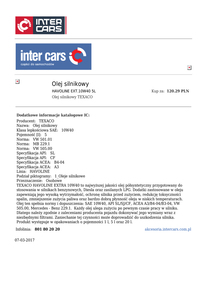 Olej silnikowy HAVOLINE EXT.10W40 5L Kup za: 120.29 PLN Olej silnikowy TEXACO Dodatkowe informacje katalogowe IC: Producent: TEXACO Nazwa: Olej silnikowy Klasa lepkościowa SAE: 10W40 Pojemność [l]: 5 Norma: VW 501.01 Norma: MB 229.1 Norma: VW 505.00 Specyfikacja API: SL Specyfikacja API: CF Specyfikacja ACEA: B4-04 Specyfikacja ACEA: A3 Linia: HAVOLINE Podział piktogramy: 1_Oleje silnikowe Przeznaczenie: Osobowe TEXACO HAVOLINE EXTRA 10W40 to najwyższej jakości olej półsyntetyczny przygotowany do stosowania w silnikach benzynowych, Diesla oraz zasilanych LPG. Dodatki zastosowane w oleju zapewniają jego wysoką wytrzymałość, ochronę silnika przed zużyciem, redukcję toksyczności spalin, zmniejszenie zużycia paliwa oraz bardzo dobrą płynność oleju w niskich temperaturach. Olej ten spełnia normy i dopuszczenia: SAE 10W40, API SL/SJ/CF, ACEA A3/B4-04/B3-04, VW 505.00, Mercedes - Benz 229.1. Każdy olej ulega zużyciu po pewnym czasie pracy w silniku. Dlatego należy zgodnie z zaleceniami producenta pojazdu dokonywać jego wymiany wraz z niezbędnymi filtrami. Zaniechanie tej czynności może doprowadzić do uszkodzenia silnika. Produkt występuje w opakowaniach o pojemności 1 l, 5 l oraz 20 l. Infolinia: 801 80 20 20 07-03-2017 akcesoria.intercars.com.pl